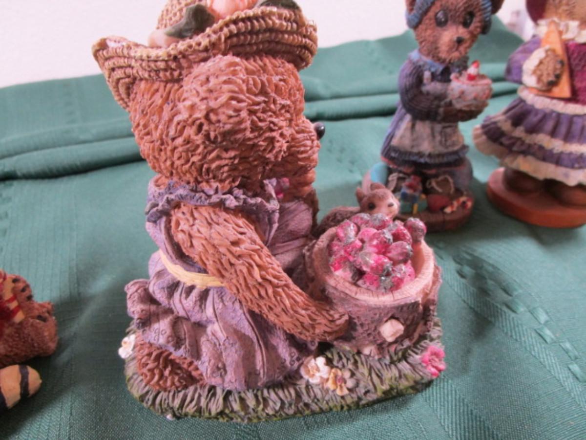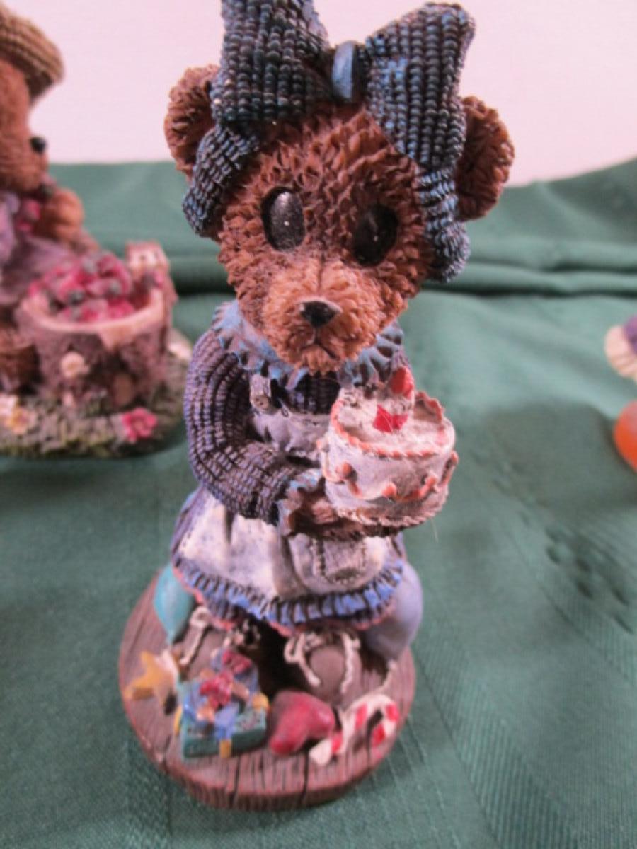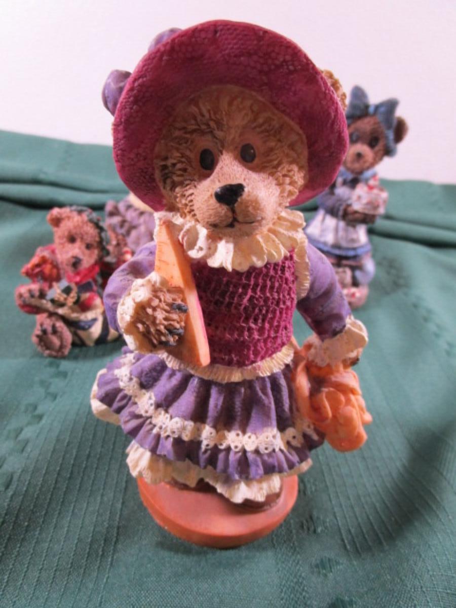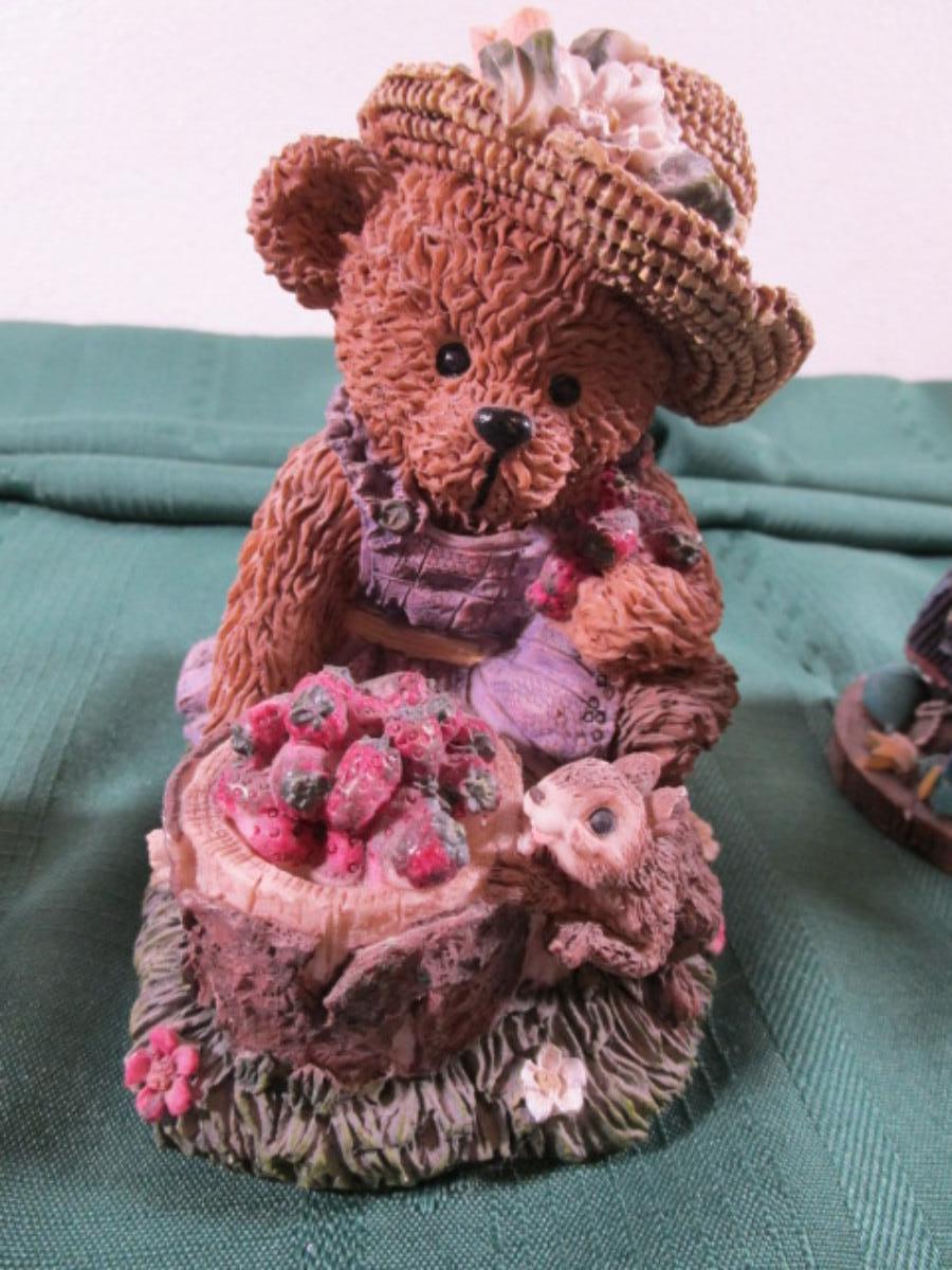 Christmas bear is 2-1/2" tall; school bear is 5-1/2" tall; bear with berries 6" tall; Birthday cake bear is 5" tall
