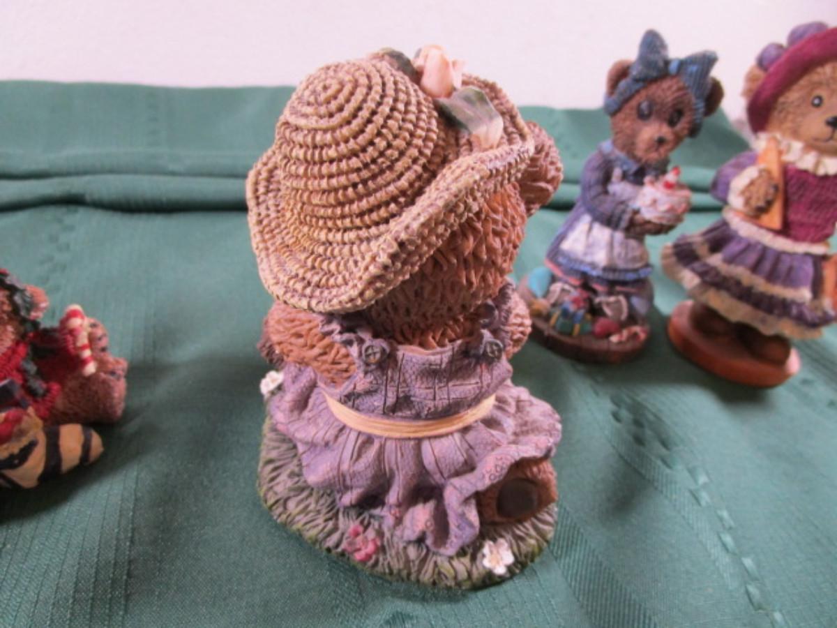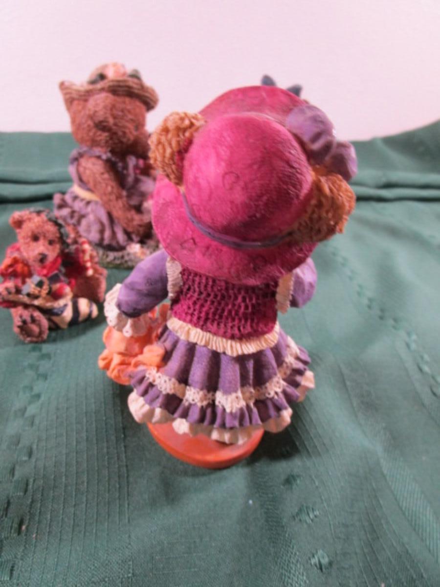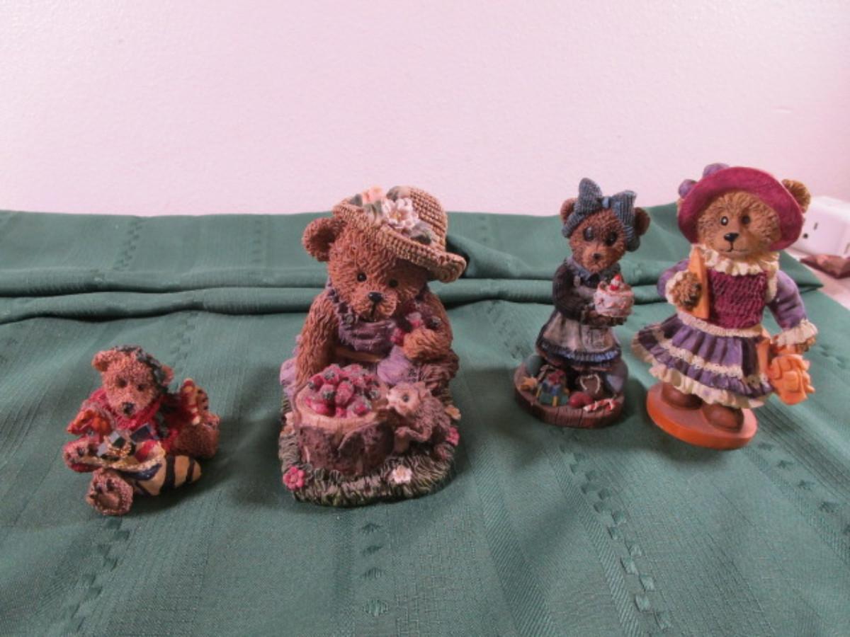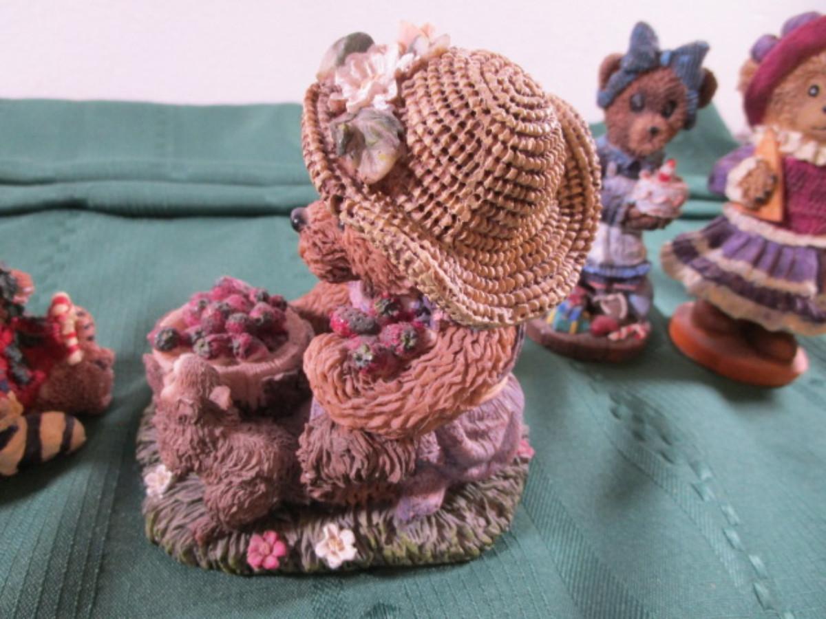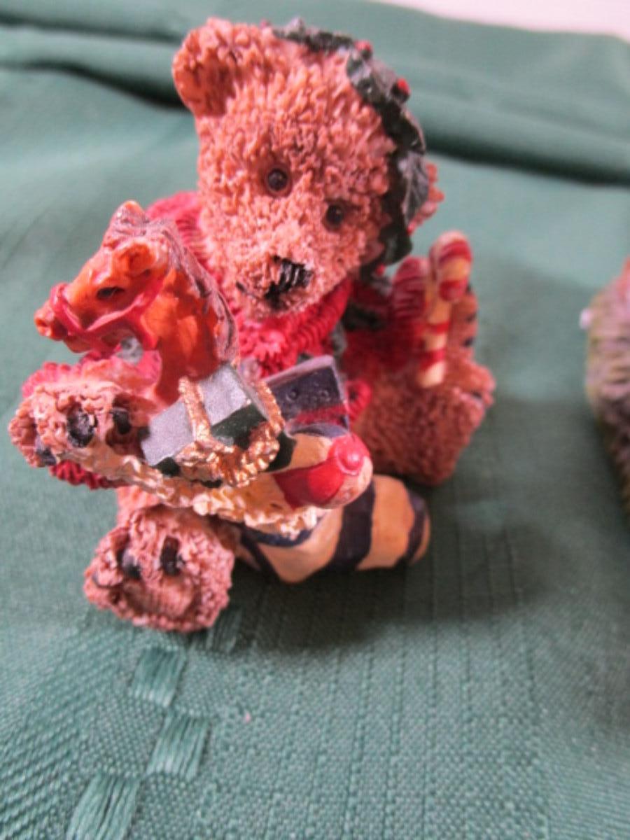 Christmas bear is 2-1/2" tall; school bear is 5-1/2" tall; bear with berries 6" tall; Birthday cake bear is 5" tall