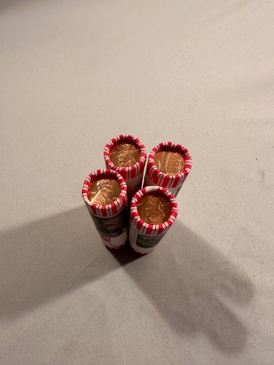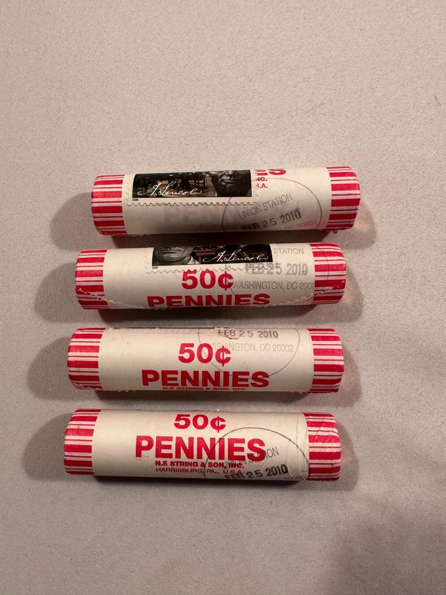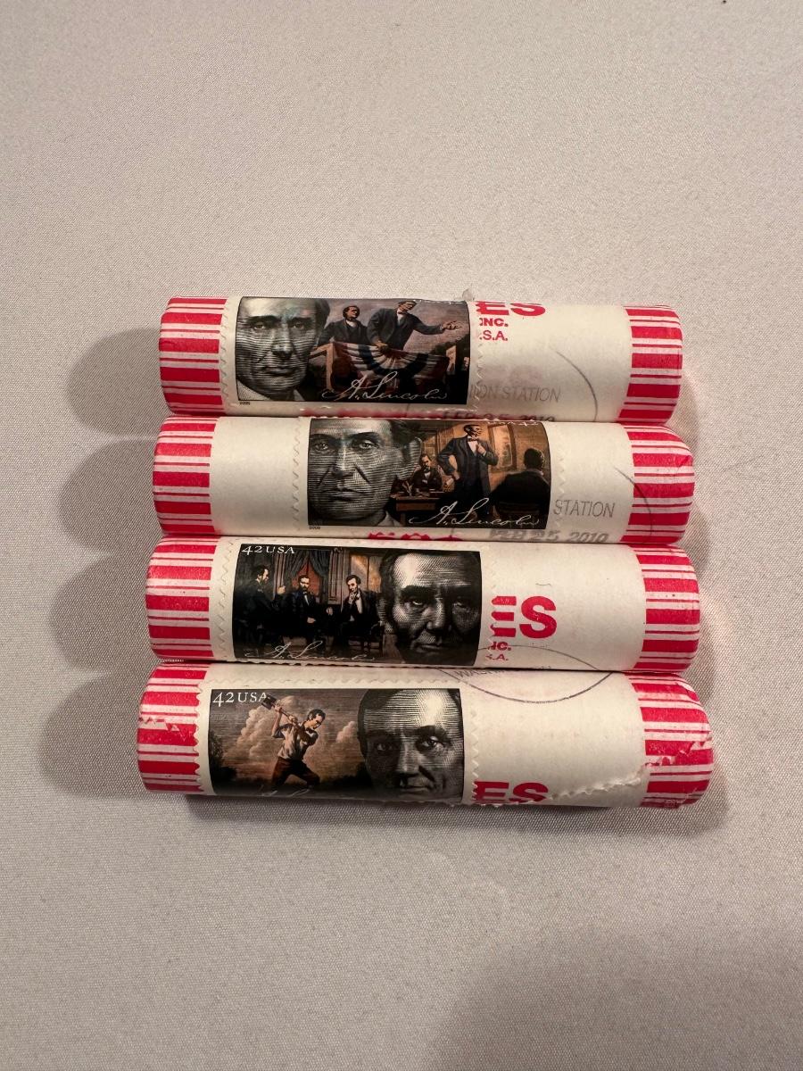 4 ROLLS OF 2010 PENNIES AND 4 DIFFERENT ABRAHAM LINCOLN STAMPS