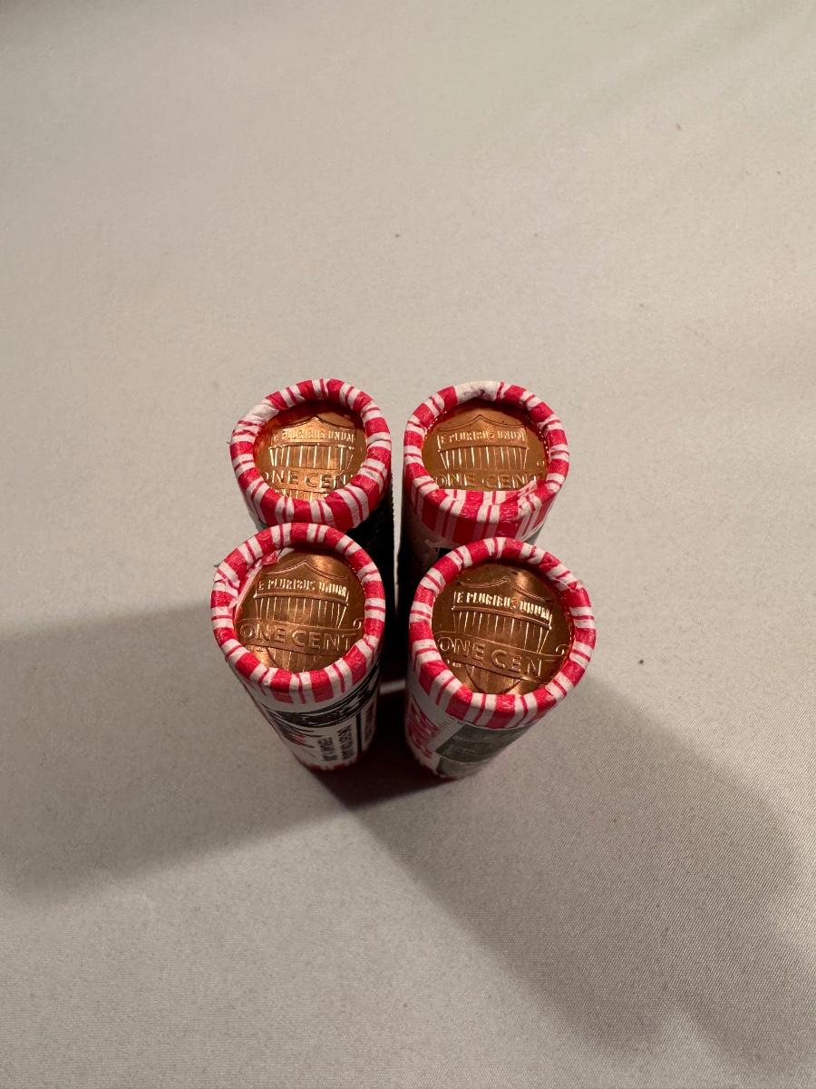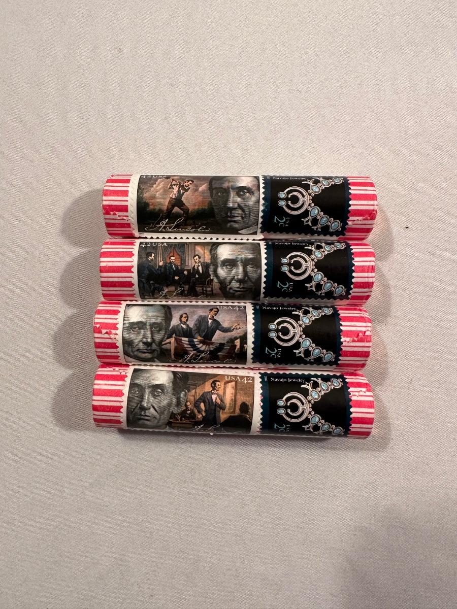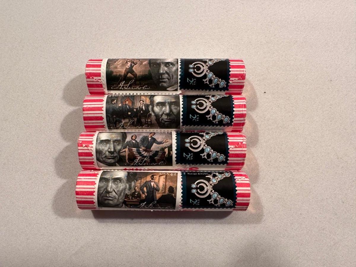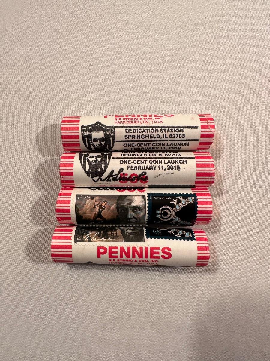 4 ROLLS OF 2010 PHILADELPHIA MINT MARK PENNIES WITH 4 DIFFERENT ABRAHAM LINCOLN STAMPS