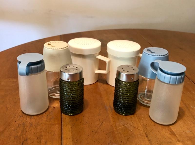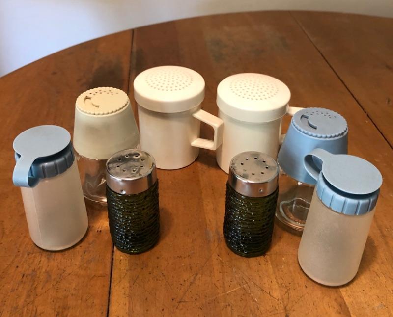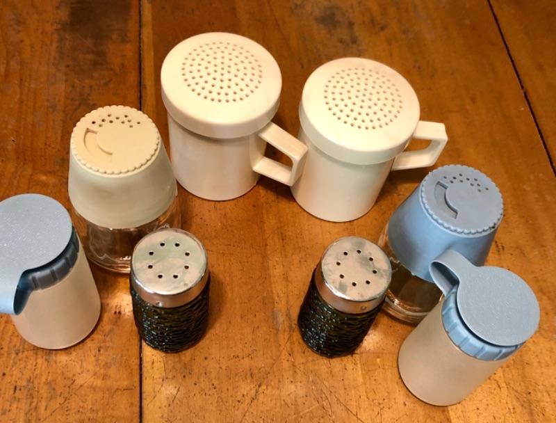 Great mix of salt and pepper shakers. 4 different sets. Good Condition. The glass ones in front are olive green.