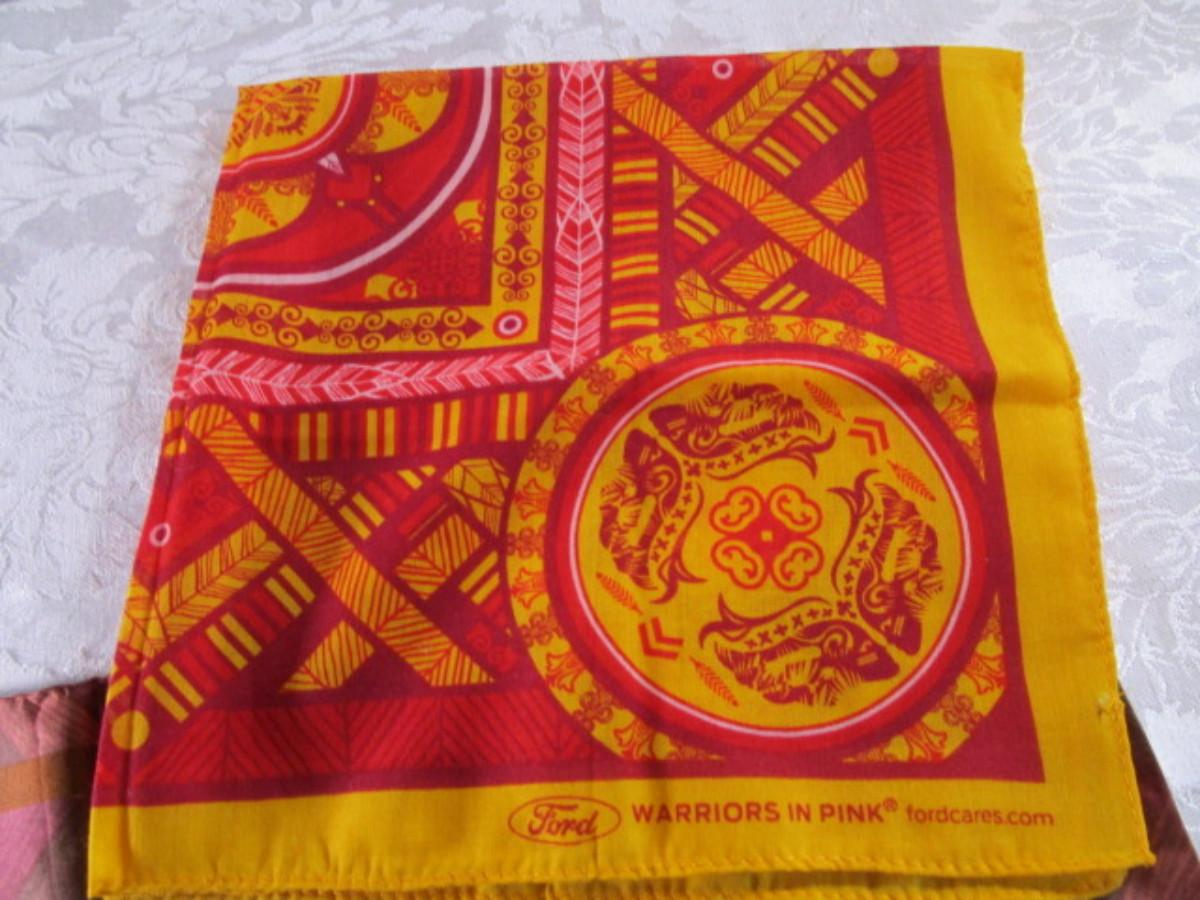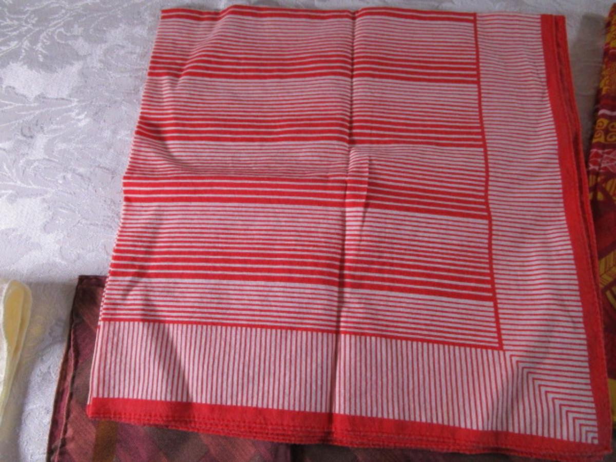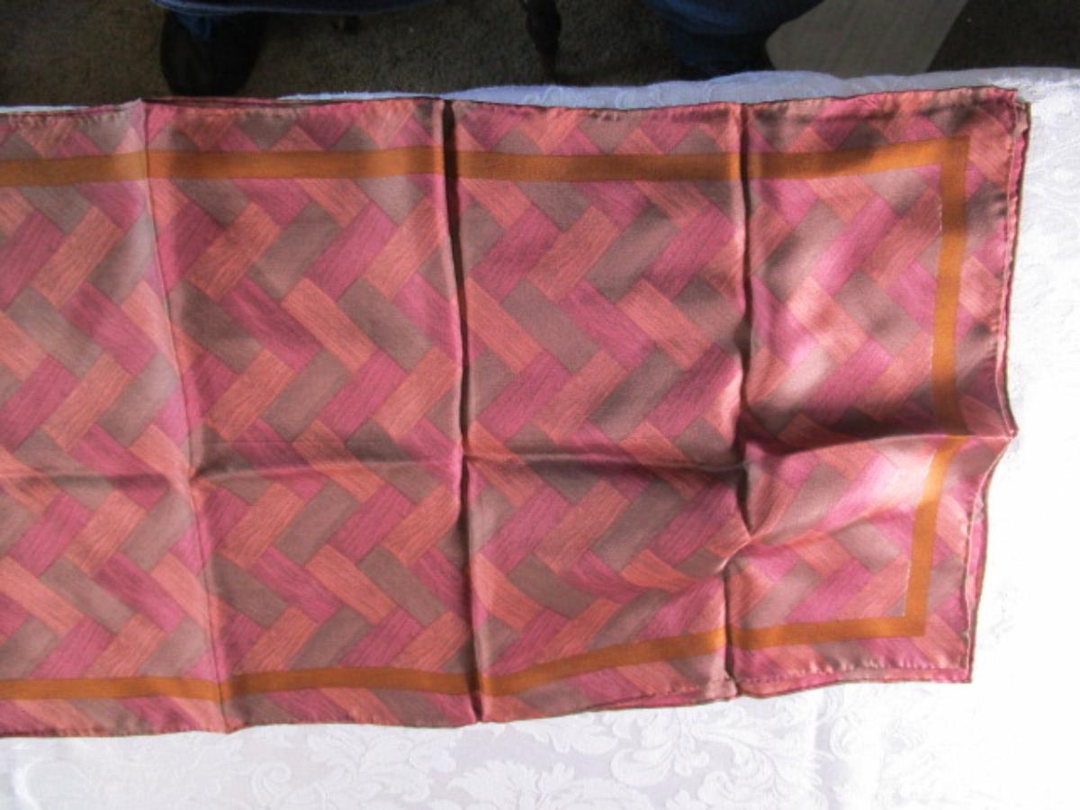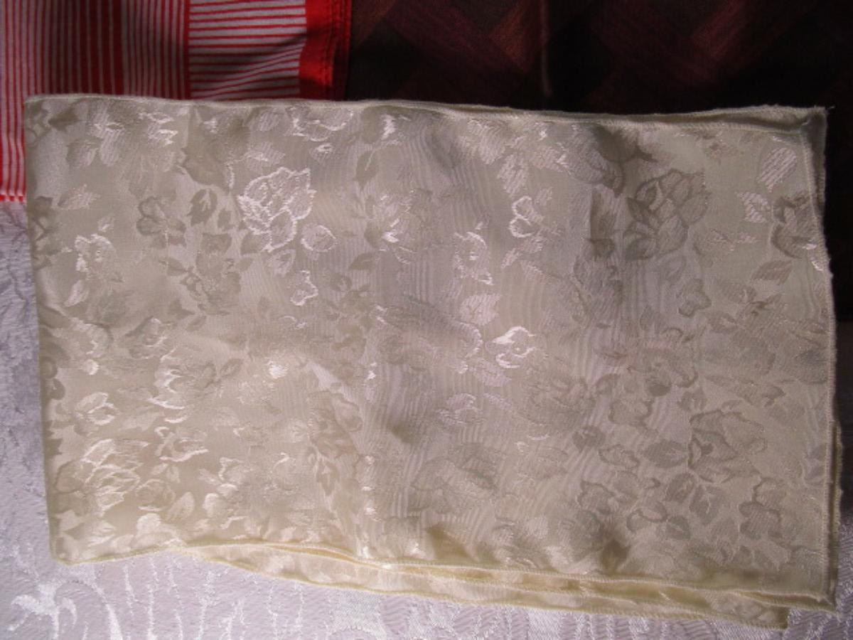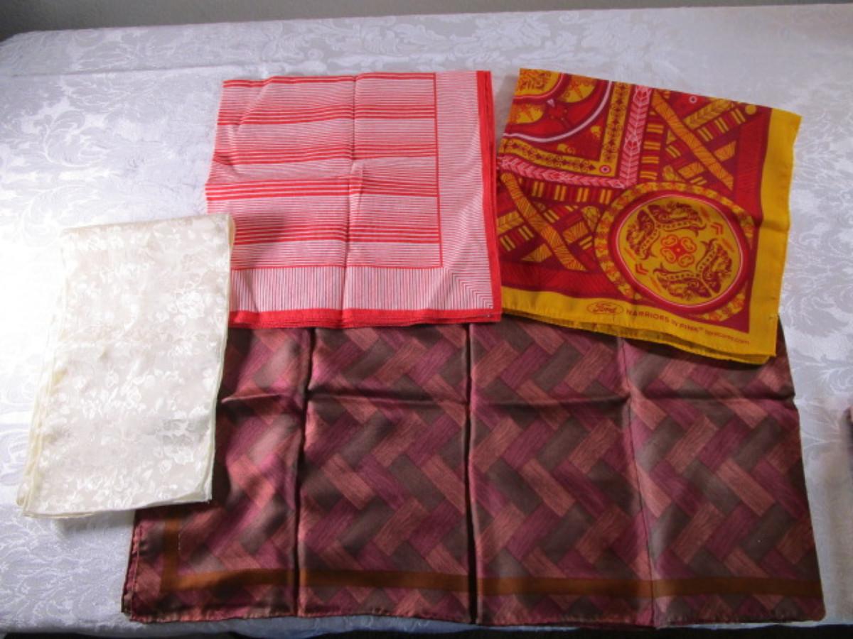 brocade 6" x 42"; red/white cotton 21-1/2" x 22"; Ford warriors in pink 21-1/4" x 20-7/8"; brown/mauve 12-1/2" x 43"
