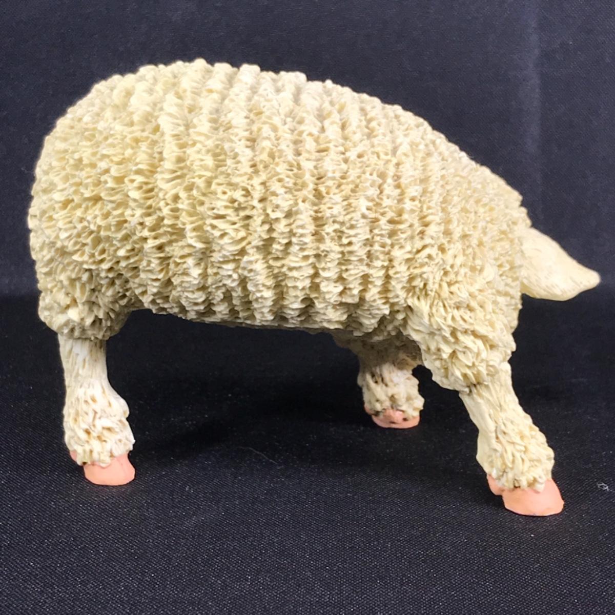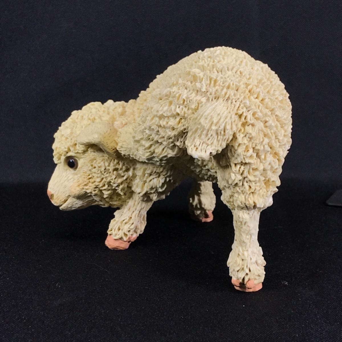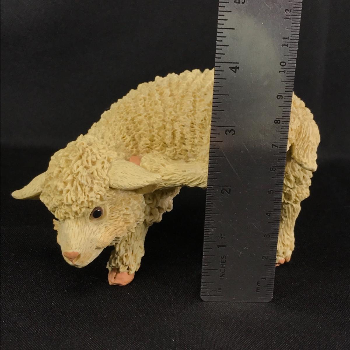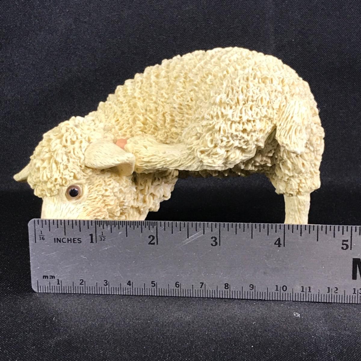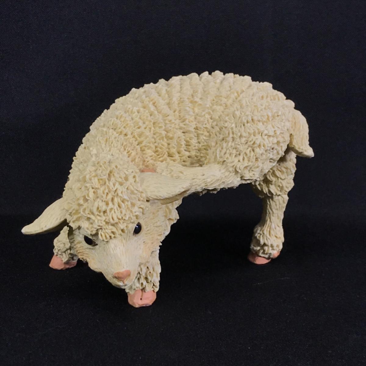 A scratching sheep figurine that is made of resin and in good condition overall. Unmarked; see pictures.