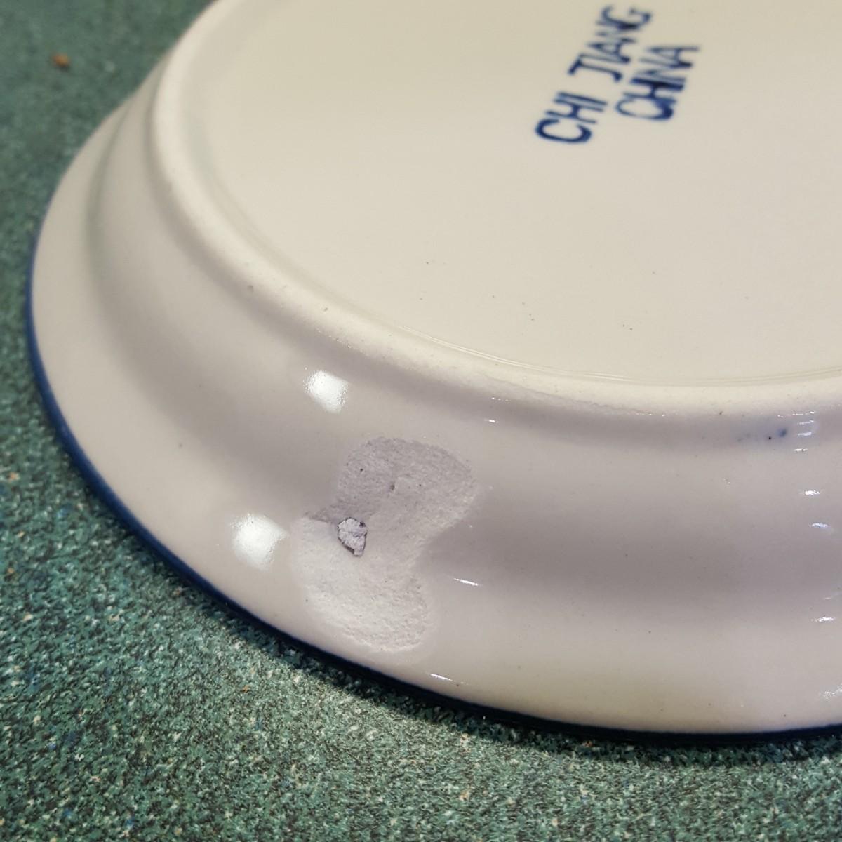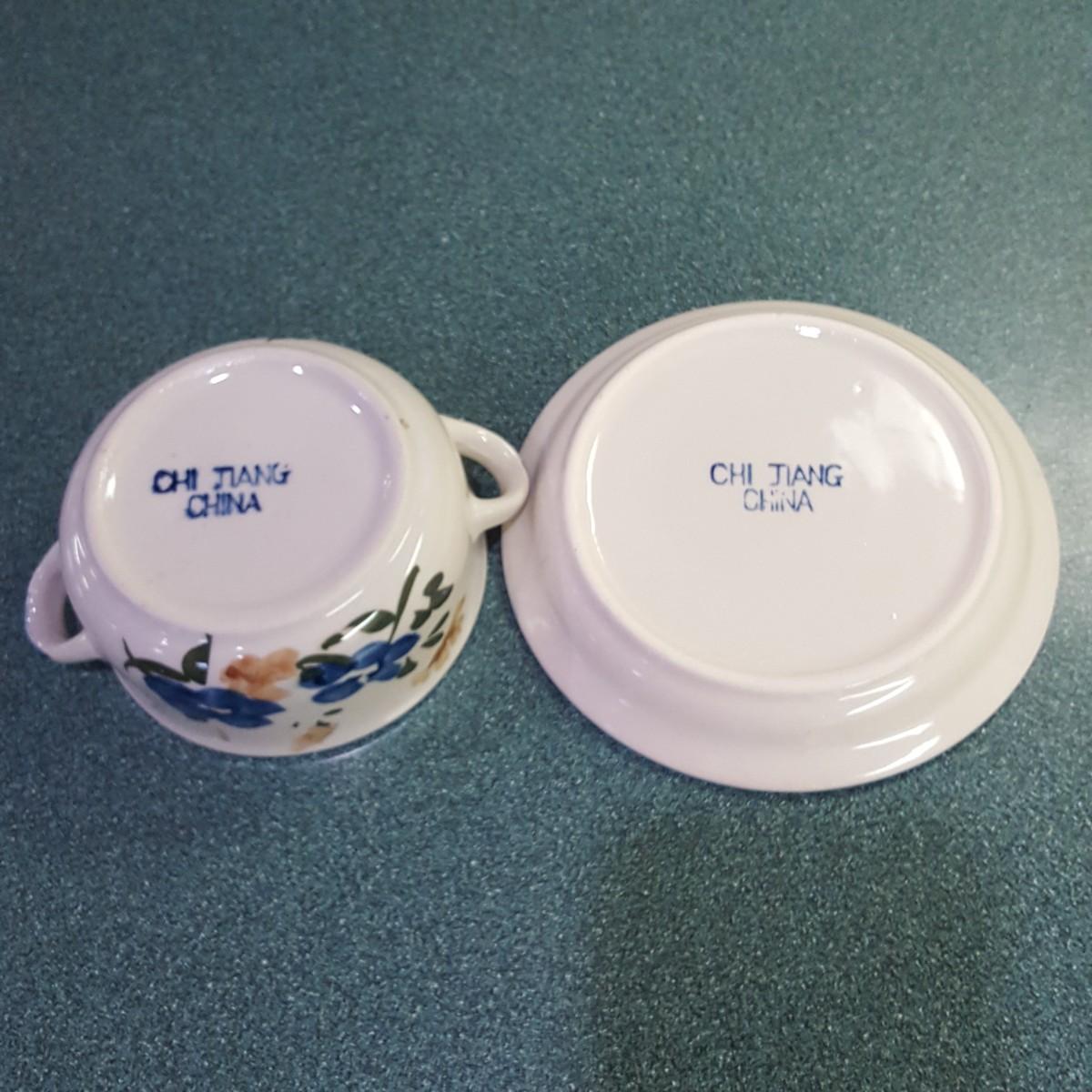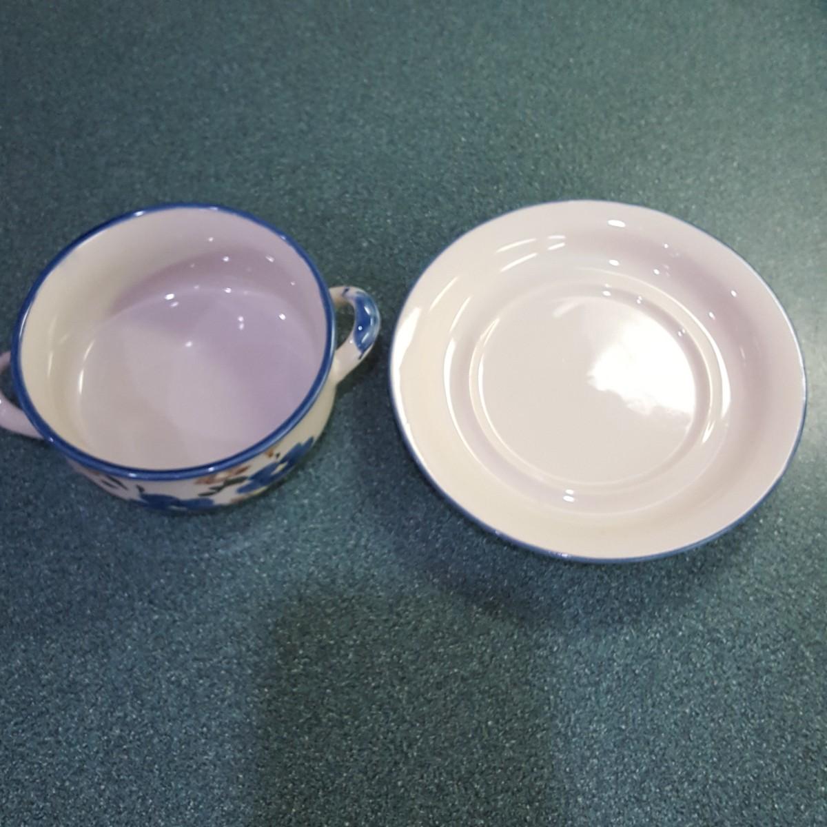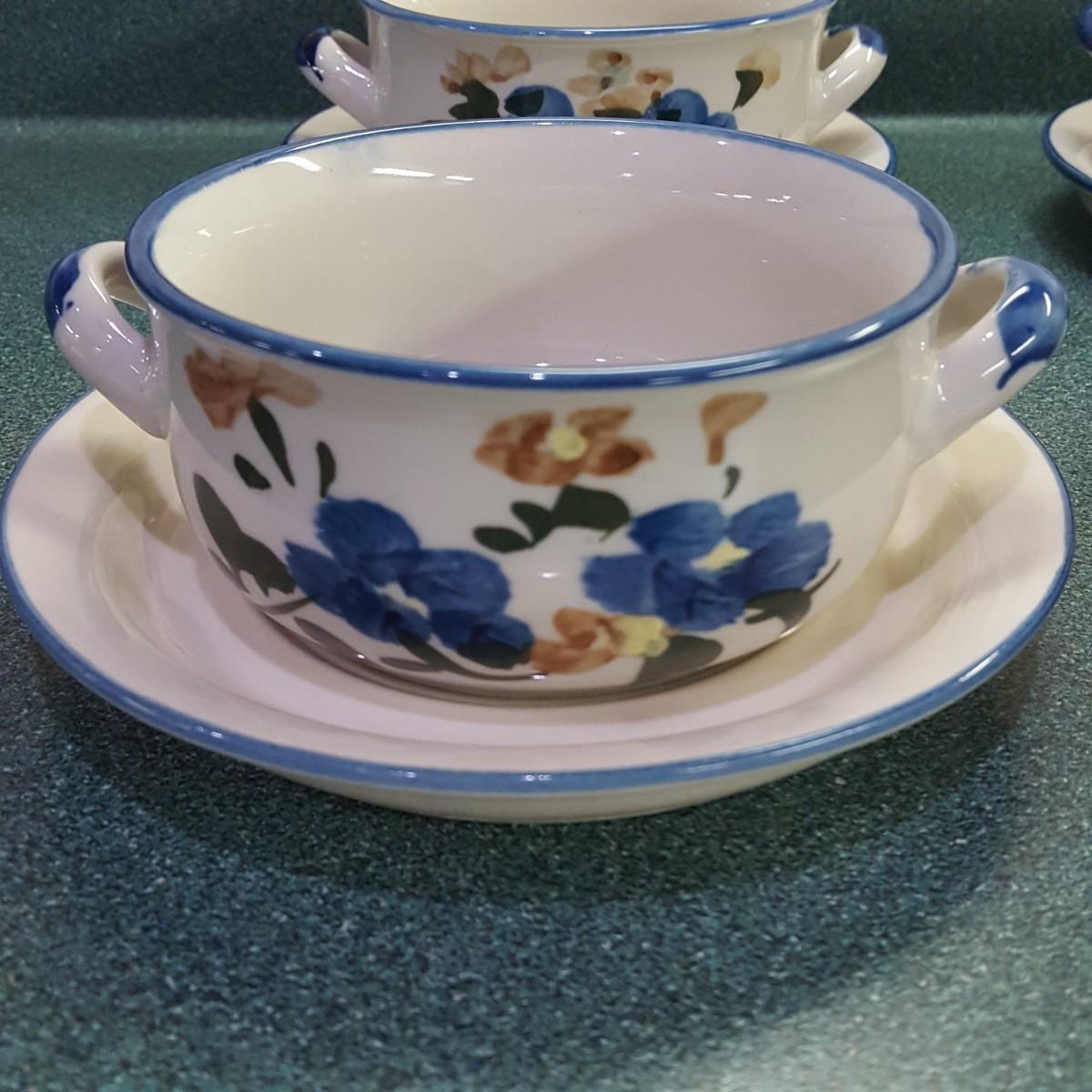 Here is a beautiful set of soup bowls and plates for your kitchen. This set contains four 6"d x 2" soup bowls with a matching blue rim 6" plate. All dishes appear to be in good condition other than one plate (see pictures) has a small chip on the underside of the plate. Local pick up only.