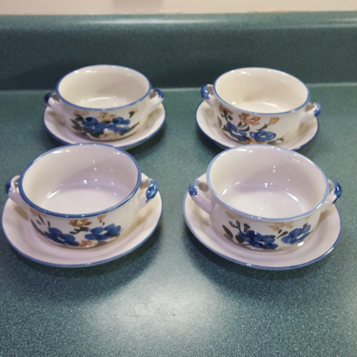 Four Blue Flower Soup Bowls and Plates (K-KD)