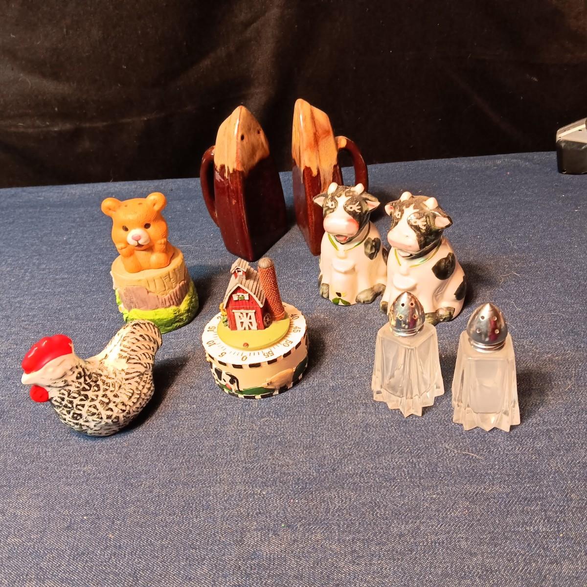 4 SETS OF SALT/PEPPER SHAKERS, MINUTE TIMER AND A SINGLE ROOSTER SHAKER