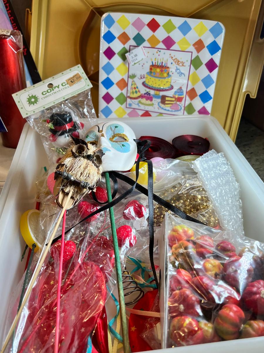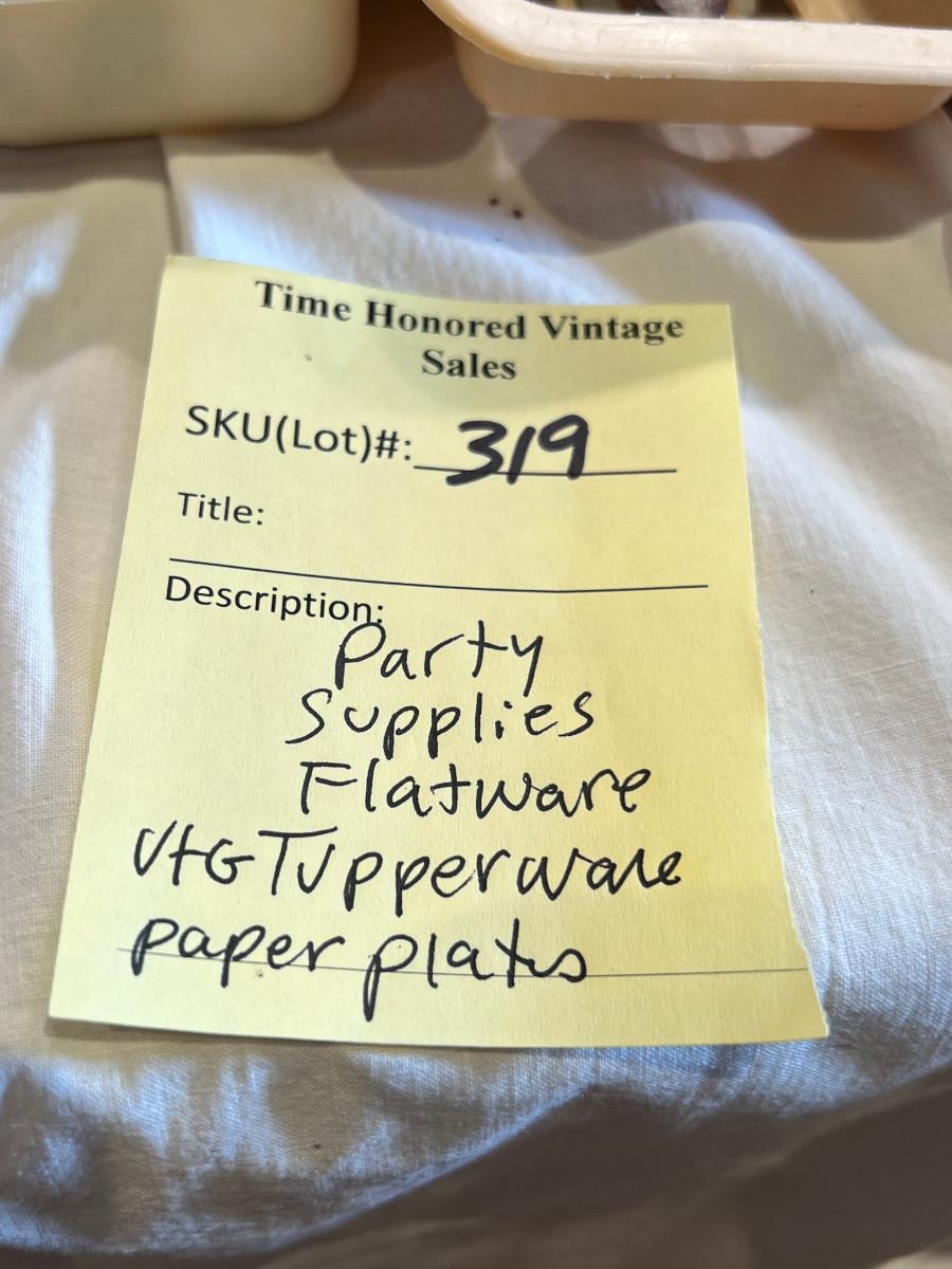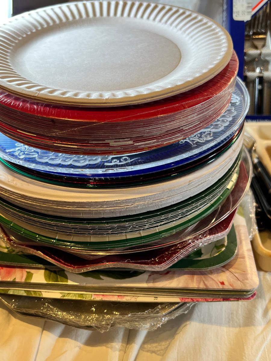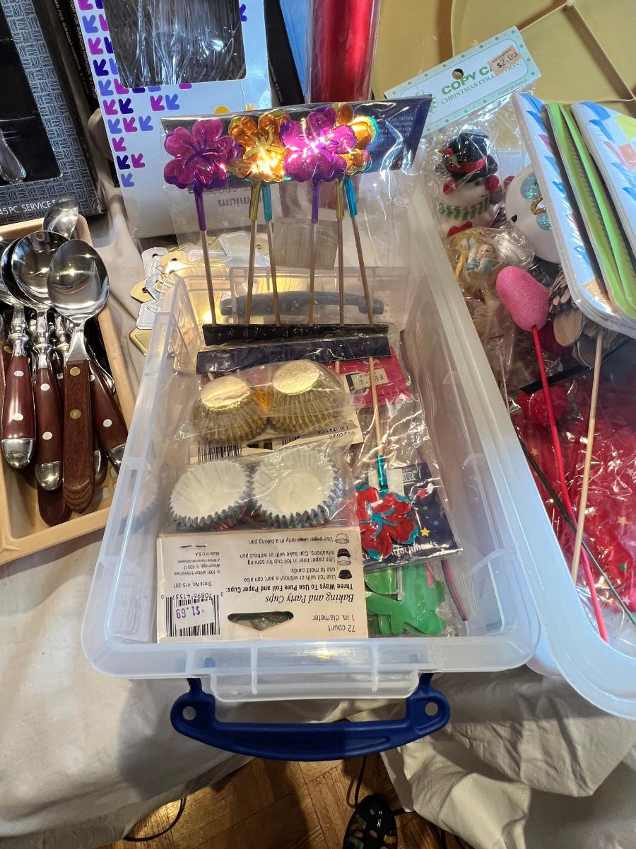 Vintage rectangle Tupperware as new, filled with fun party decor. Huge stack of paper plates