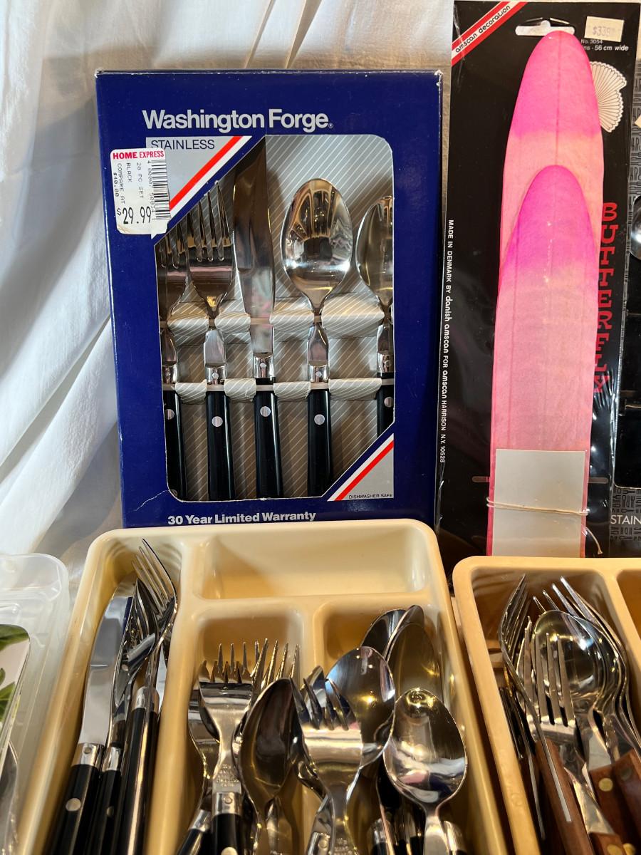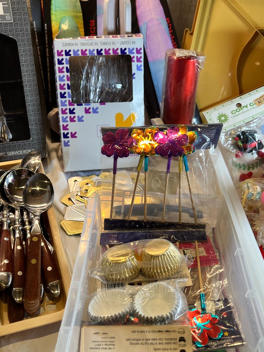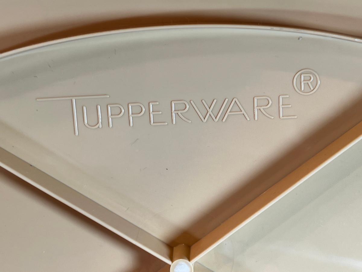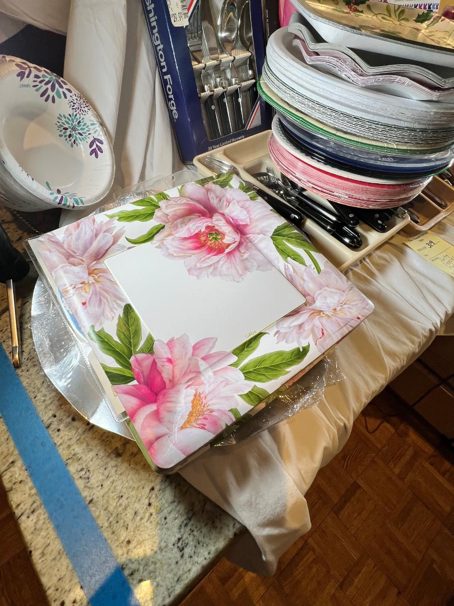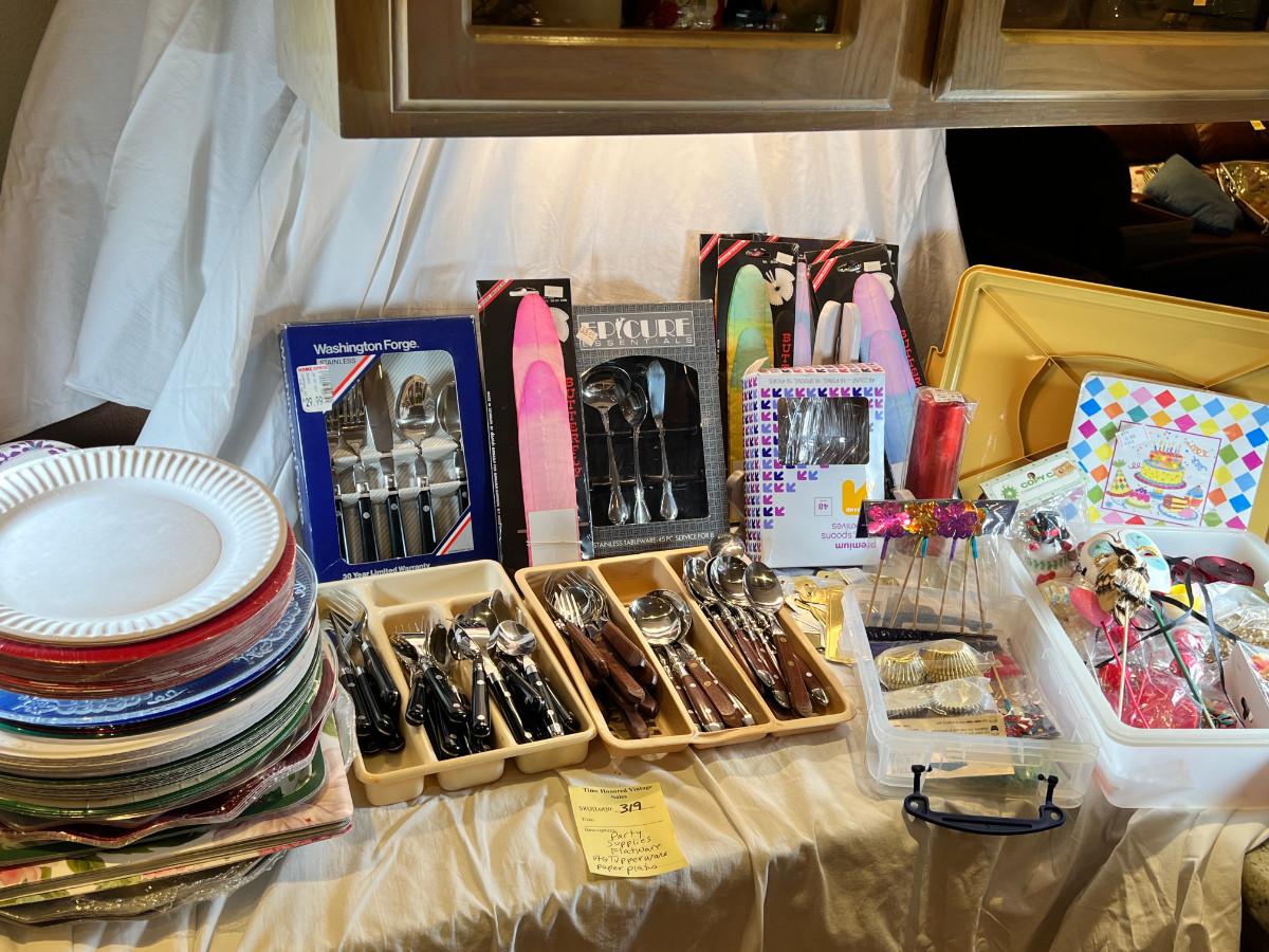 Vintage rectangle Tupperware as new, filled with fun party decor. Huge stack of paper plates