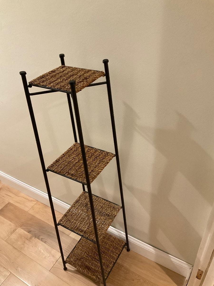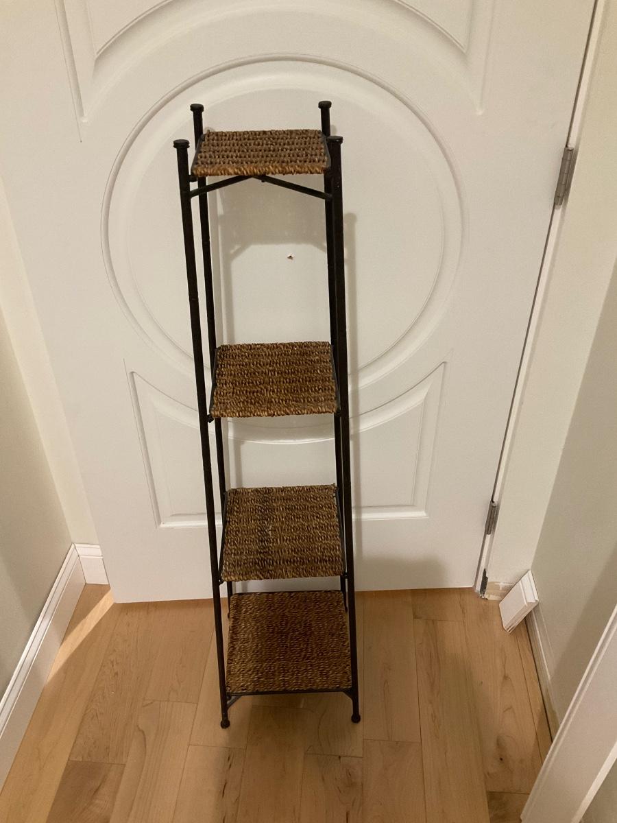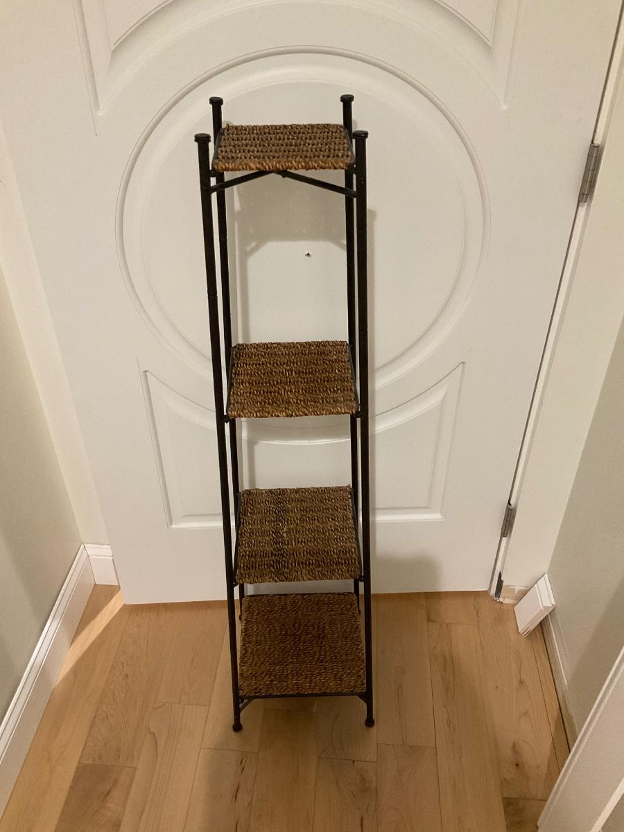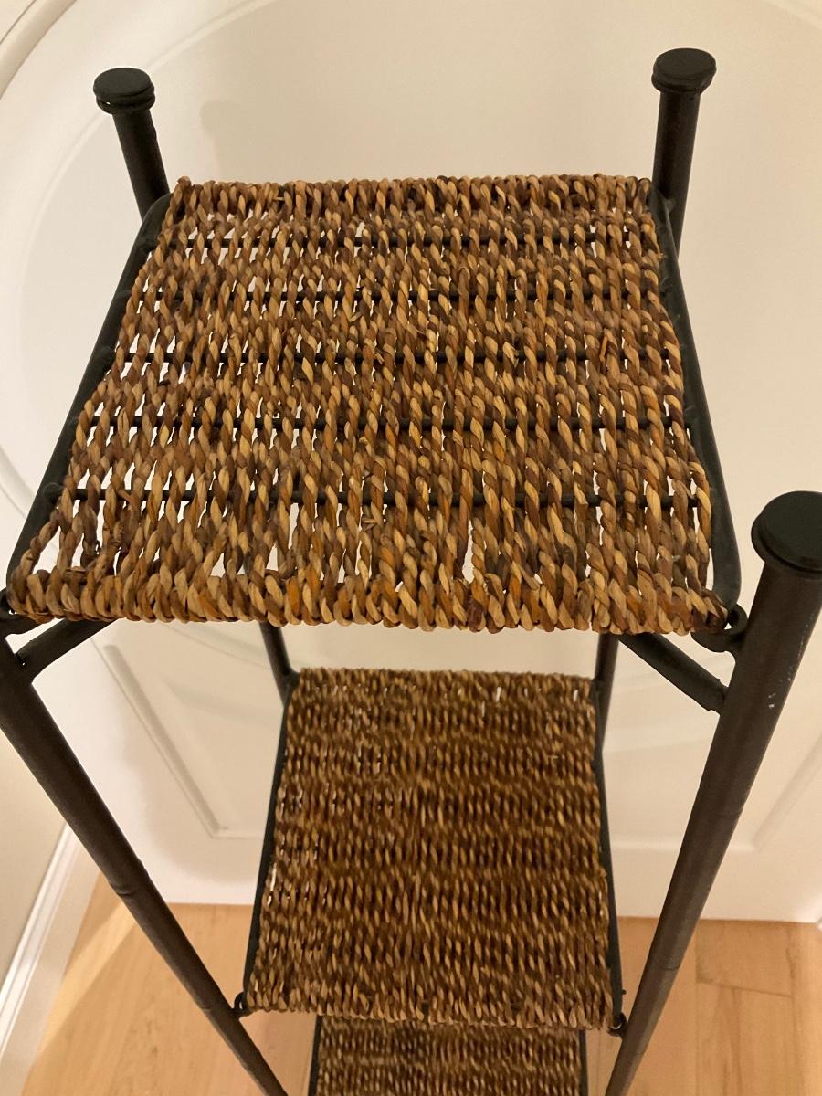 4 ascending shelves made of rattan/wicker with black metal legs and frame make is sturdy