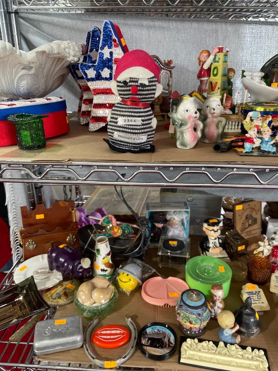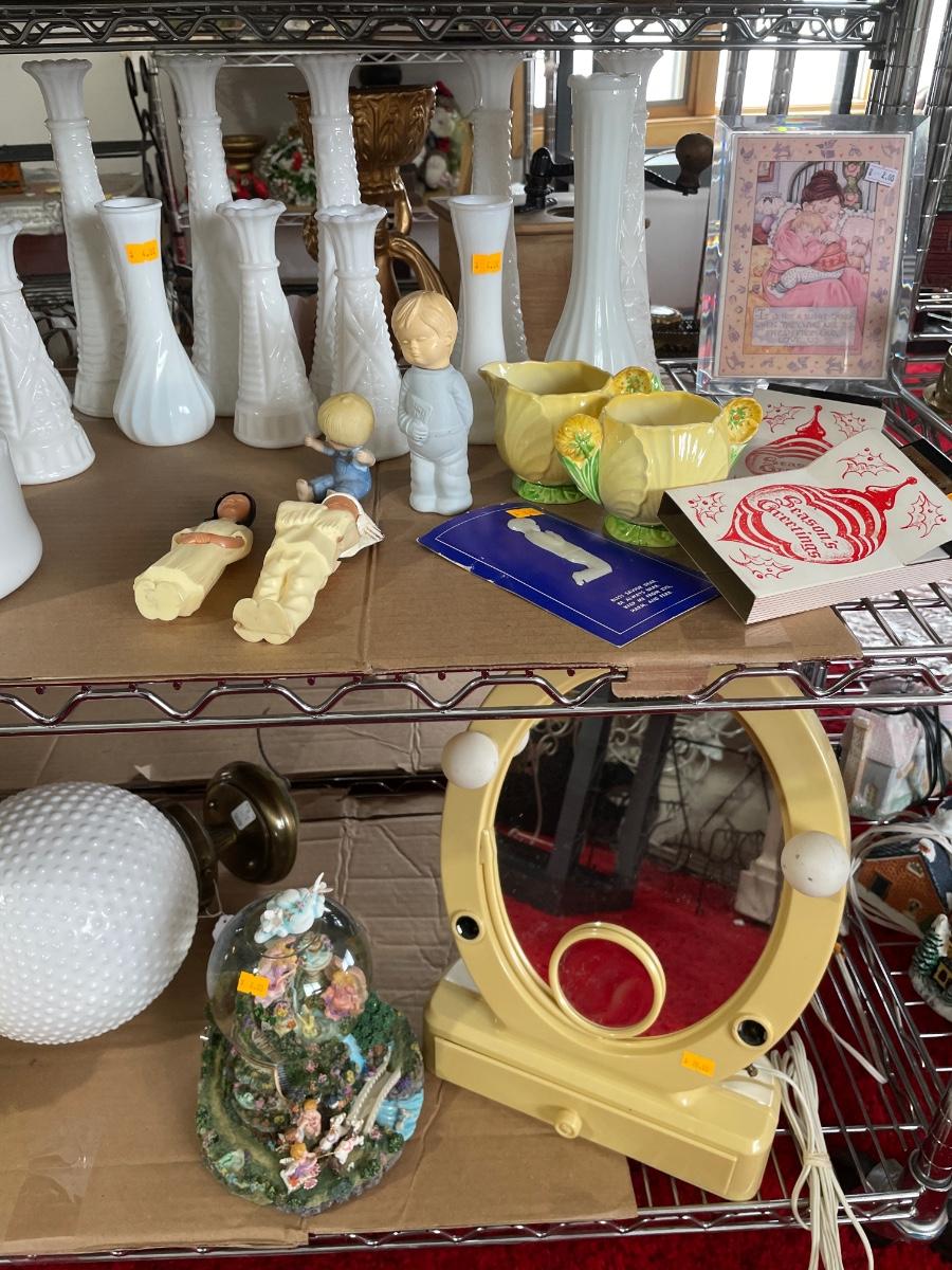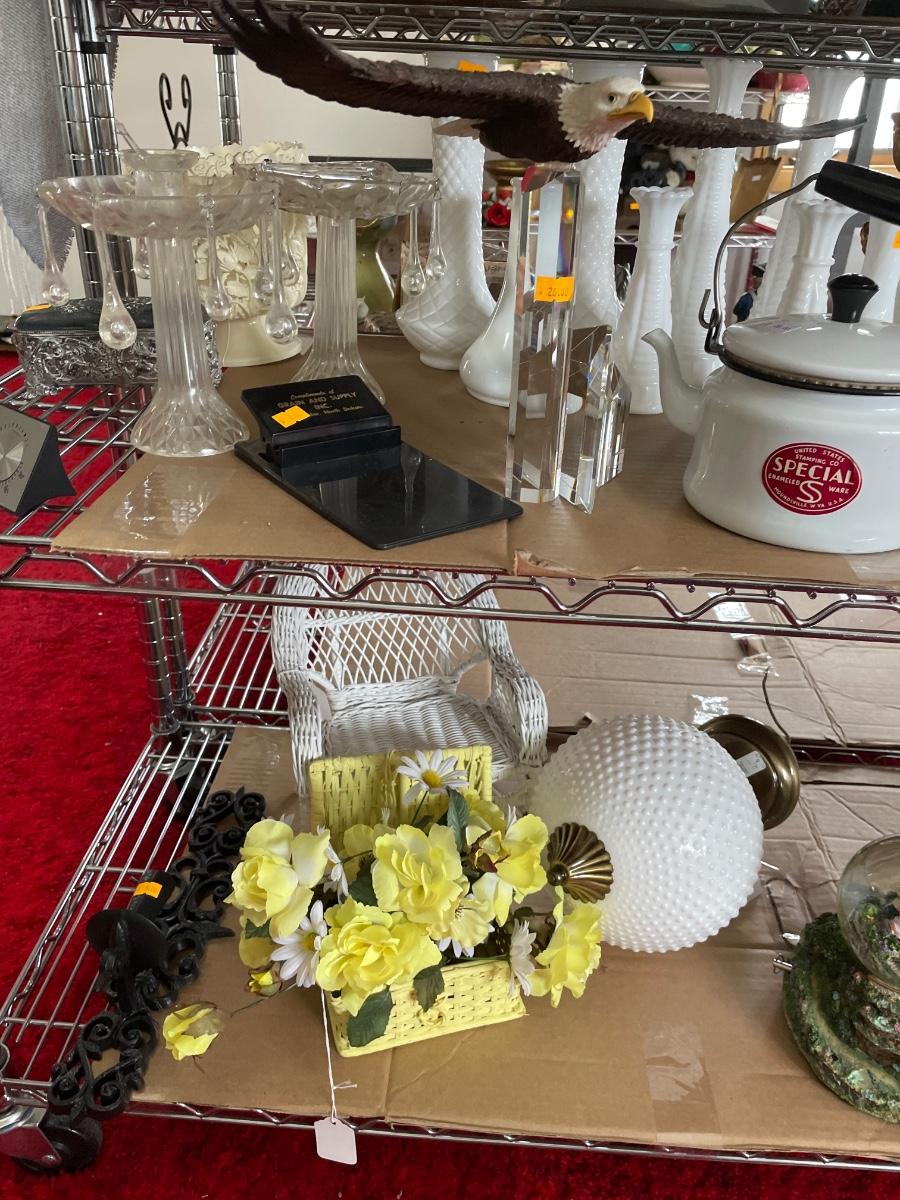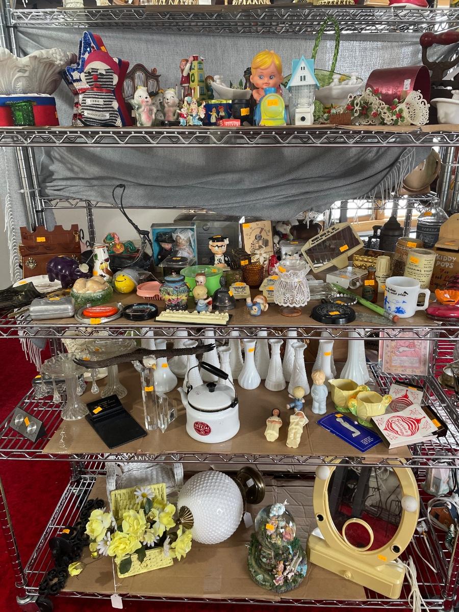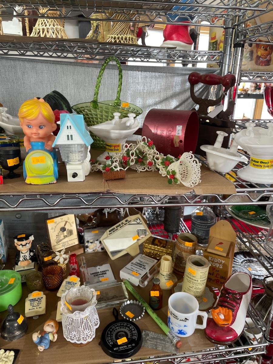 4 shelves of vintage advertising, milk glass & more