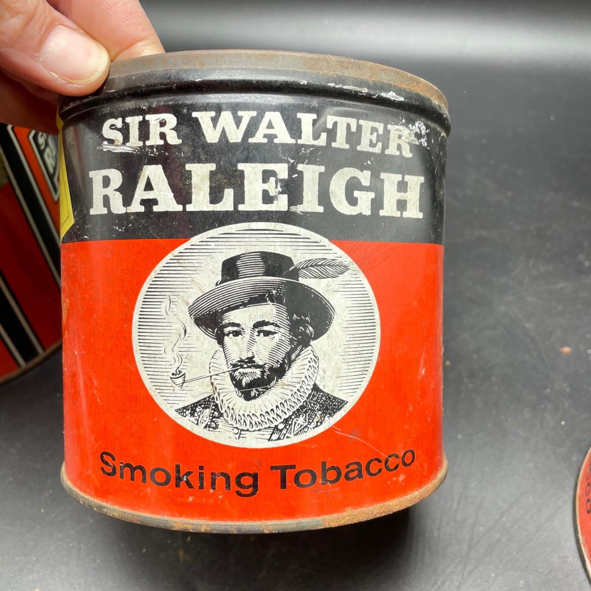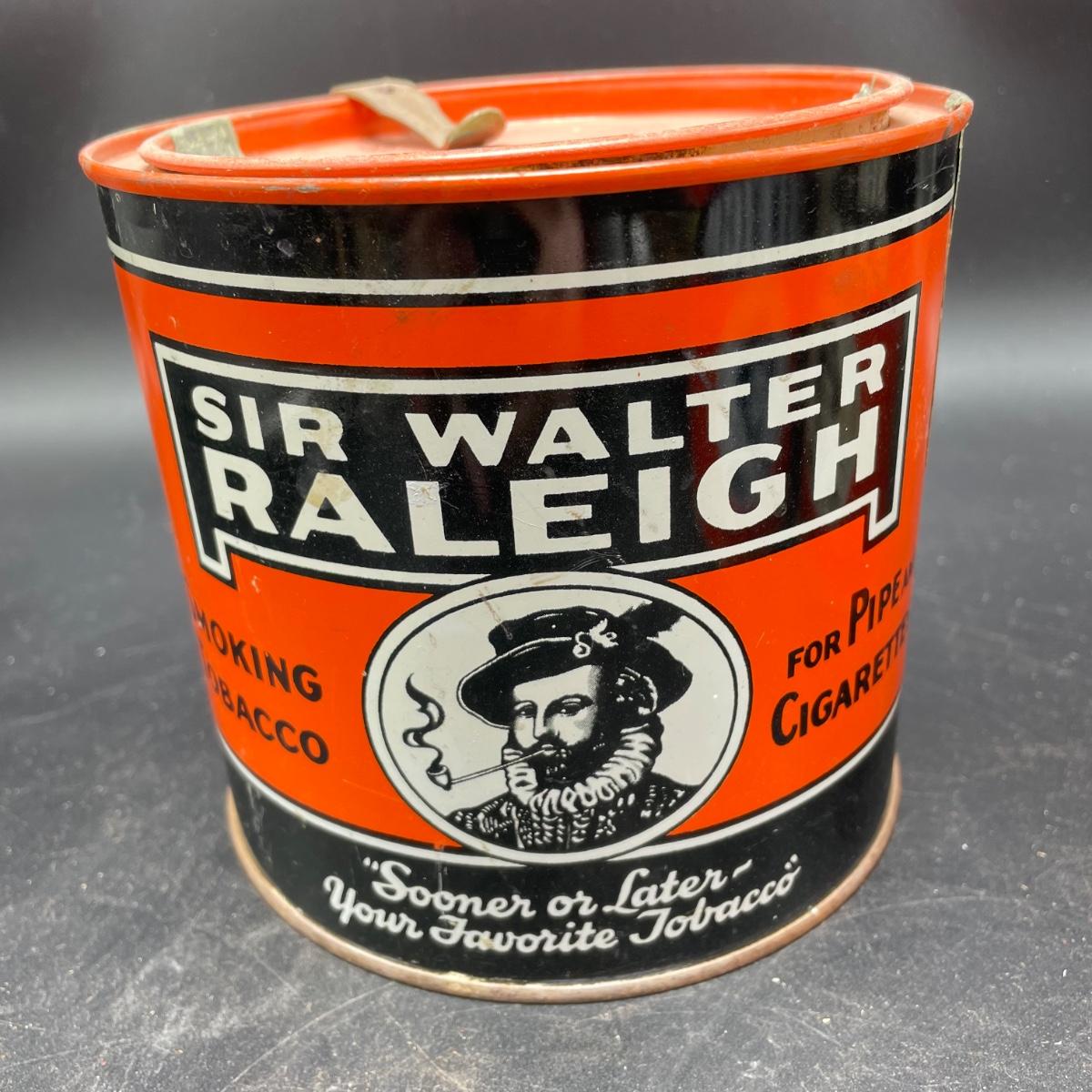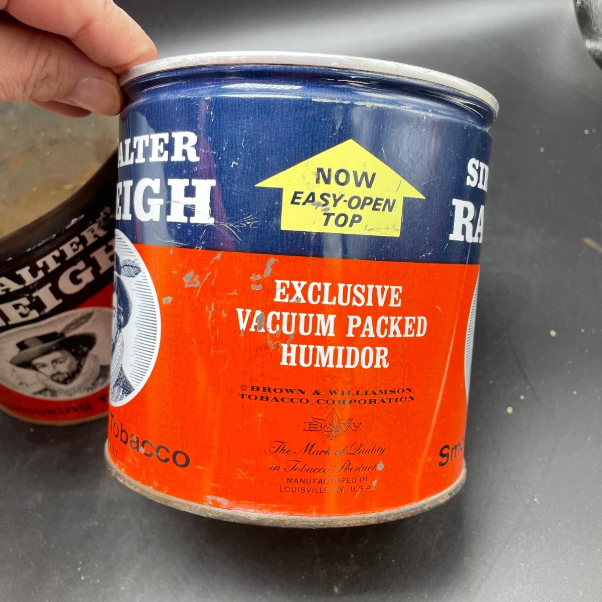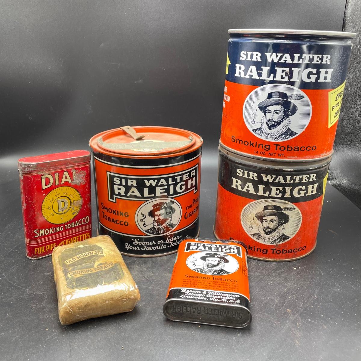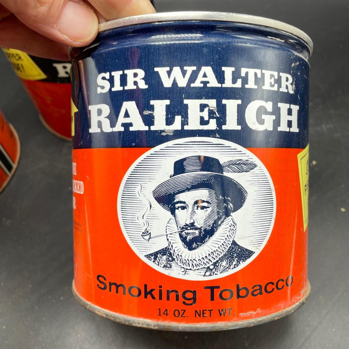 Three 14oz Sir Walter Raleigh tobacco tins, one is currently sealed shut. Lot also features two vertical pocket tins for pipe and cigarettes and a linen style bag with paper seal, wrapped in a cellophane style plastic. All items are marked Louisville, KY. See images. Shipping available.