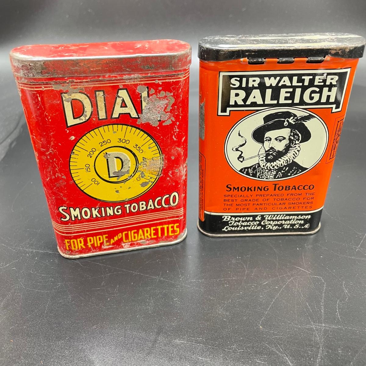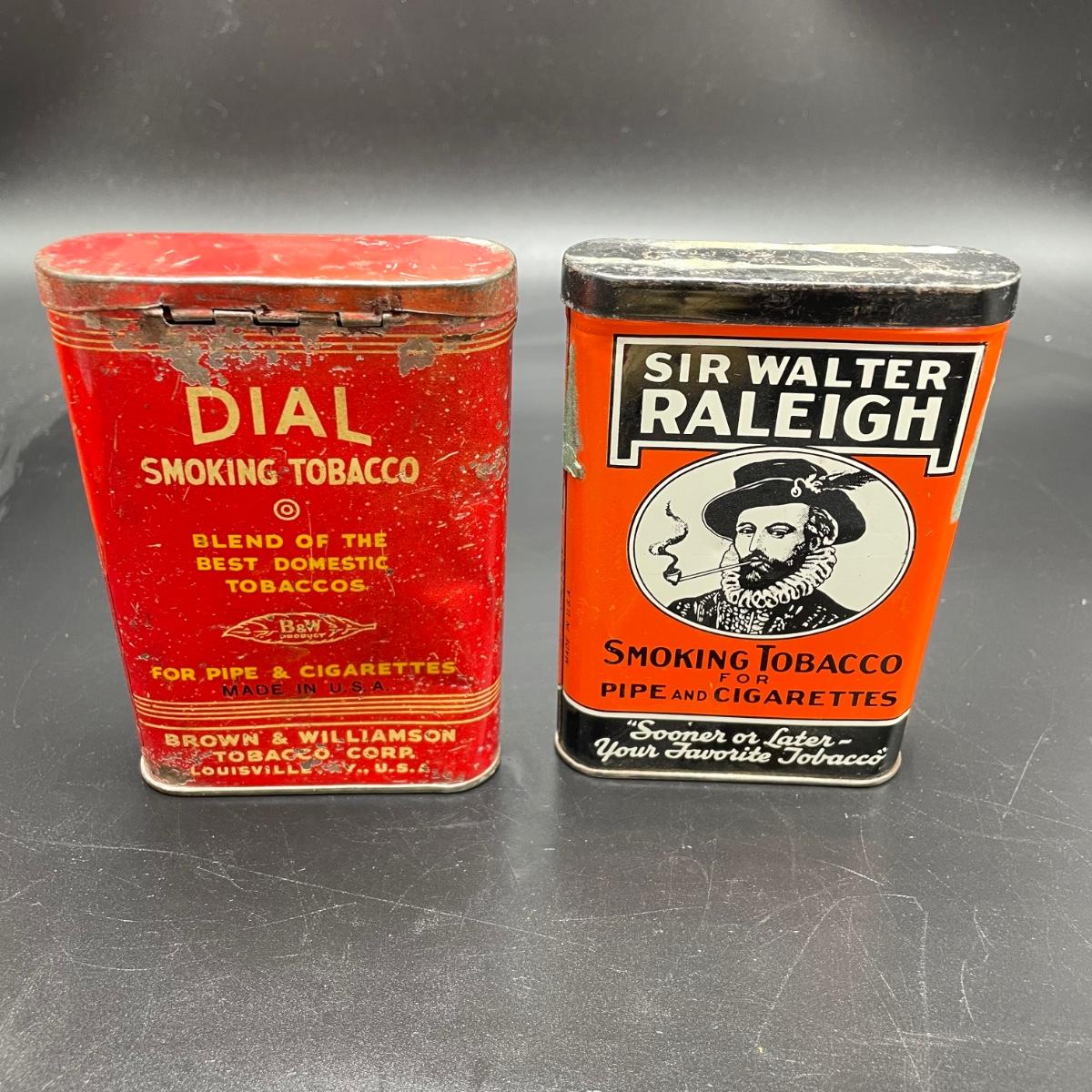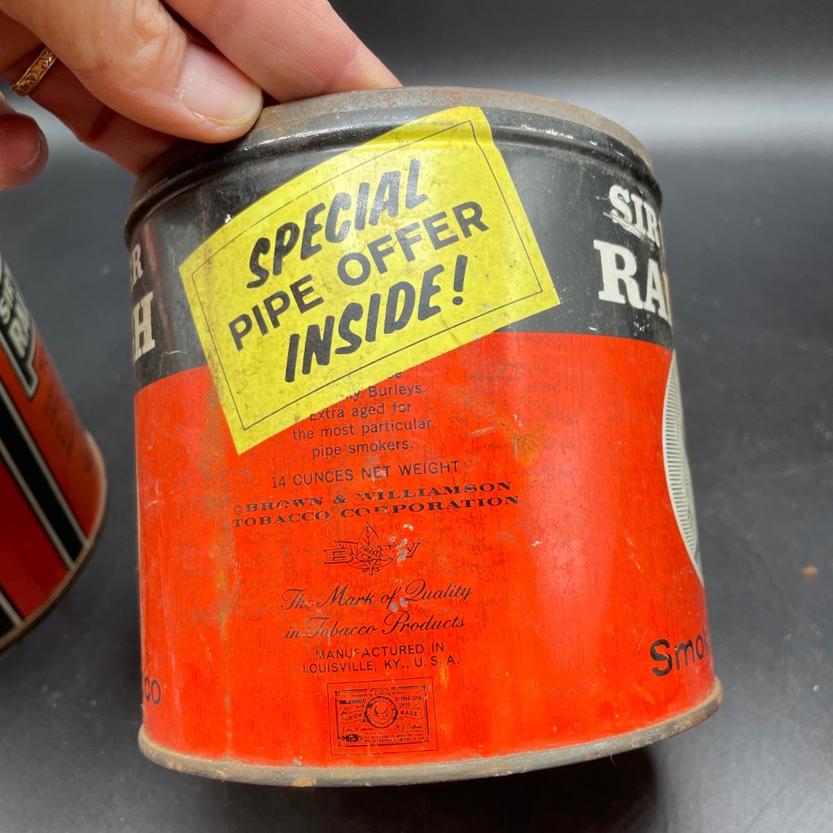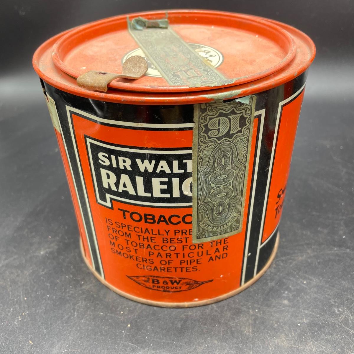 Three 14oz Sir Walter Raleigh tobacco tins, one is currently sealed shut. Lot also features two vertical pocket tins for pipe and cigarettes and a linen style bag with paper seal, wrapped in a cellophane style plastic. All items are marked Louisville, KY. See images. Shipping available.