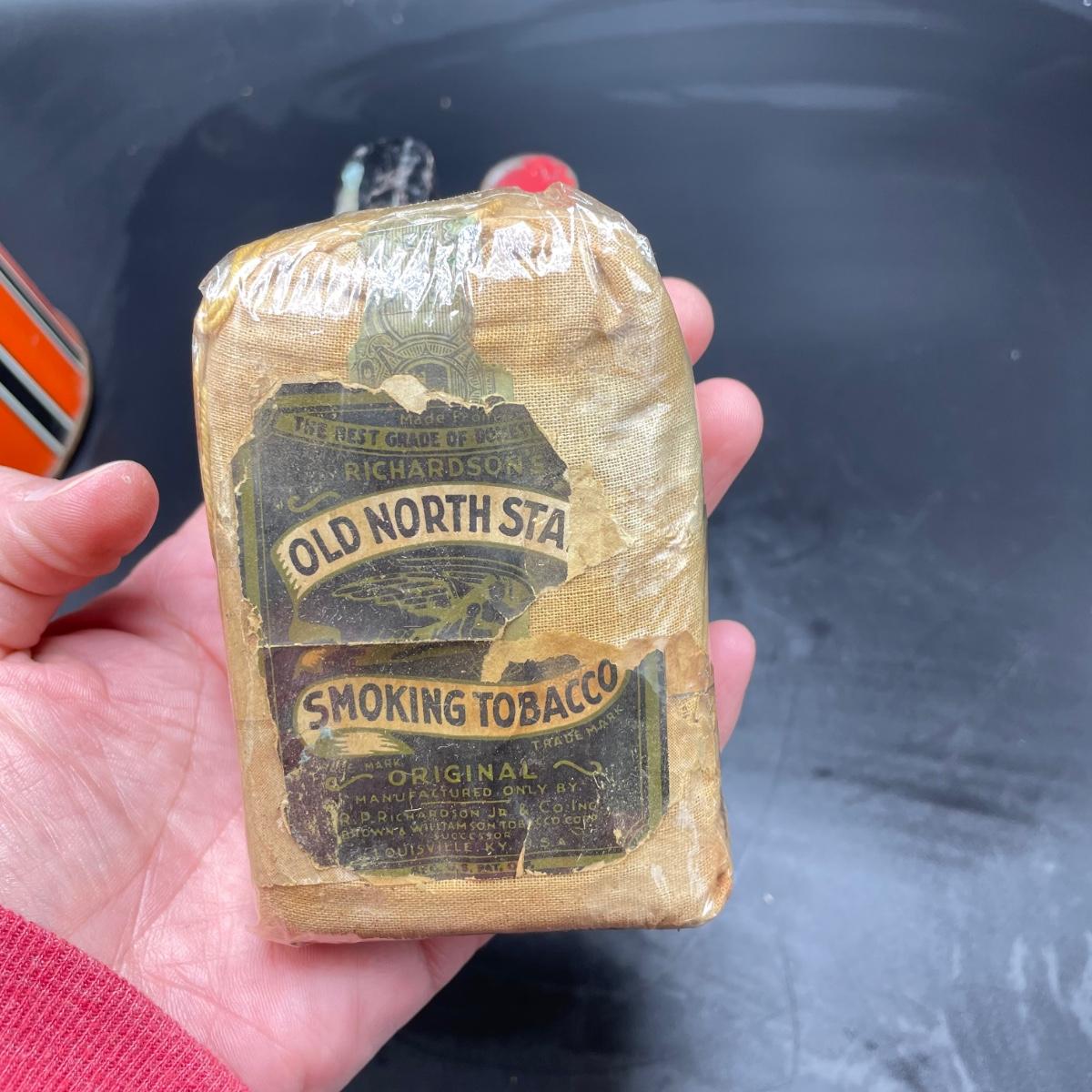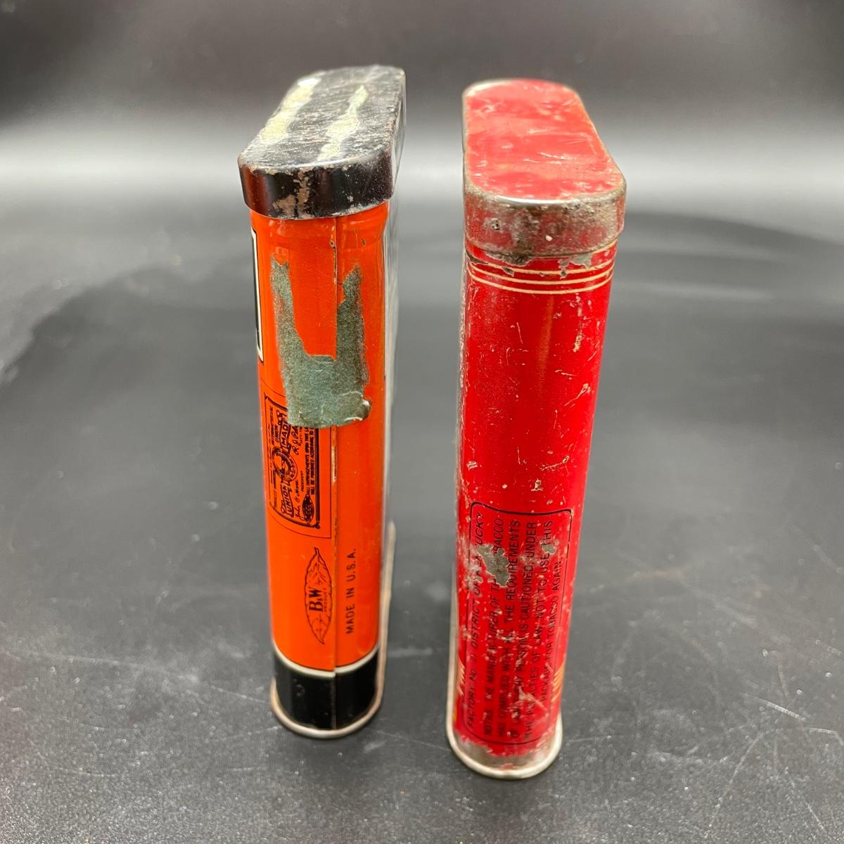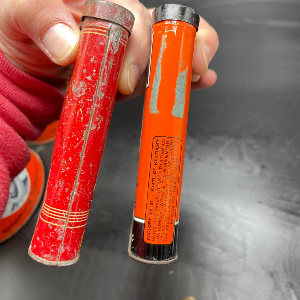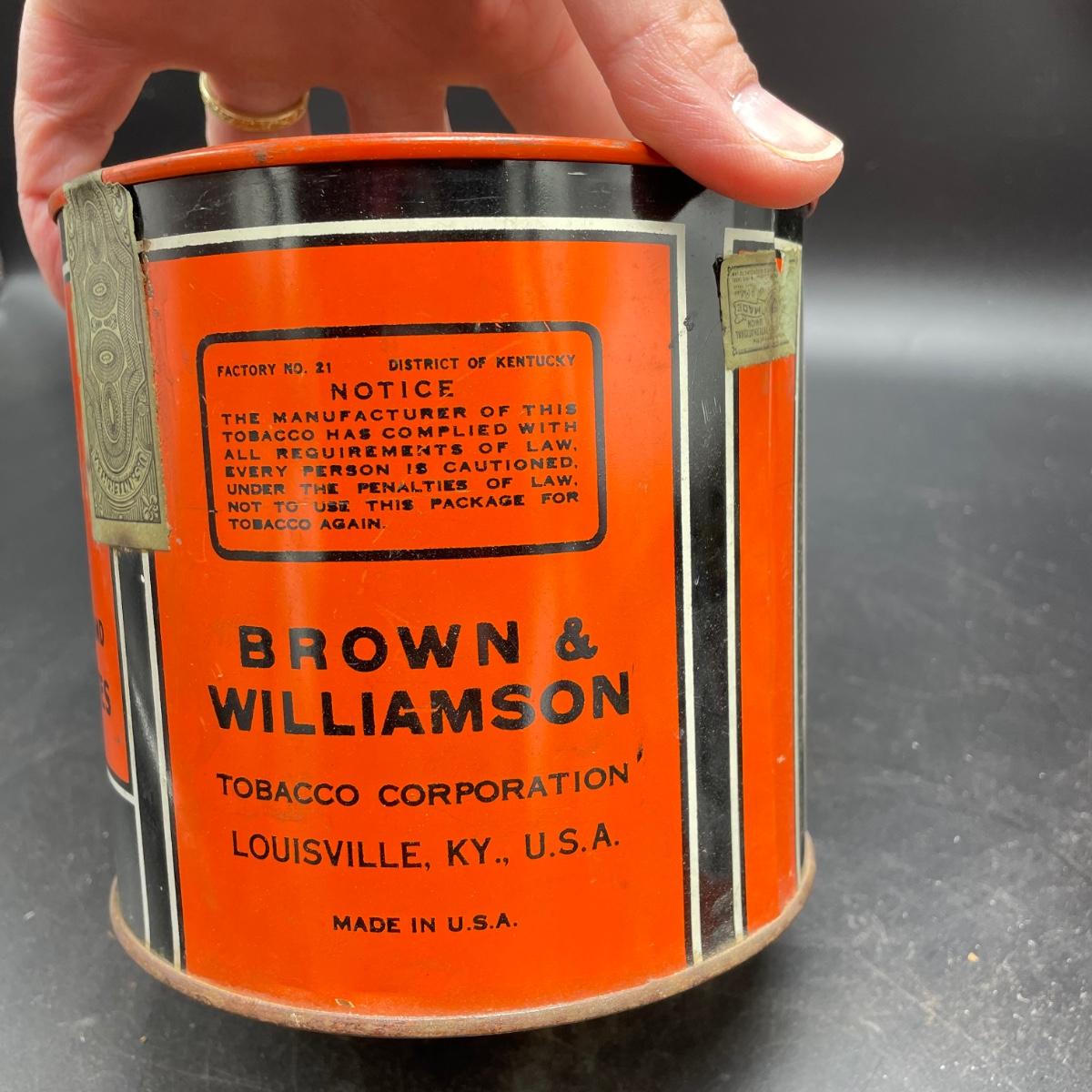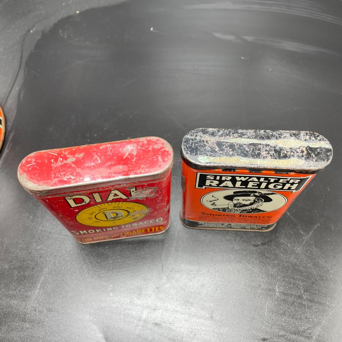 Three 14oz Sir Walter Raleigh tobacco tins, one is currently sealed shut. Lot also features two vertical pocket tins for pipe and cigarettes and a linen style bag with paper seal, wrapped in a cellophane style plastic. All items are marked Louisville, KY. See images. Shipping available.