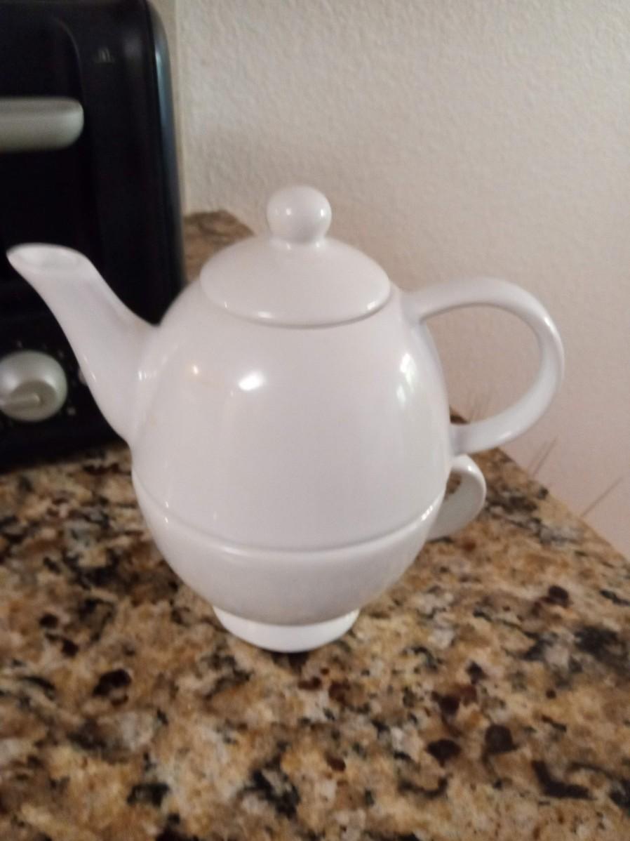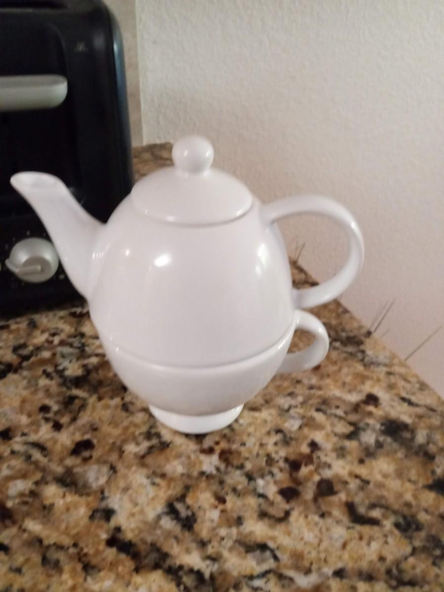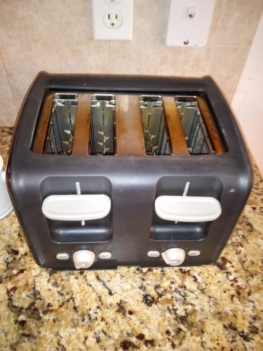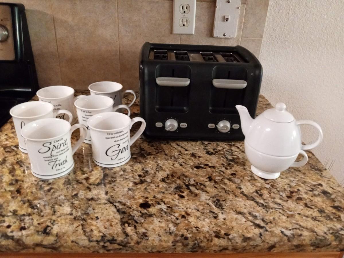 4 SLICE OSTER TOASTER, 6 COFFEE MUGS AND A TEA POT