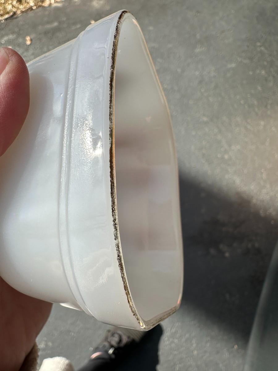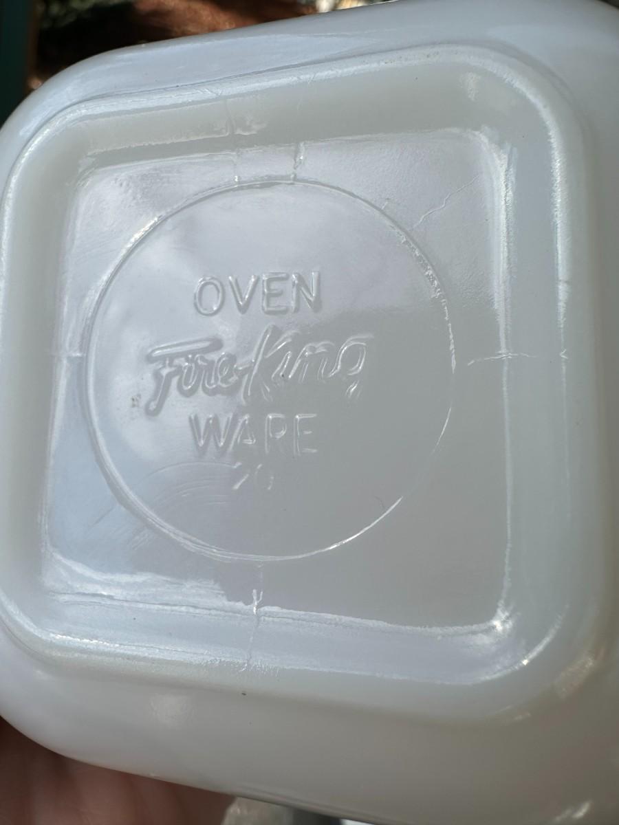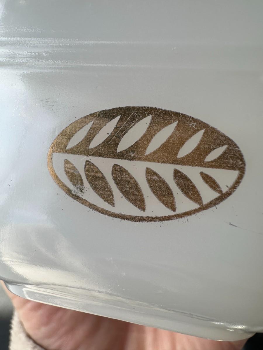 4" Square Fire King Ovenware w/ Leaf and Wood Lid with Knob; gold is worn around the top edge of dish as shown.