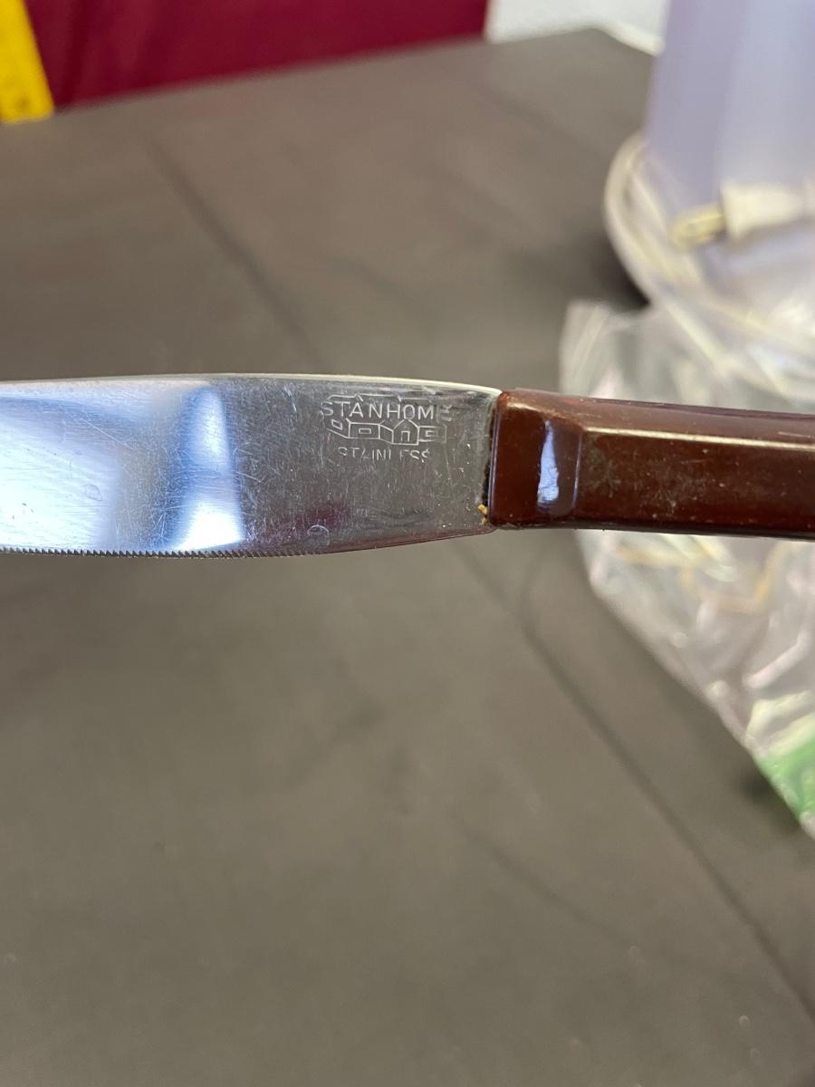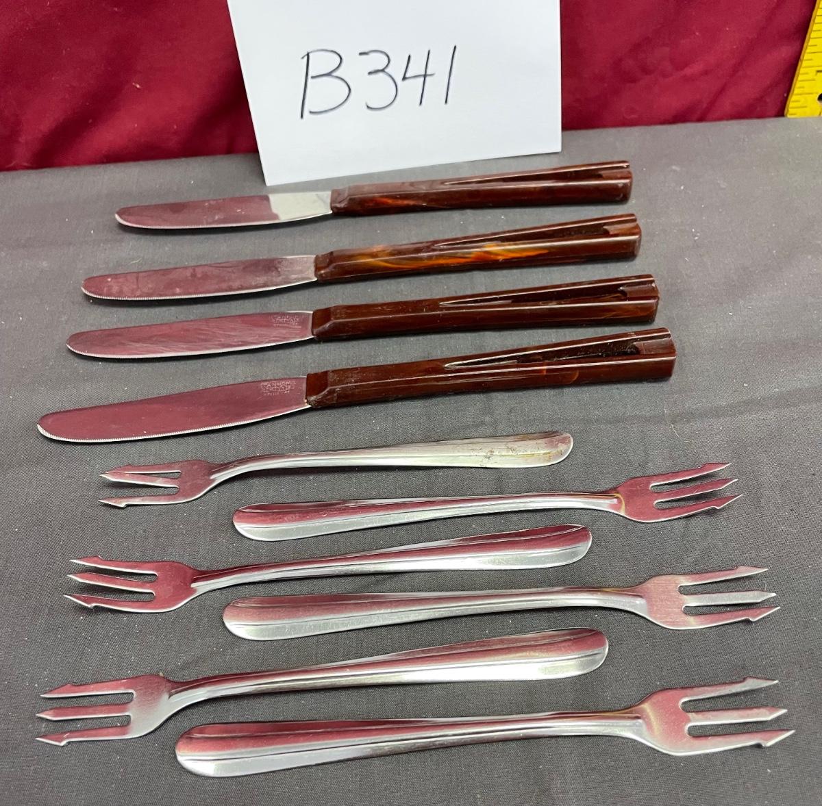 4 stainless steel, Bakelite handle knives,6 cocktail forks