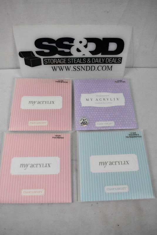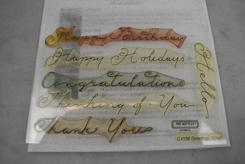 4 Stamp Sets by Close to my Heart: Greetings Script, Piece of Cake, Postmarked, & Welcome to the Neighborhood