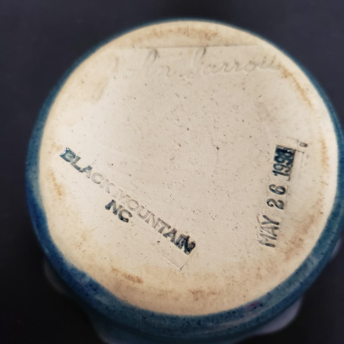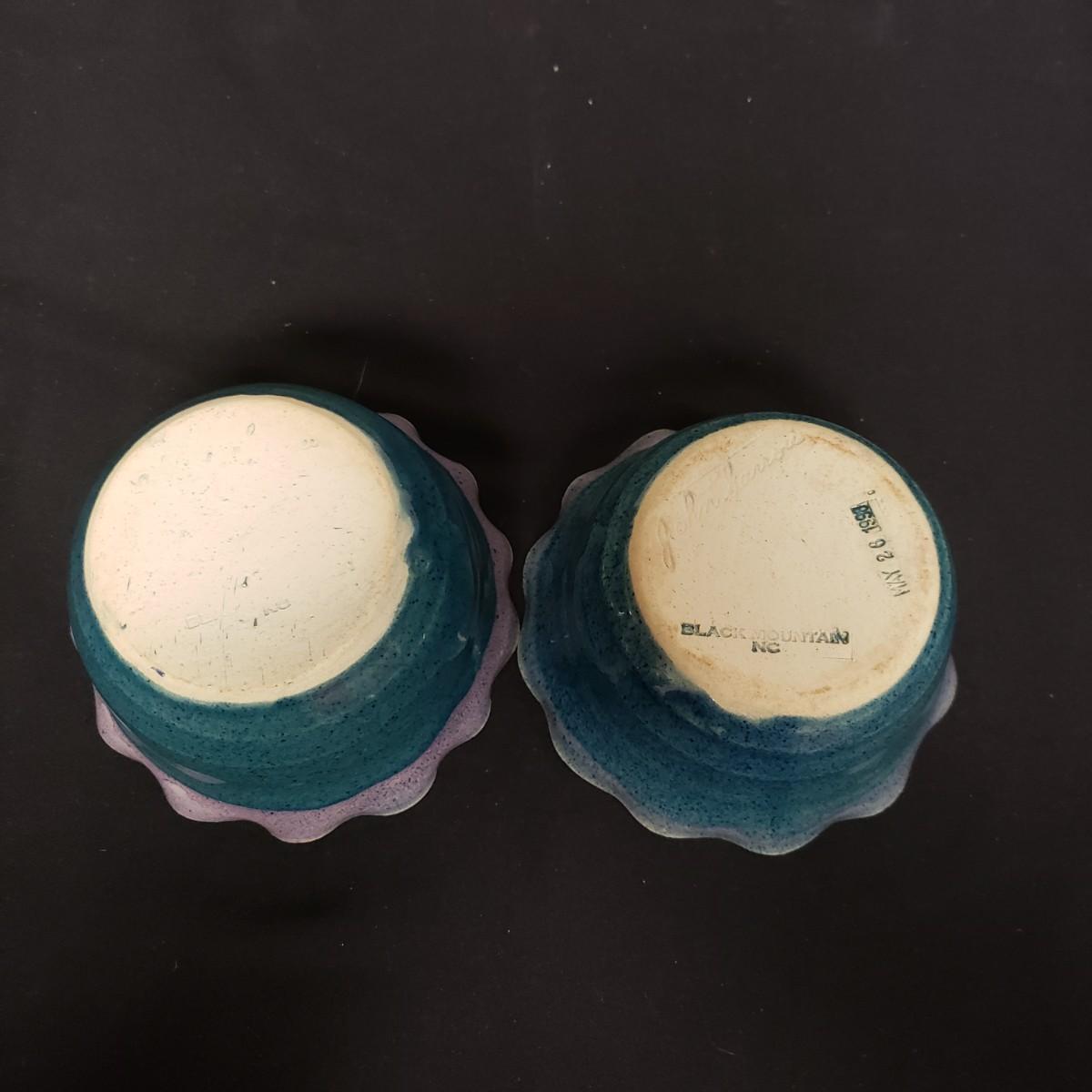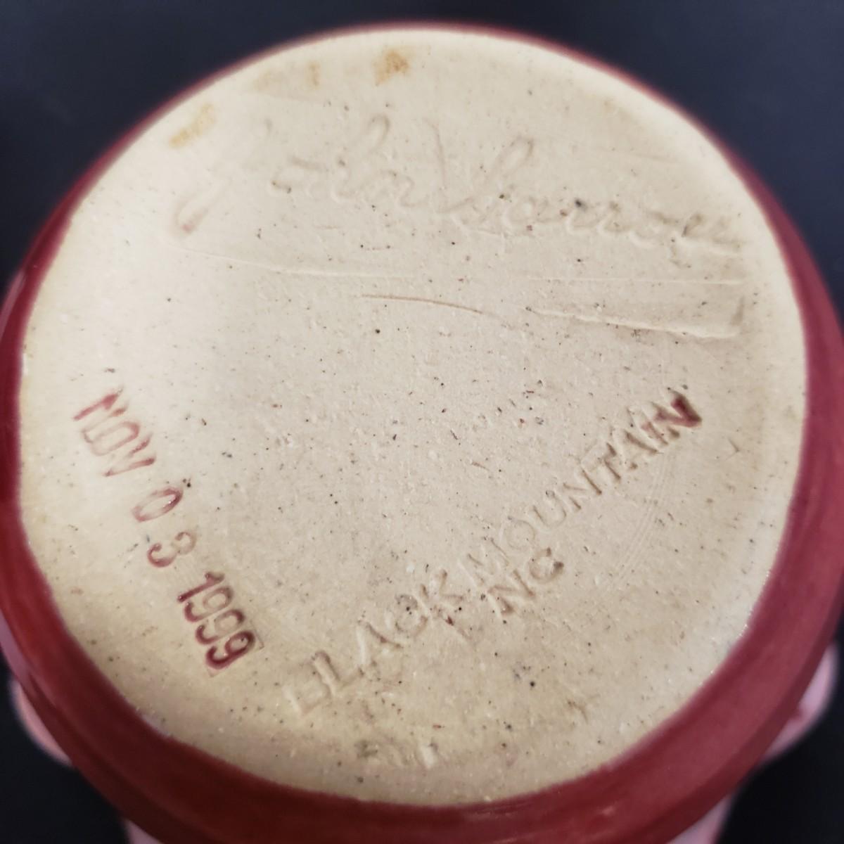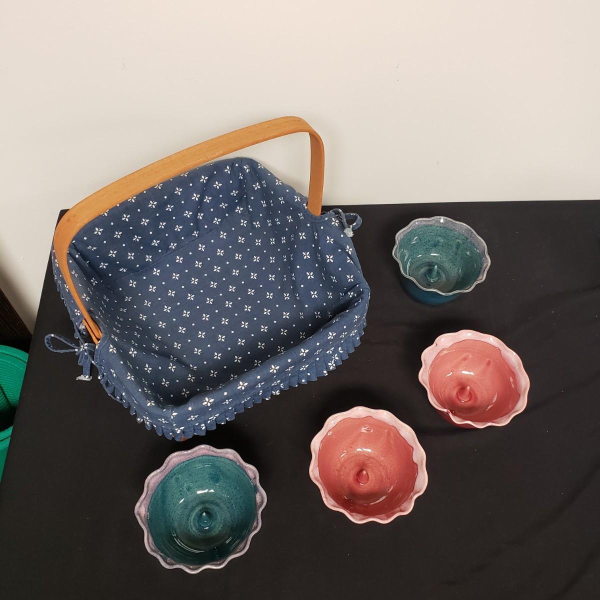 4 pottery Apple Bakers stamped by the artist John S. from Black Mountain, NC. Two have a blue-green glaze, and 2 have a red/pink glaze. The Longaberger Basket is from 1994 and perfect for picking the apples for you to use the bakers with! All items appear to be in good condition.