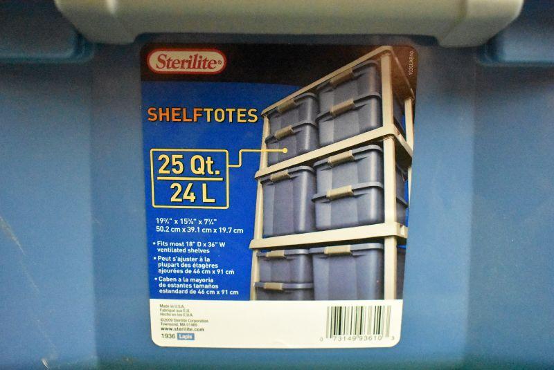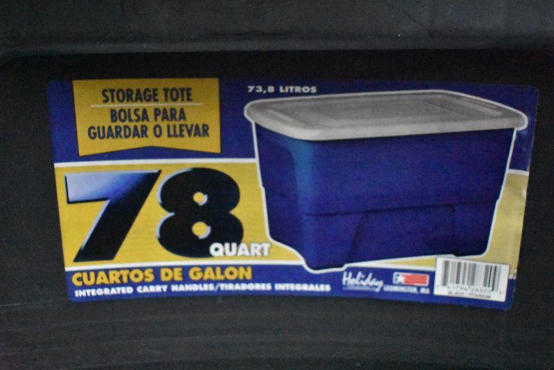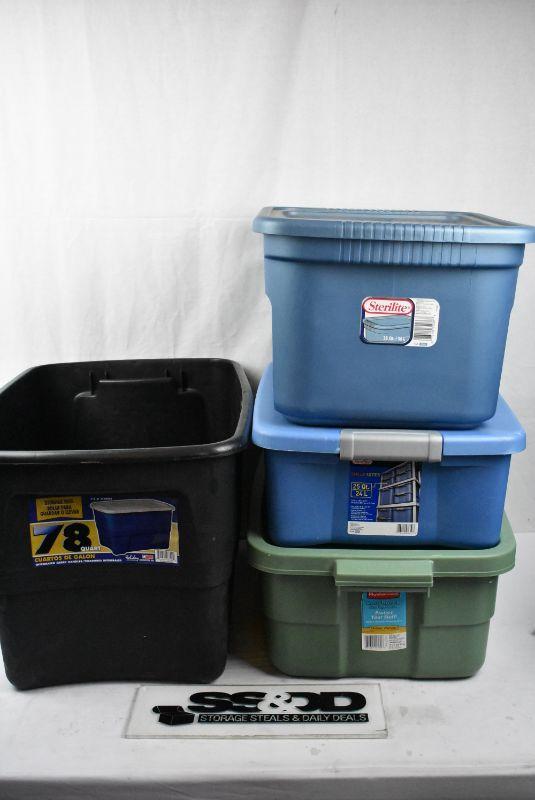 4 Storage Bins: Black no lid, 2 blue with lids, Green with lid