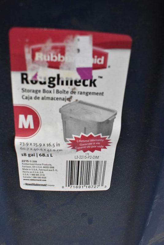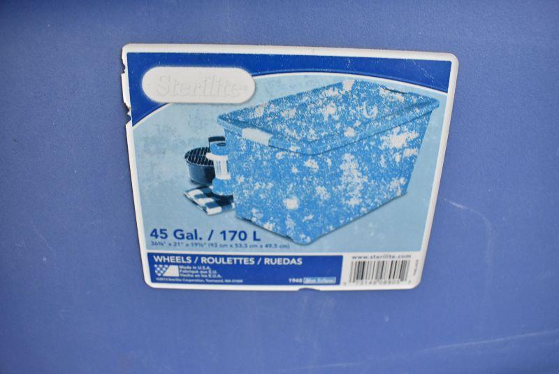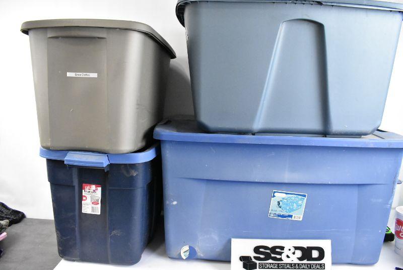 4 Storage Bins with Lids: Blue & Gray. 1 lid has broken handles