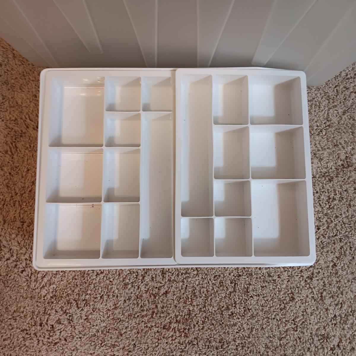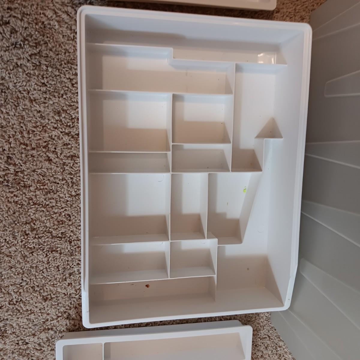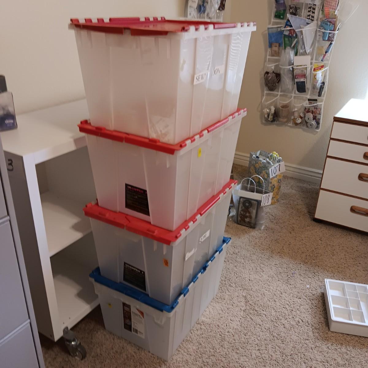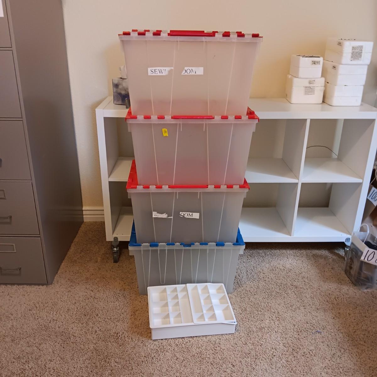 4 STORAGE TOTES AND A DRAWER ORGANIZER