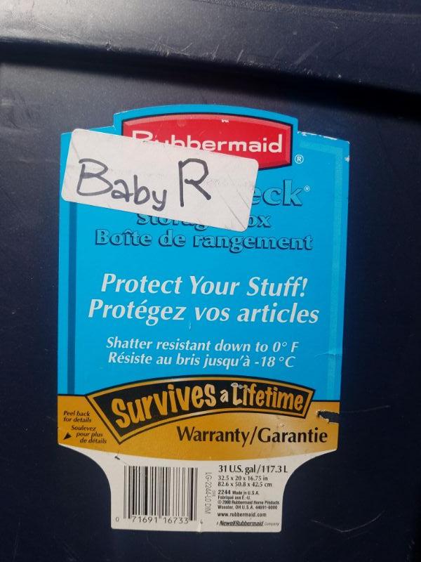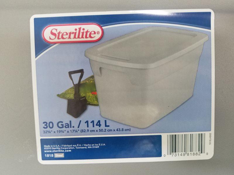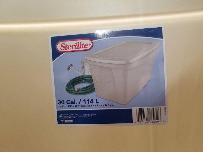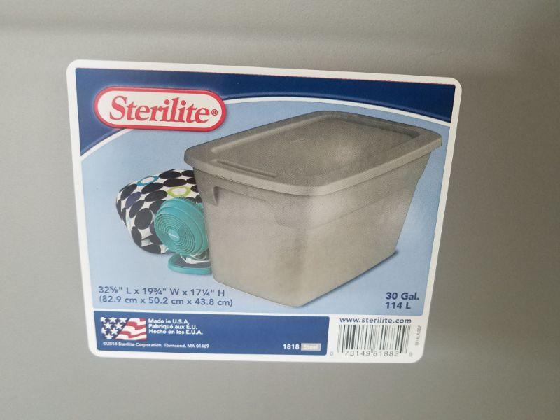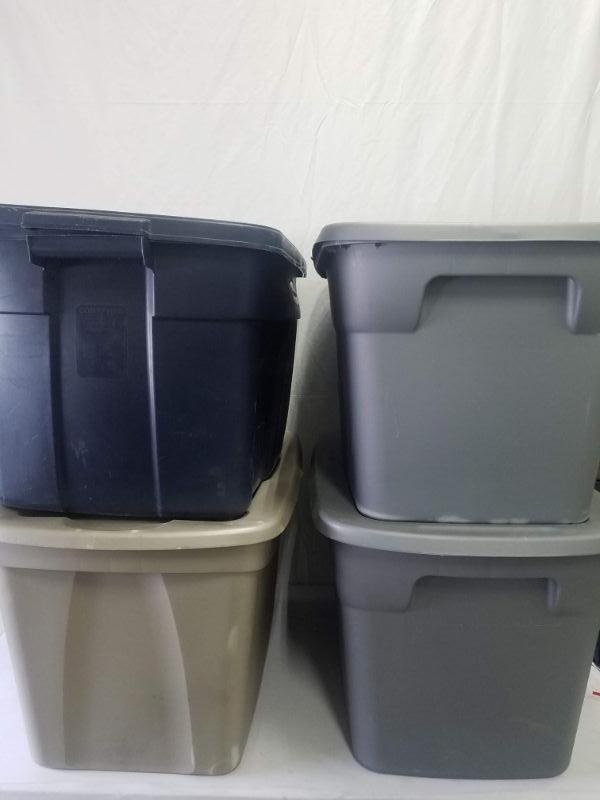 4 Storage Totes with Lids: Navy, Brown, 2 Gray. 31 & 30 gallons