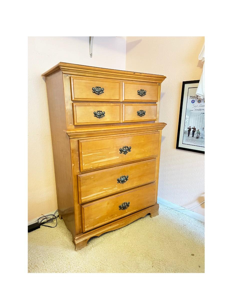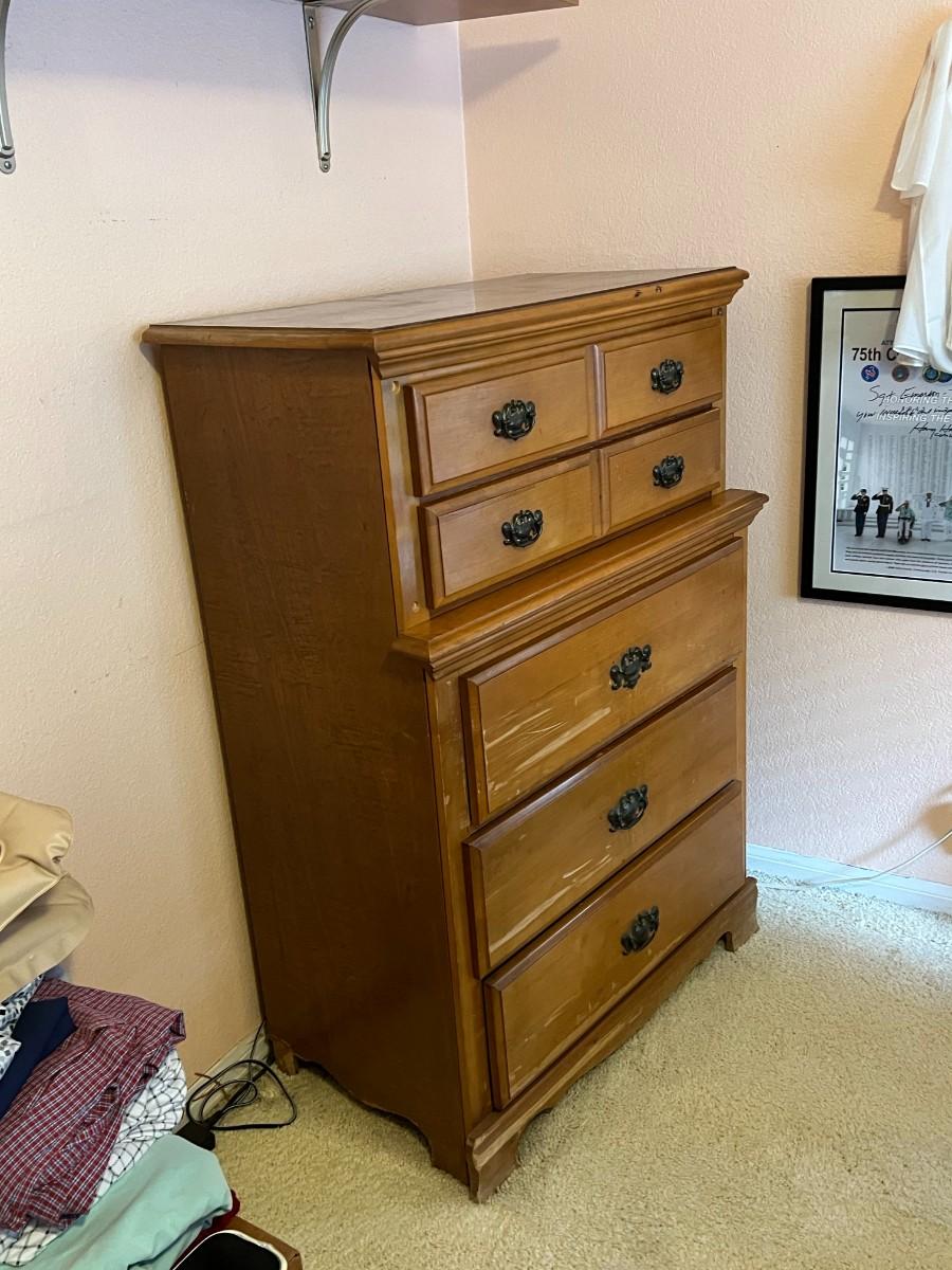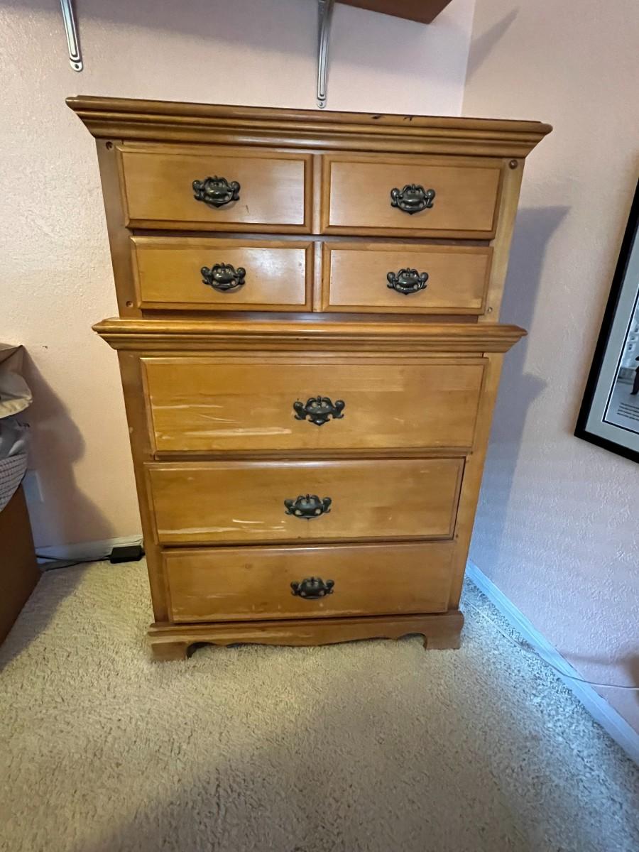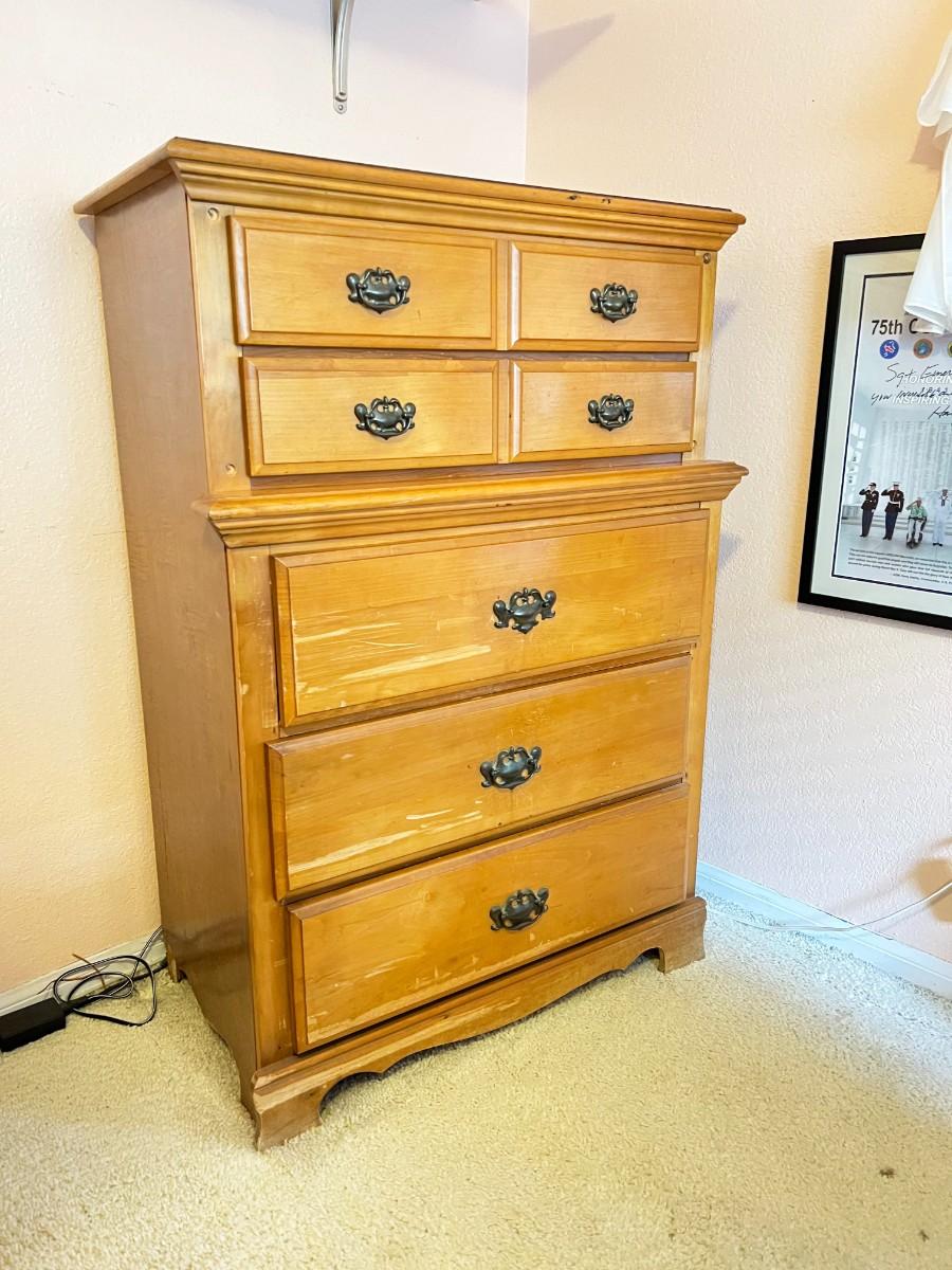 4' Tall Wooden Dresser, there is some wear to the dresser, but there is no significant damage and is in good usable condition.
