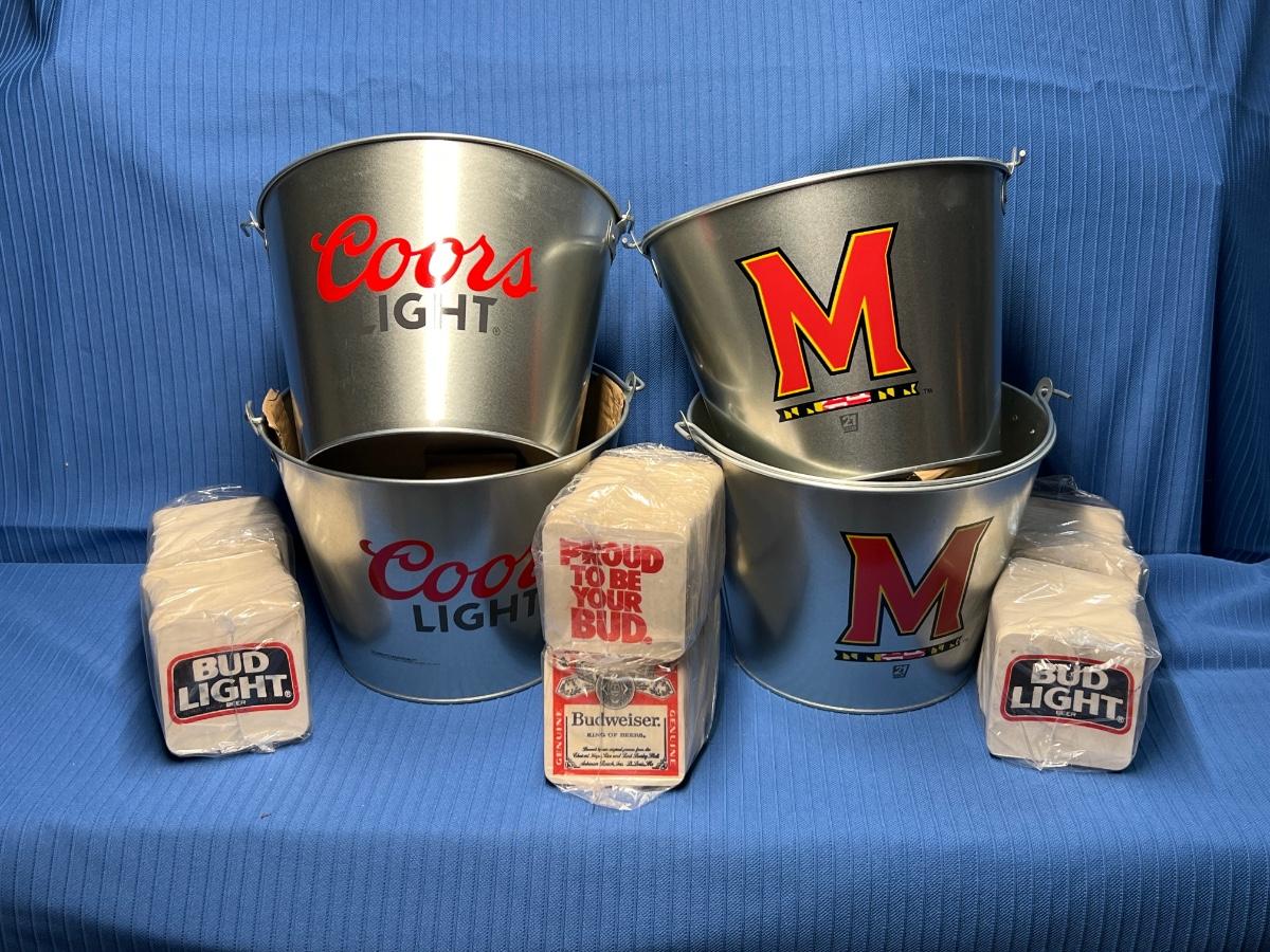 4 U of Maryland buckets, 4 Bud Light Coaster packs, 2 Budweiser Coaster packs
