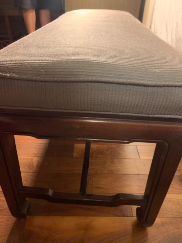 Upholstered and Wood Bench. Some staining and snags on cushion. As-Is. Check photos for measurements.