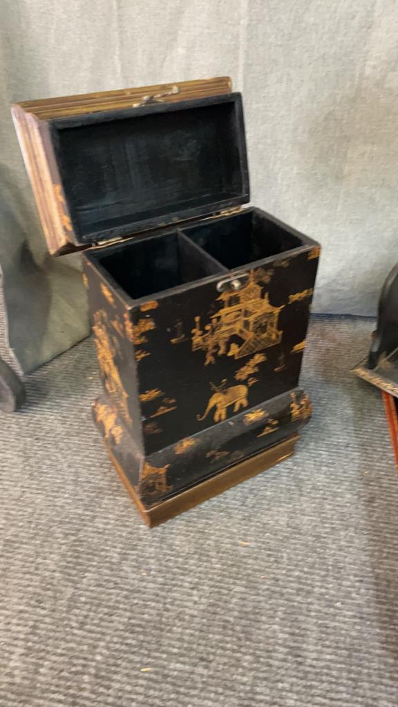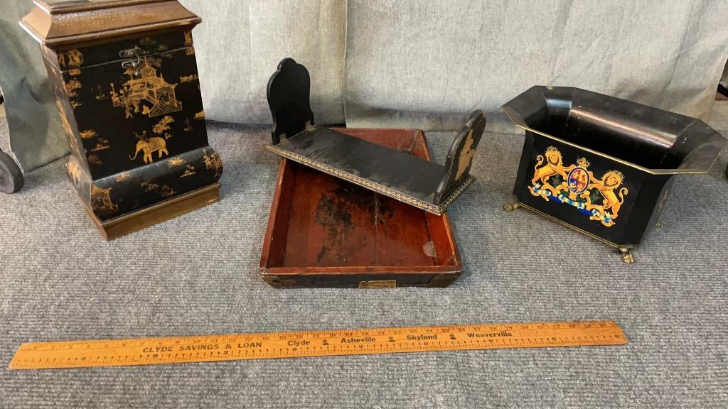 Asian serving tray, Asian bottle box, Tin planter, Grecian bookends Line Item # 143, 16,