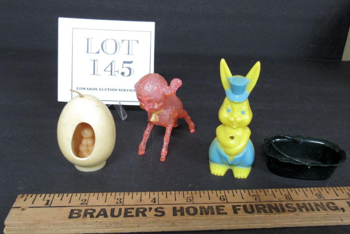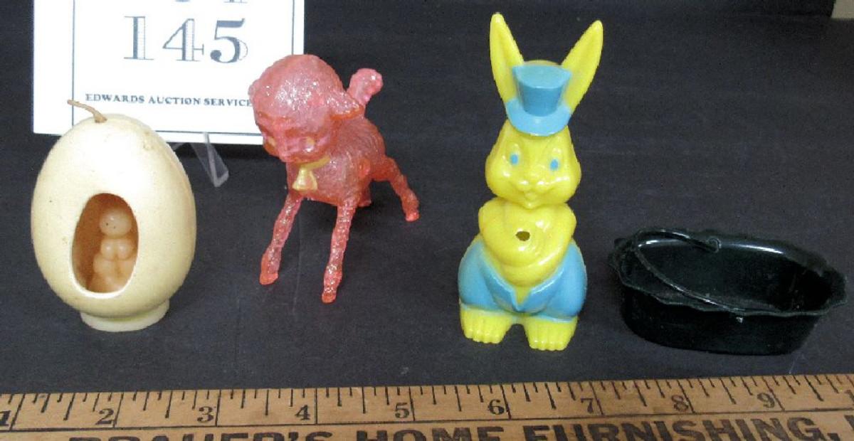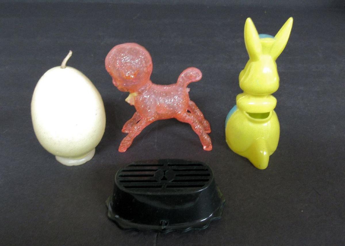 4 Vintage Easter Items, Candle, Hard Plastic Lamb, Rabbit Sucker Holder, Mini Hard Plastic Basket