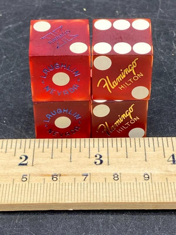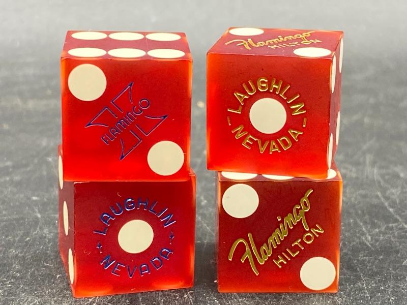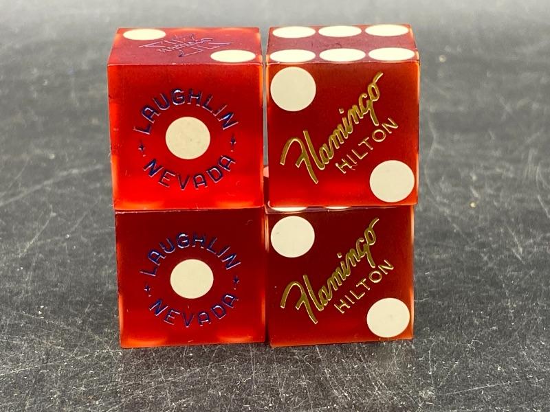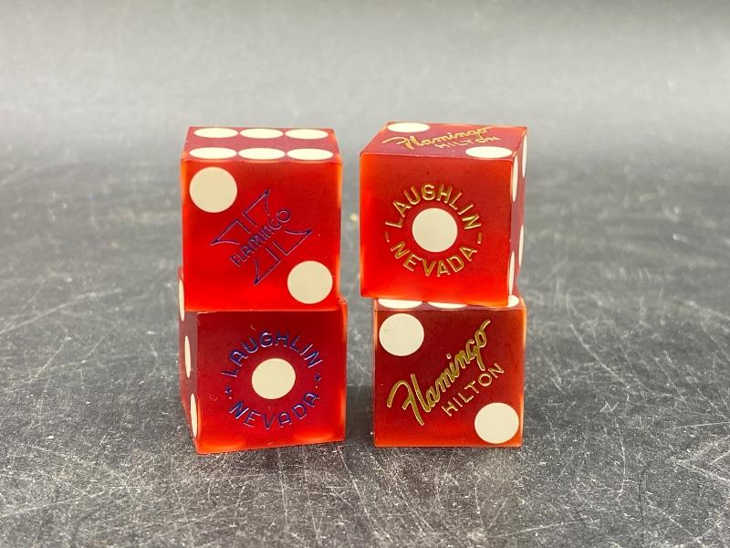 Set of 4 Flamingo Hilton Laughlin, Nevada red dice. 3/4" size. One pair with gold lettering, the other pair with blue lettering. Good condition.