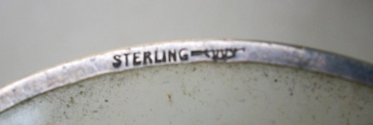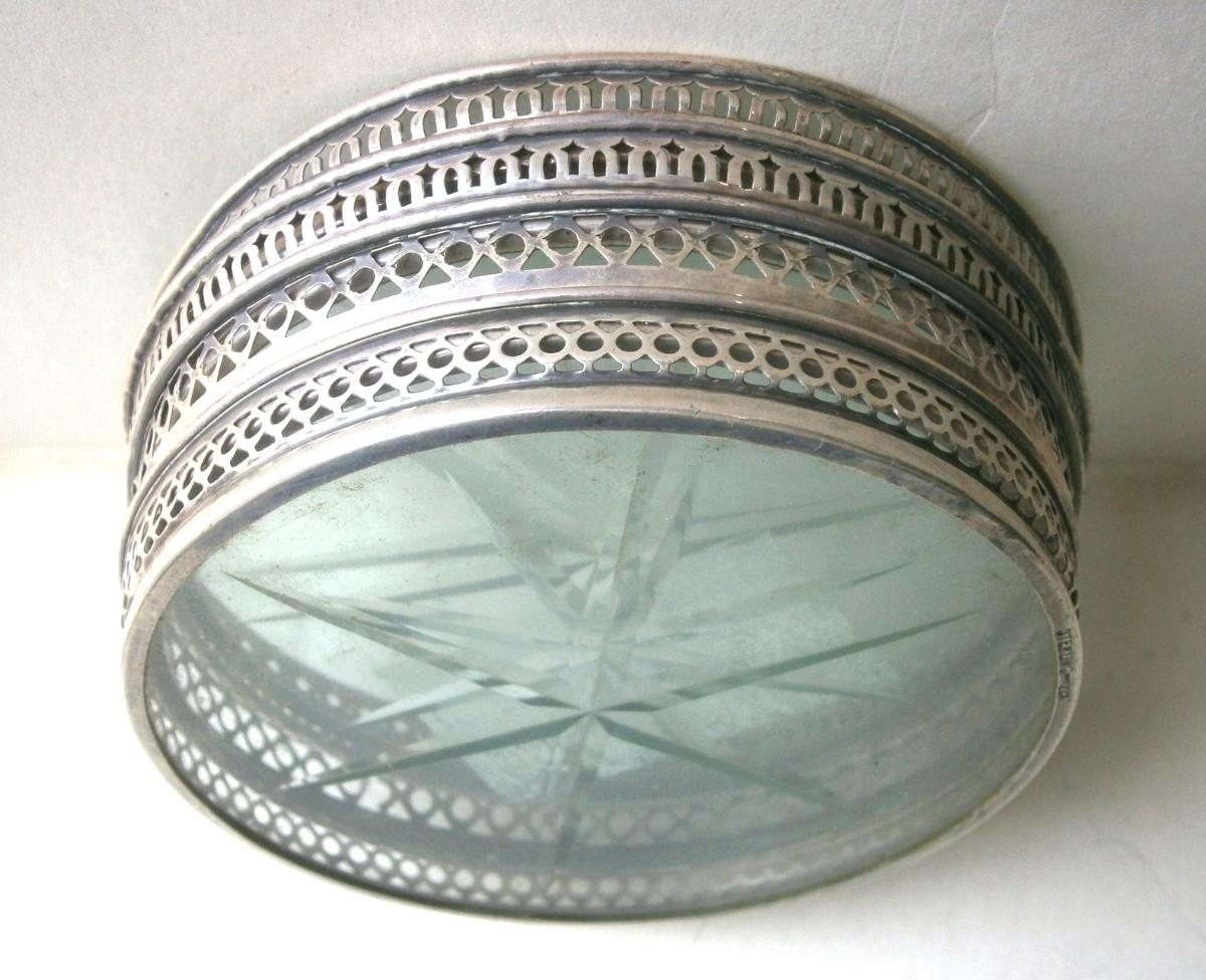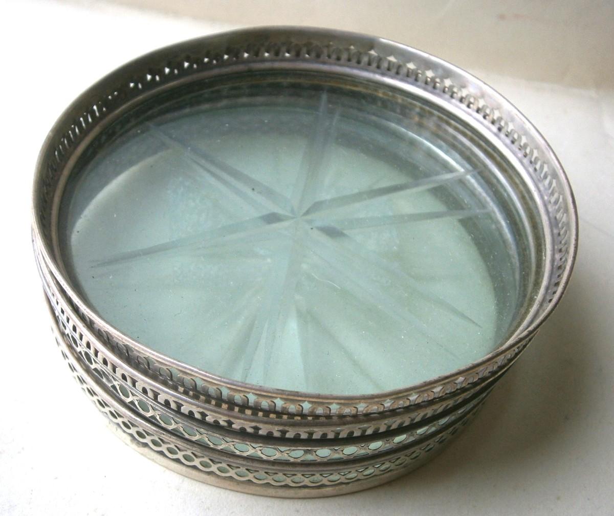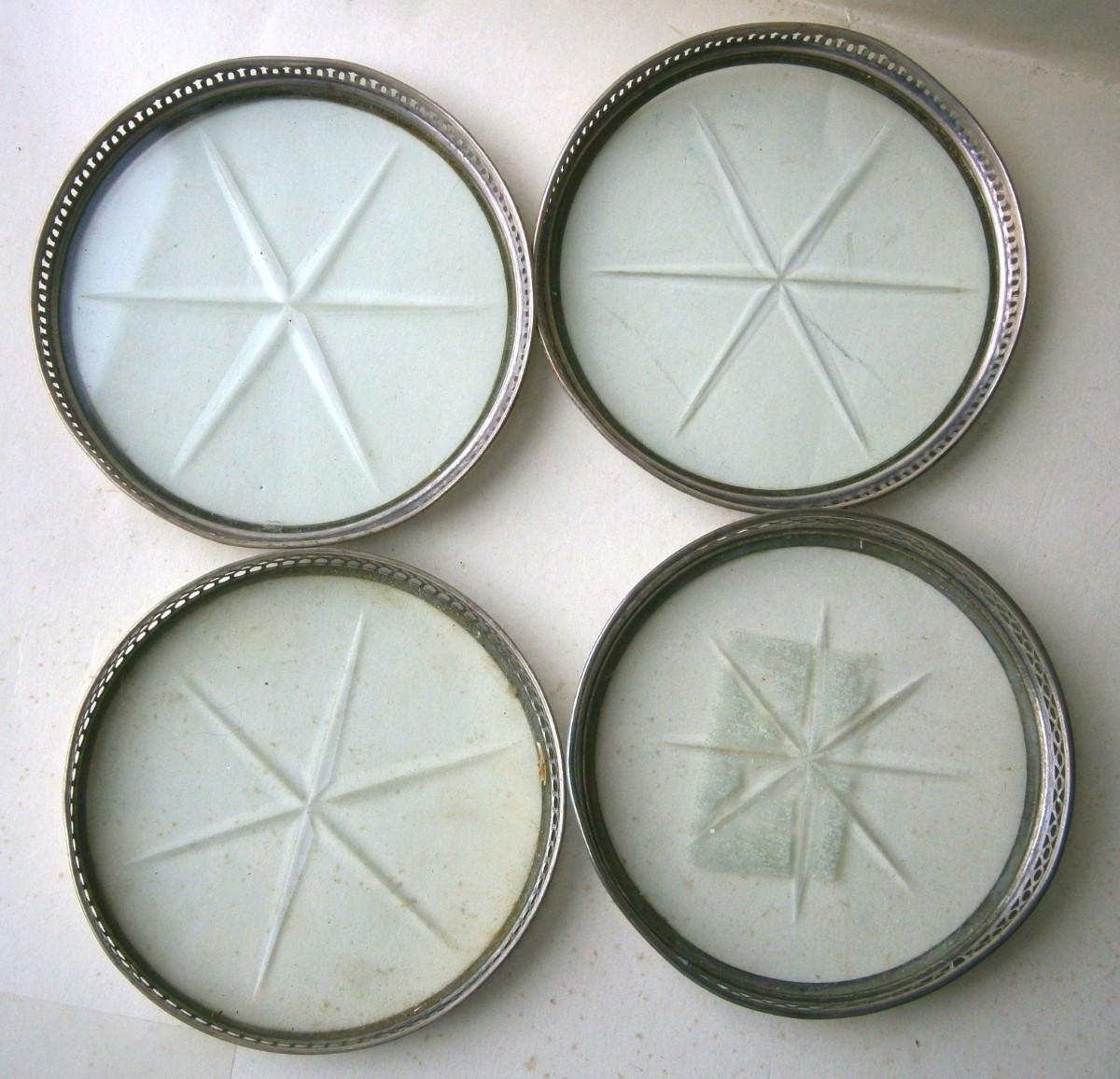 Set of 4 Vintage Glass & Sterling Silver Coasters from early 1900's, 3 1/4 in. diameter, silver rims have some bends.