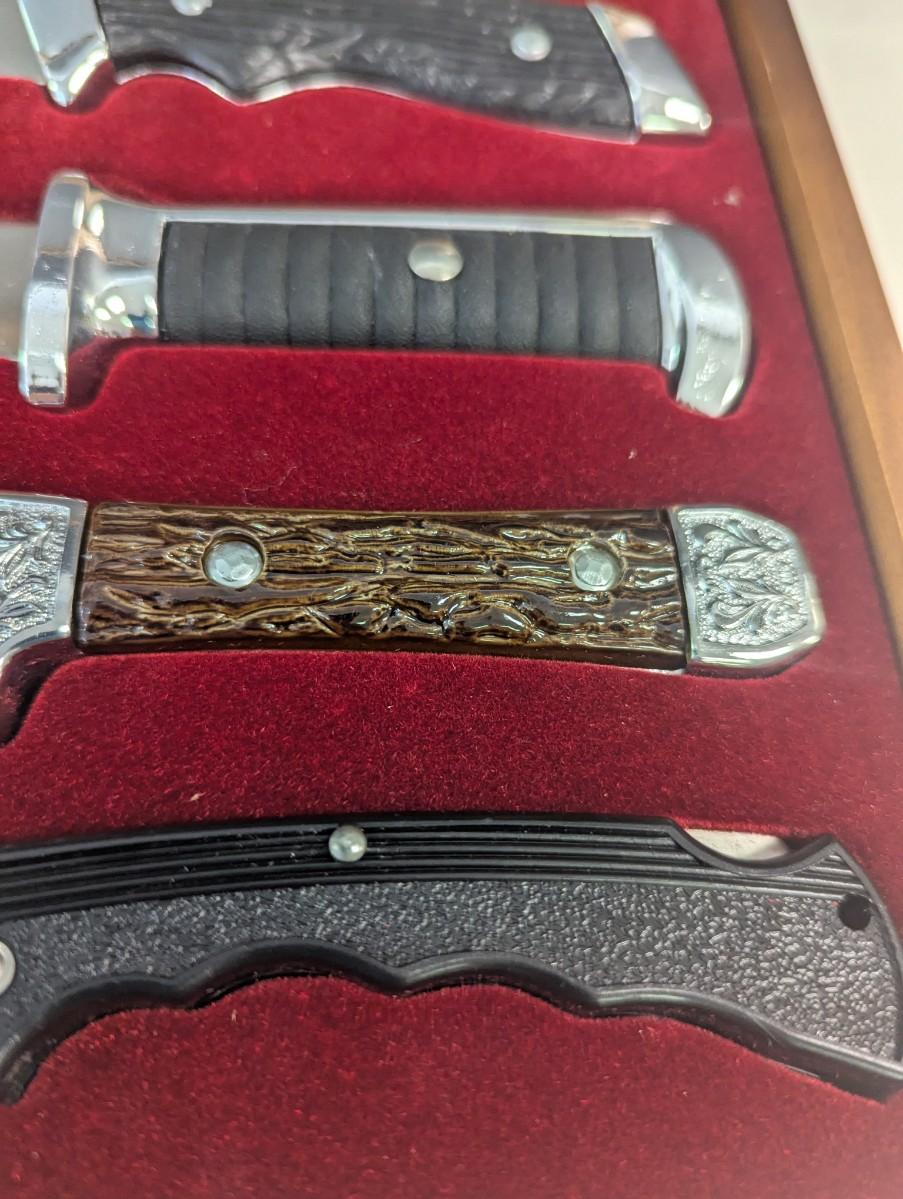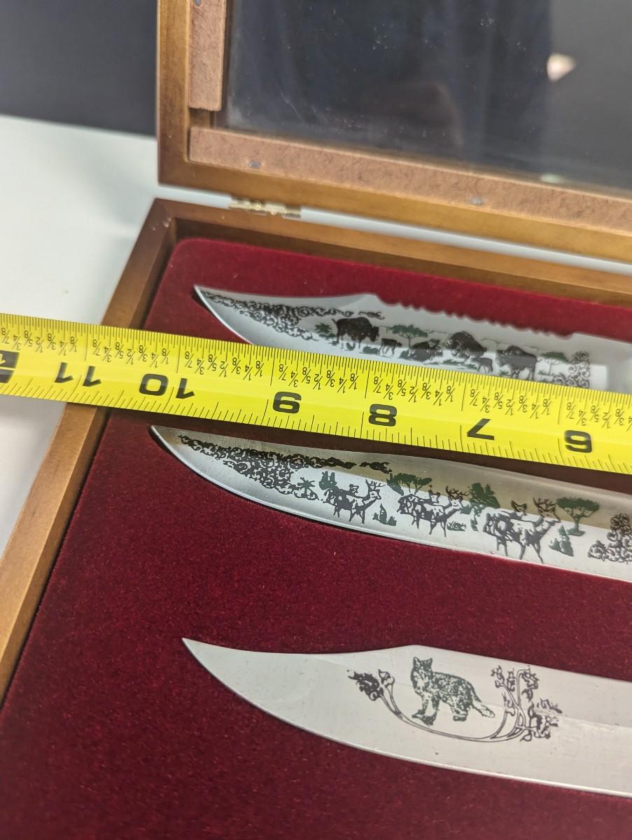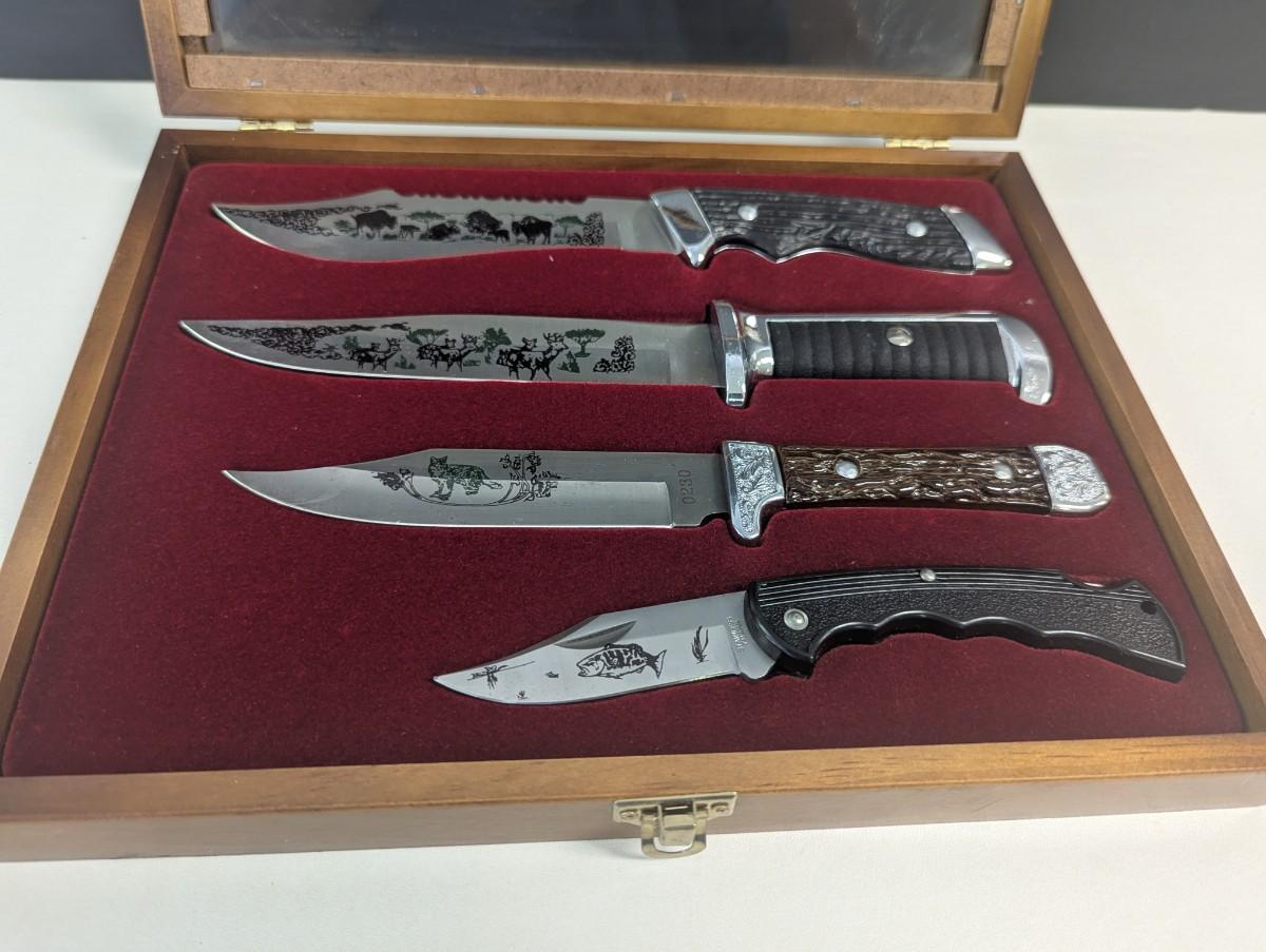 4 Vintage Knife Display Set Etched Hunting Bowie Knives In Case
