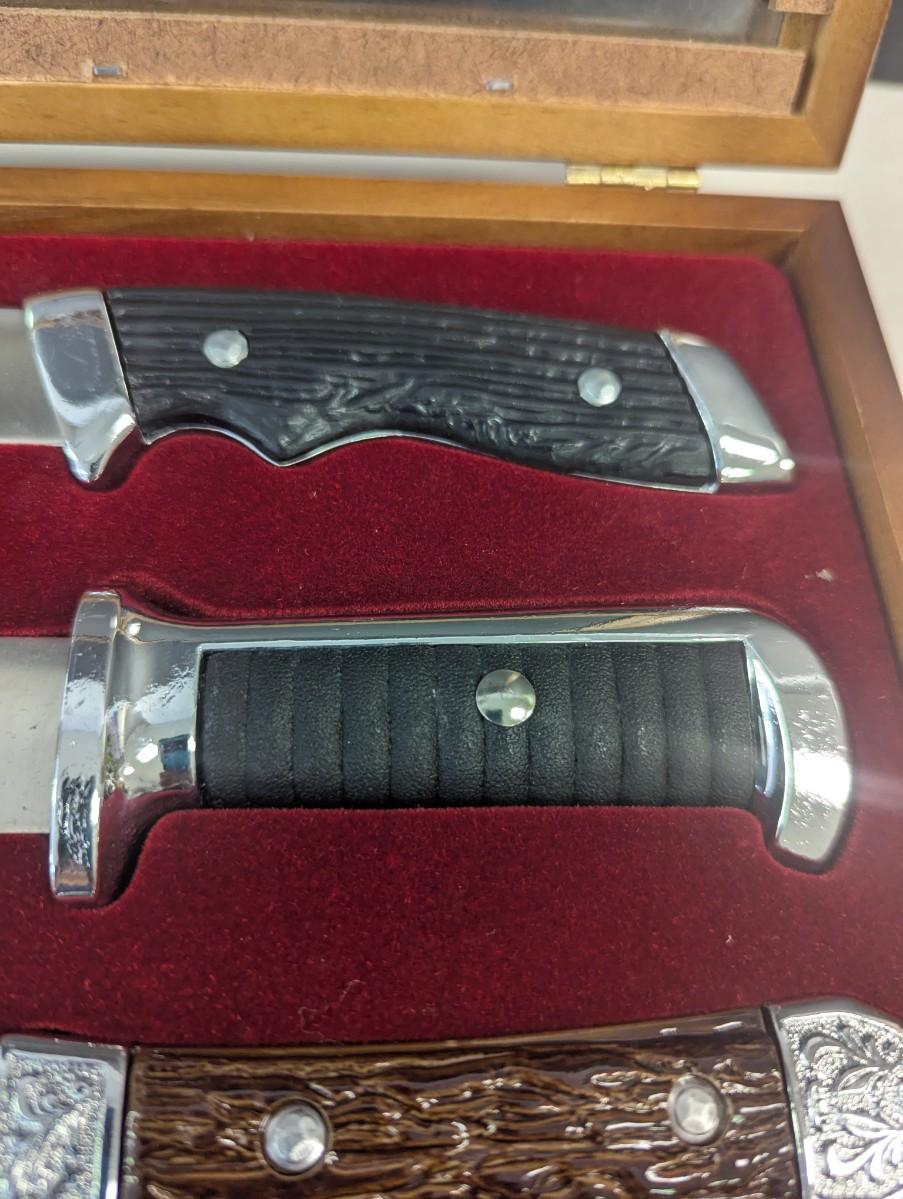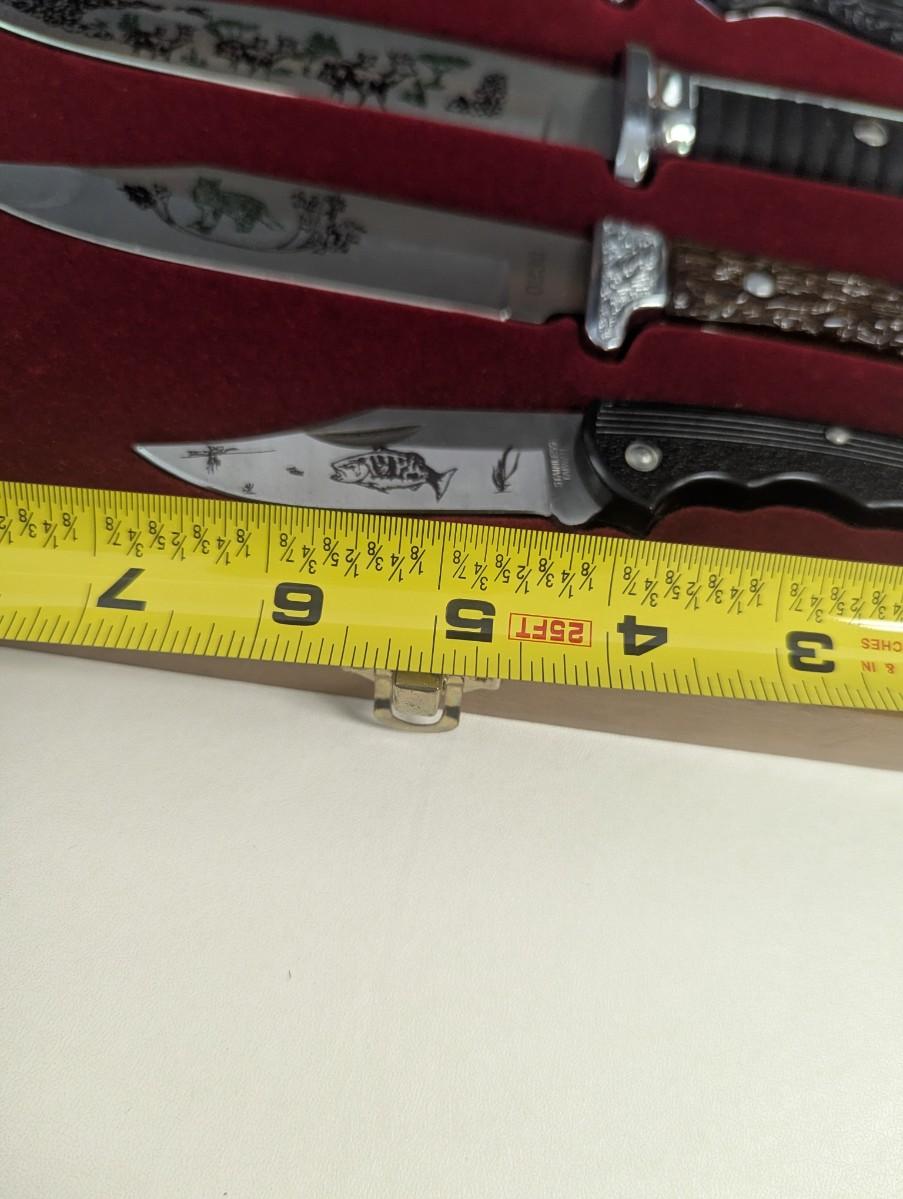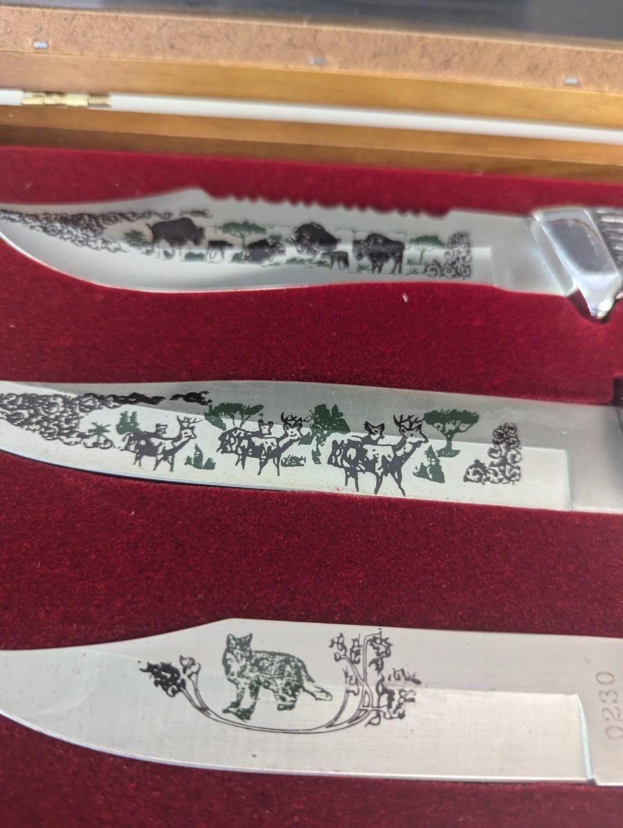 4 Vintage Knife Display Set Etched Hunting Bowie Knives In Case