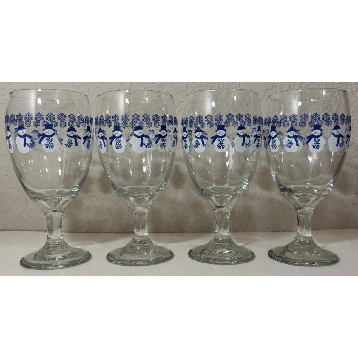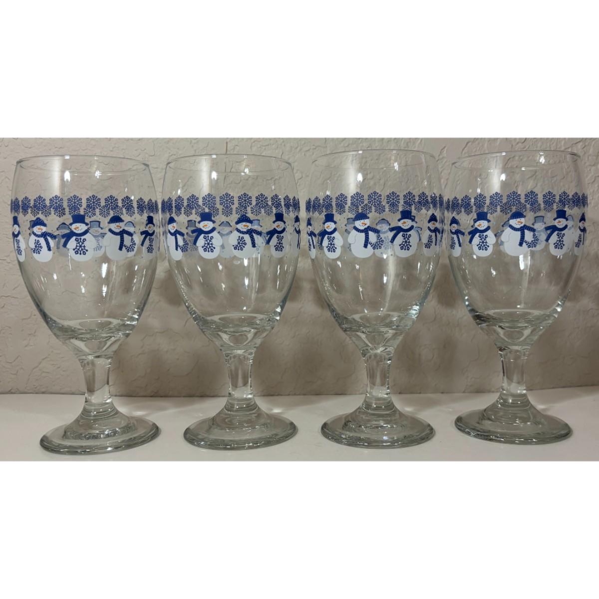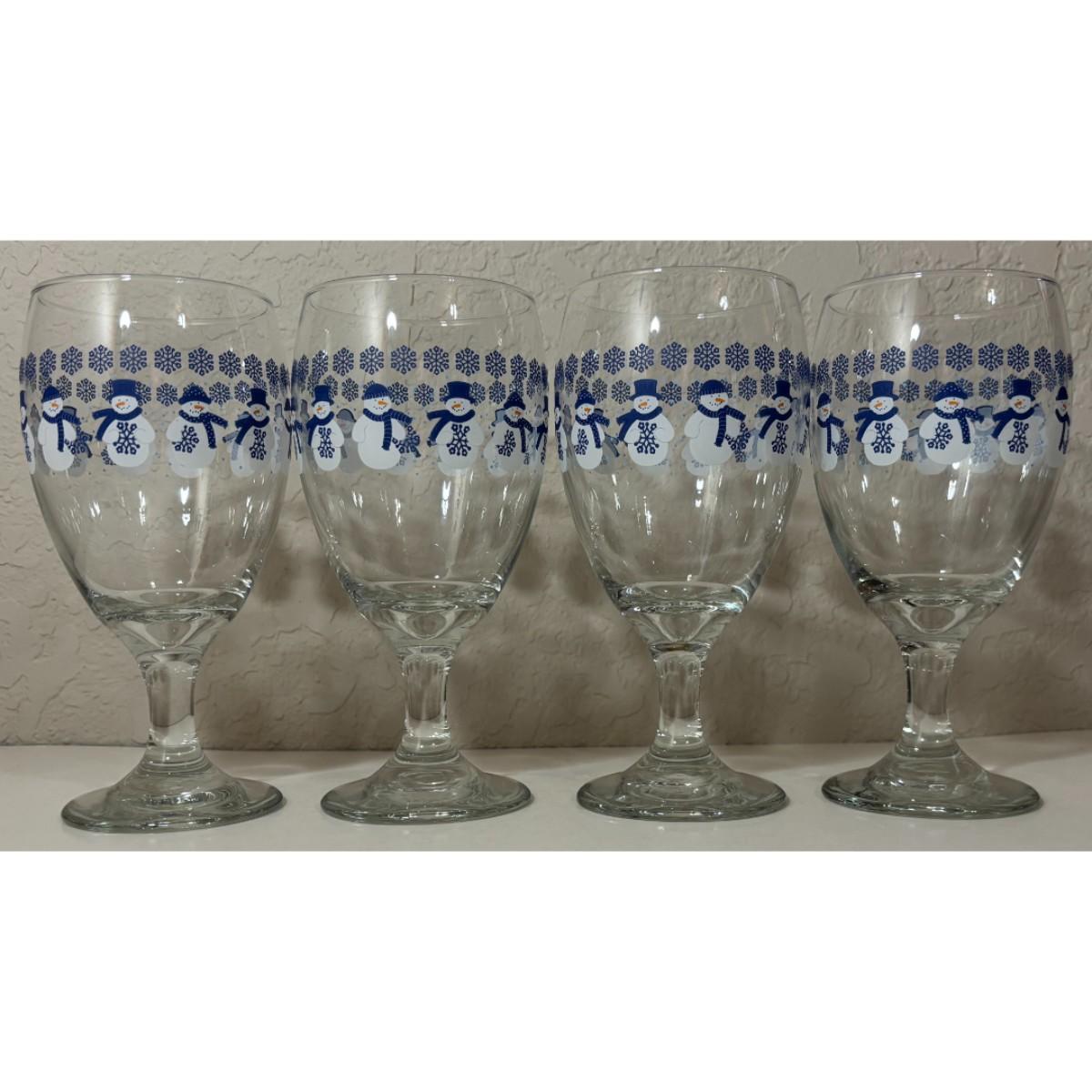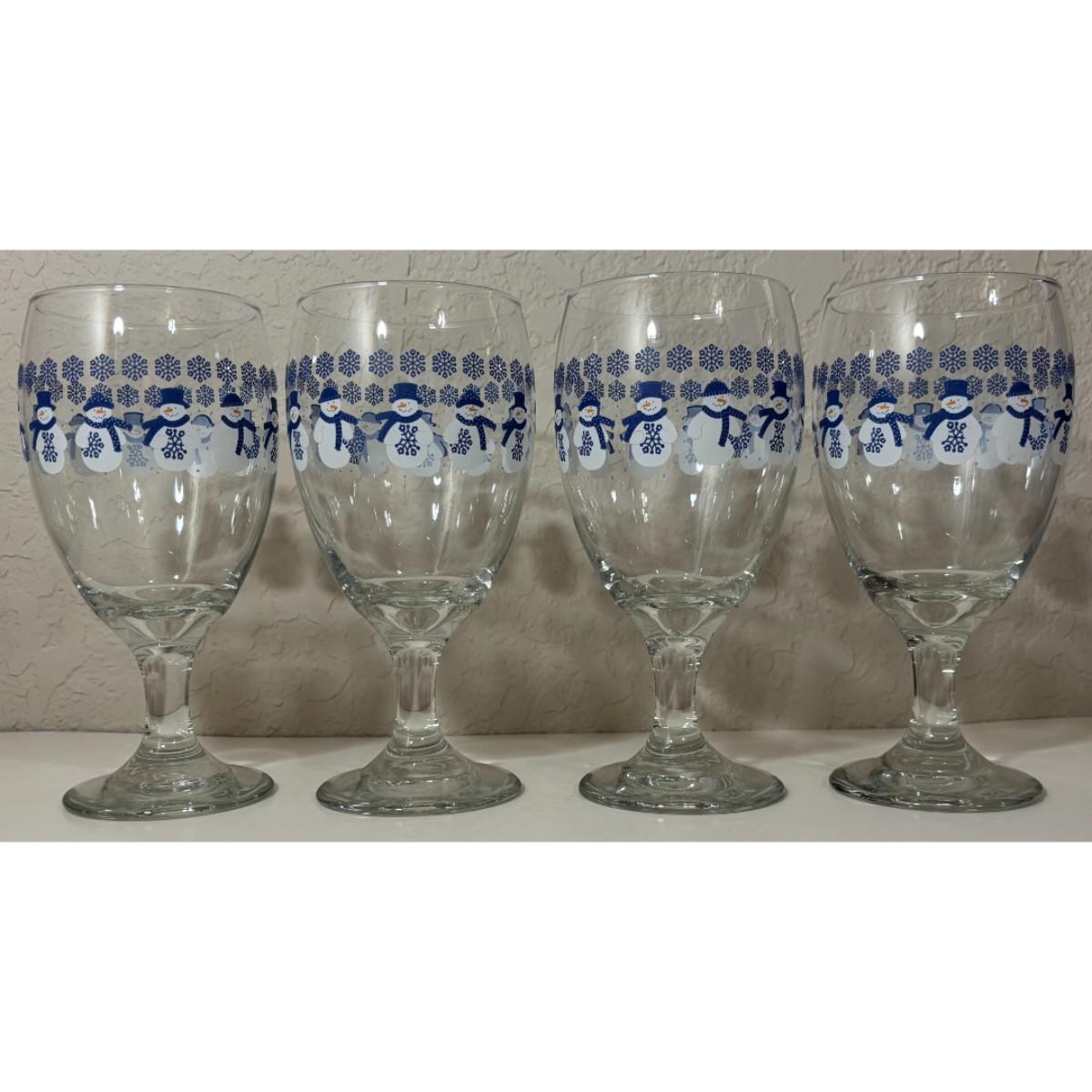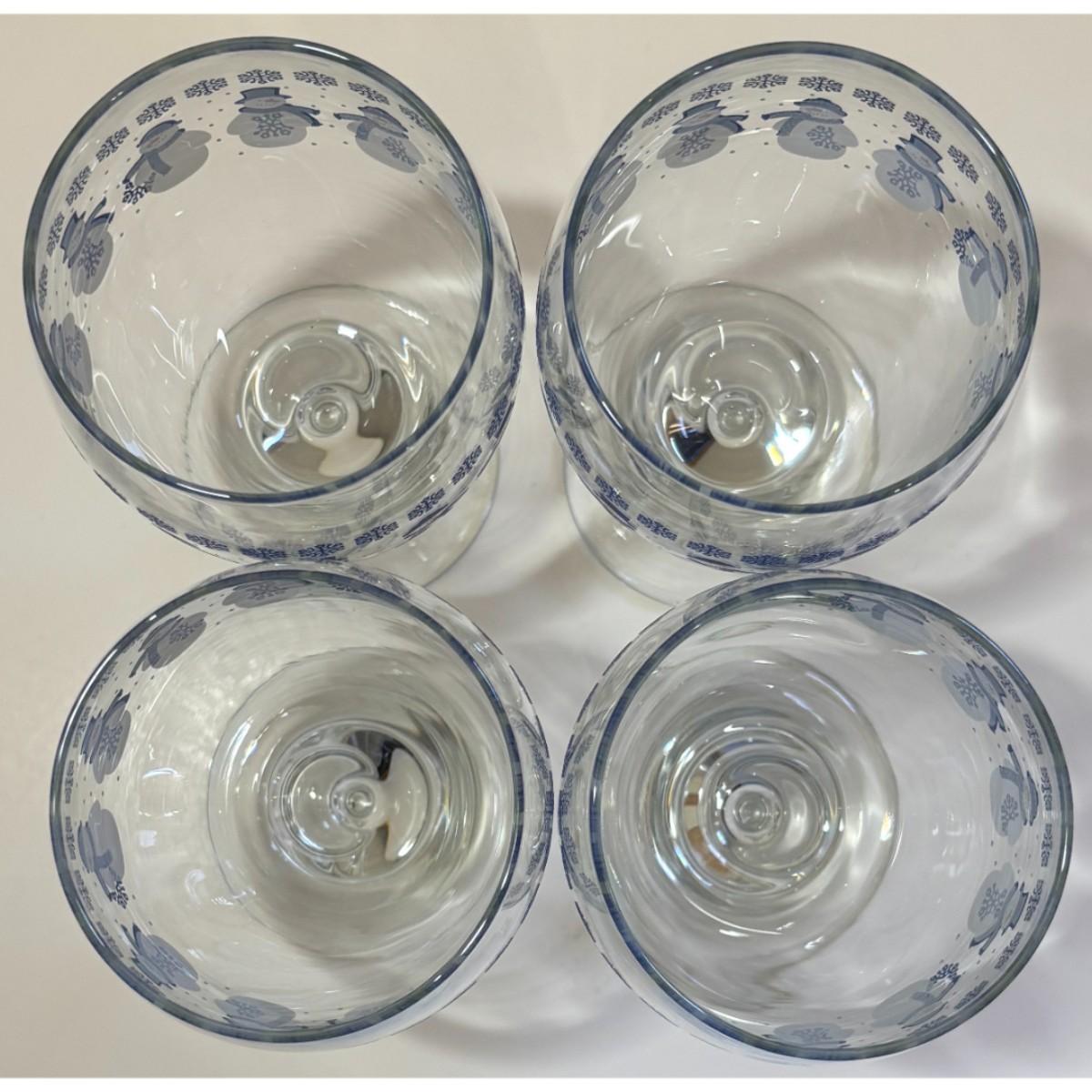 4 Vintage Libbey Snowmen Goblets Blue White Glasses Winter Snow Holidays - A
