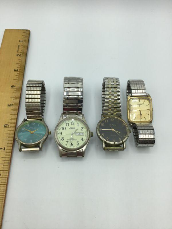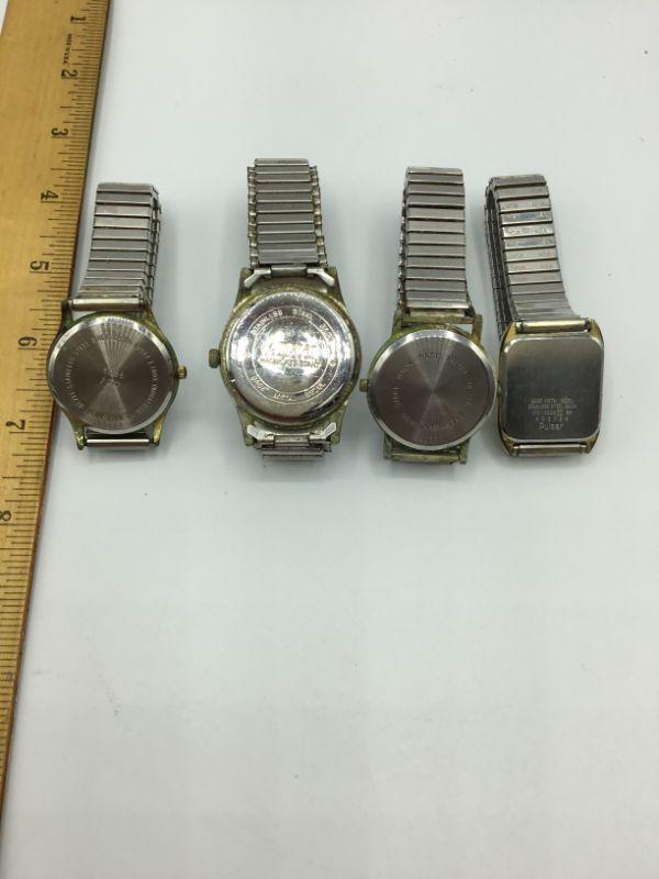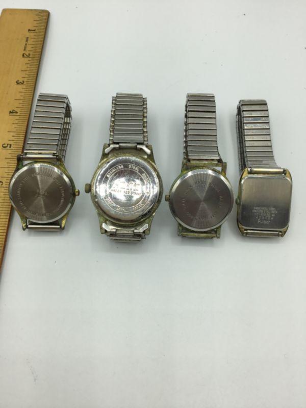 4 vintage men's watches. Currently not running, may just need batteries. All have stretch bands. Brands include Folio, Amstar, La Baron, and Pulsar. The first three are in good condition, the pulsar does have some damage.