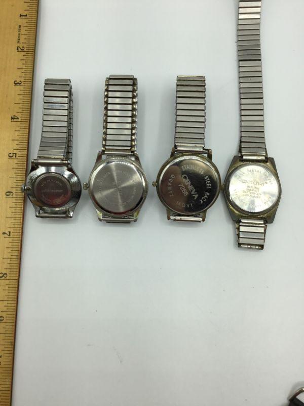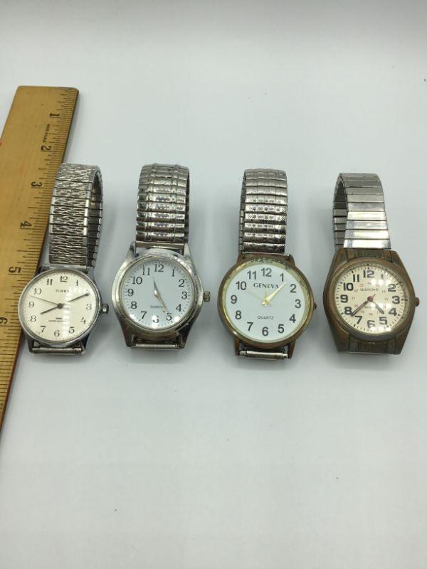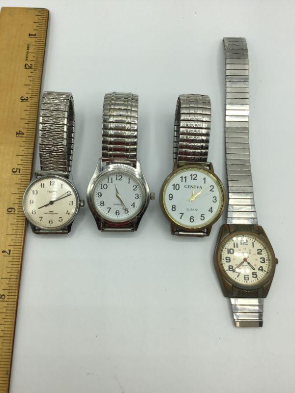 Set of 4 vintage men's watches. Currently they are not running, may just need battery. From left to right, Timex, Unnamed, Geneva, And Watch-It. Previously owned and used. Stretch bands. The Watch-it band is broken. Good for parts and repair.