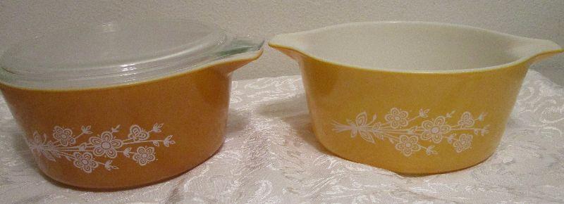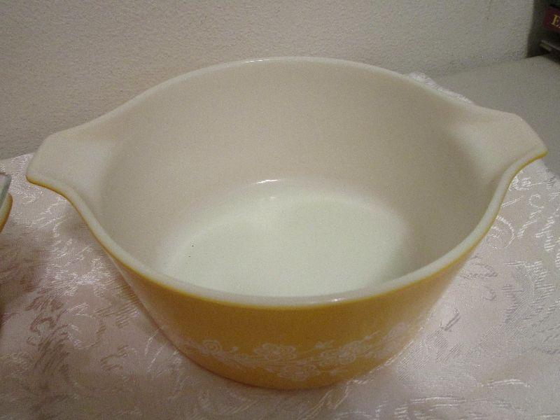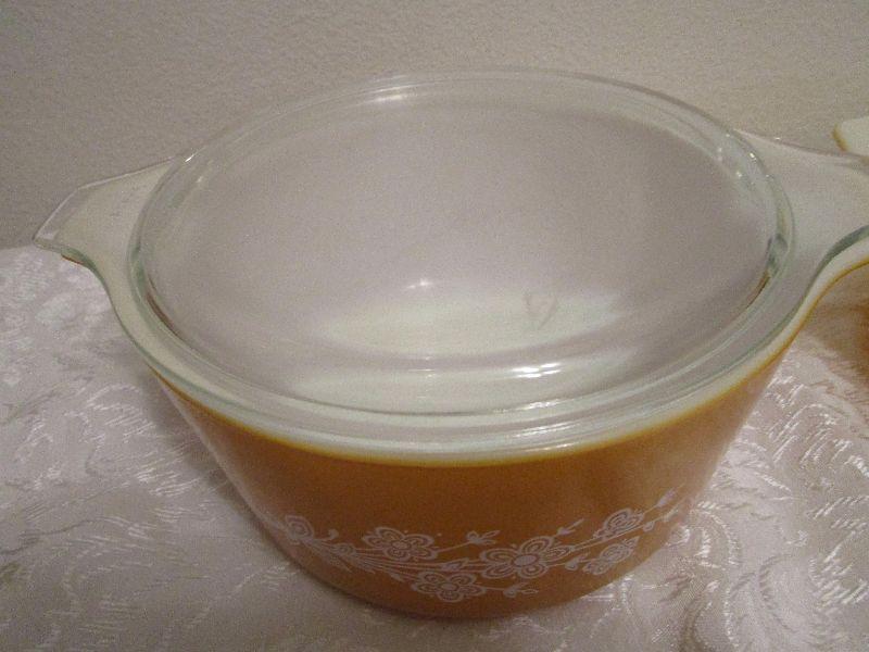 #4 Vintage Pyrex Gold Round Dishes, Clear Lid