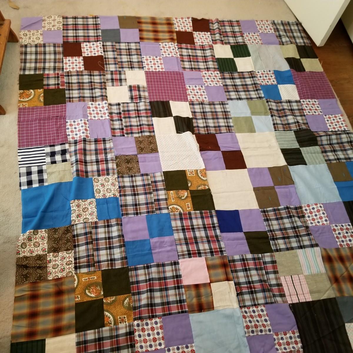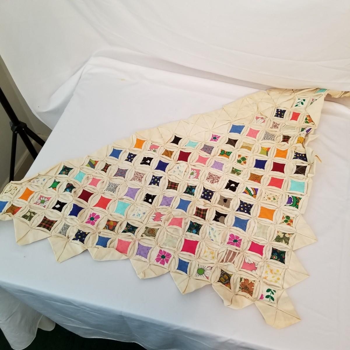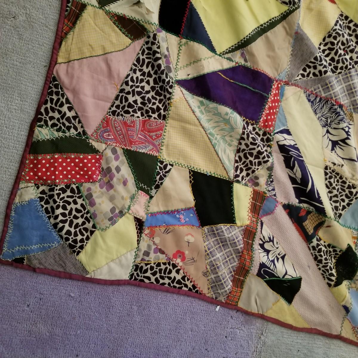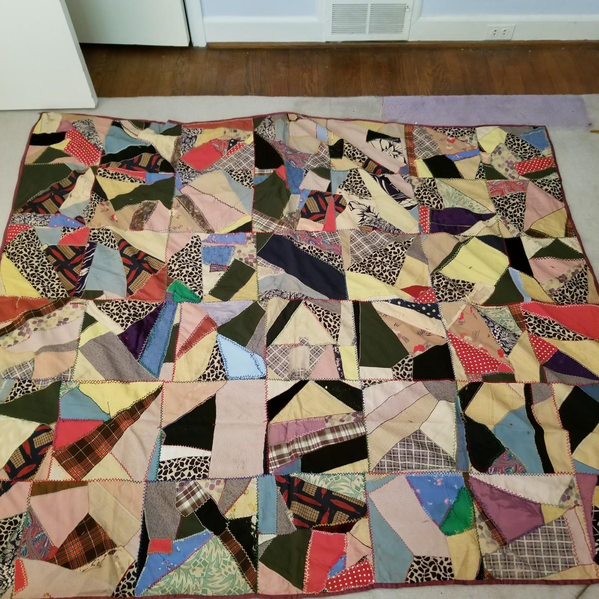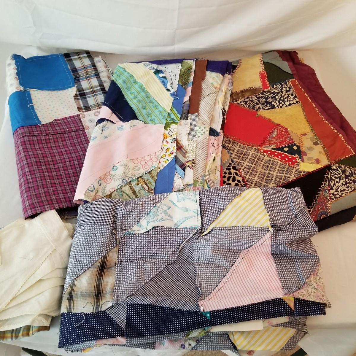 One finished and three unfinished quilts and tops. The finished piece, 'Crazy Quilt' style, has a maroon satin back and measures 74" x 62". The other three pieces are completed tops that need finishing. Purple crosslines, 84" x 74". Diagonal pattern is 83" x 73". And the square pattern is 70" x 82". One traditional basket style quilt top, 72" x72".  One triangular pieced shawl or wall hanger, 48"x25". See photos for detail.  Shipping available.