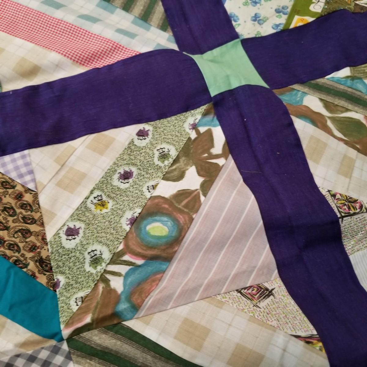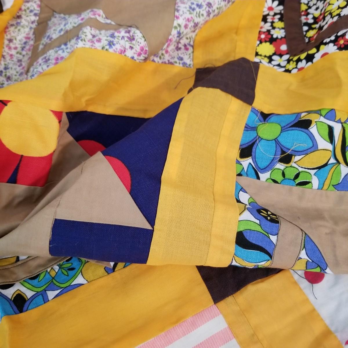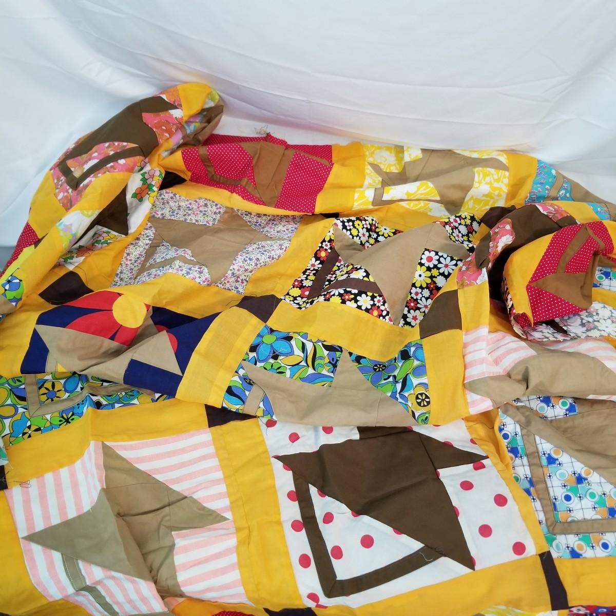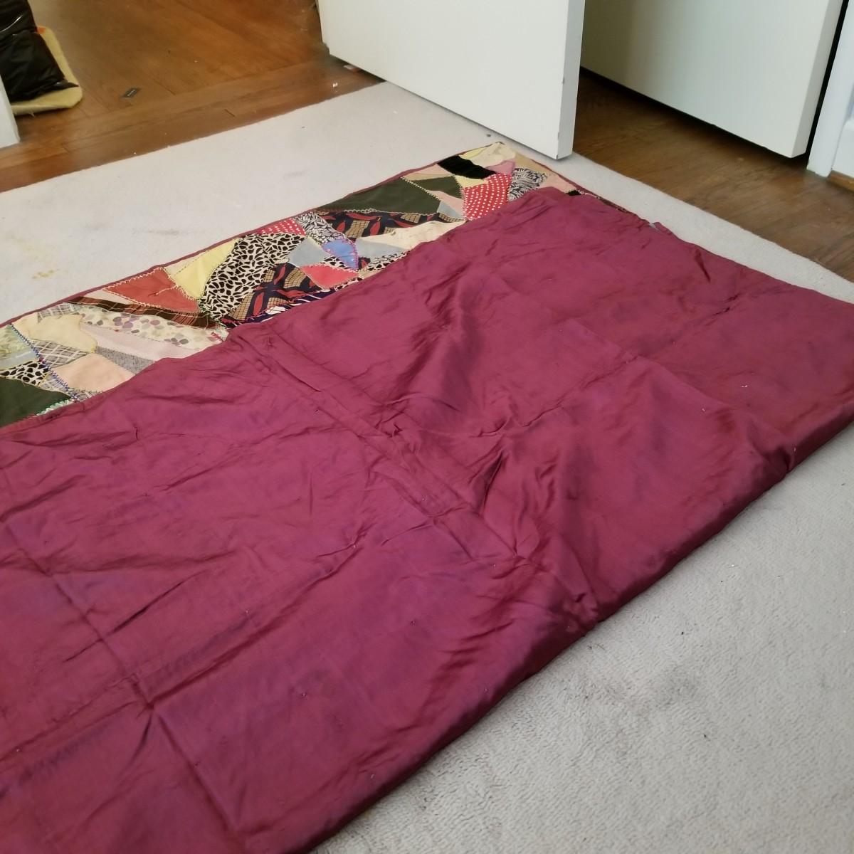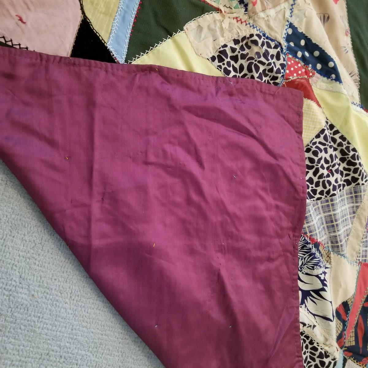 One finished and three unfinished quilts and tops. The finished piece, 'Crazy Quilt' style, has a maroon satin back and measures 74" x 62". The other three pieces are completed tops that need finishing. Purple crosslines, 84" x 74". Diagonal pattern is 83" x 73". And the square pattern is 70" x 82". One traditional basket style quilt top, 72" x72".  One triangular pieced shawl or wall hanger, 48"x25". See photos for detail.  Shipping available.