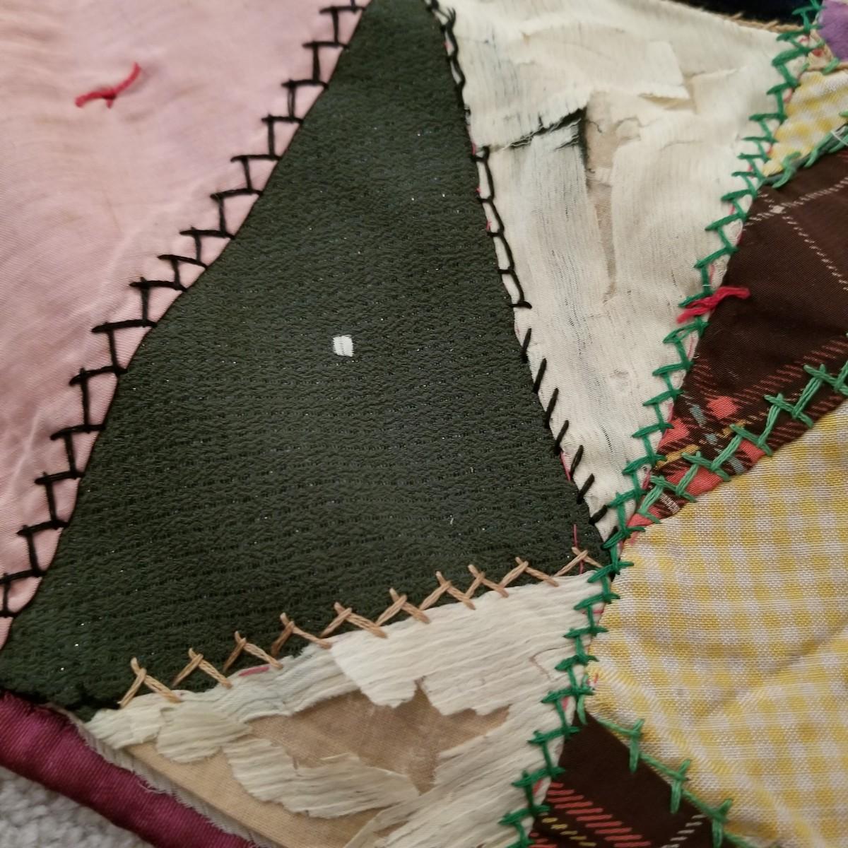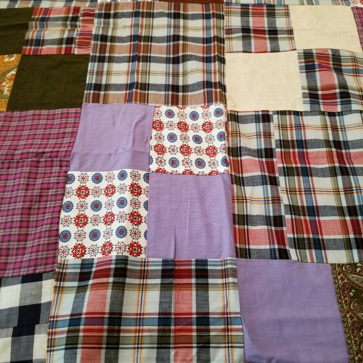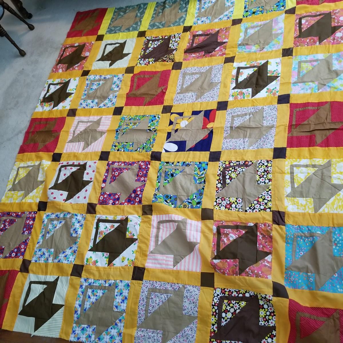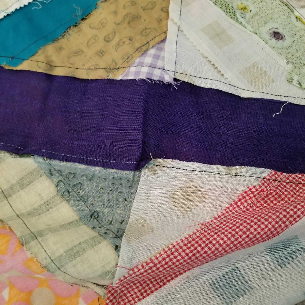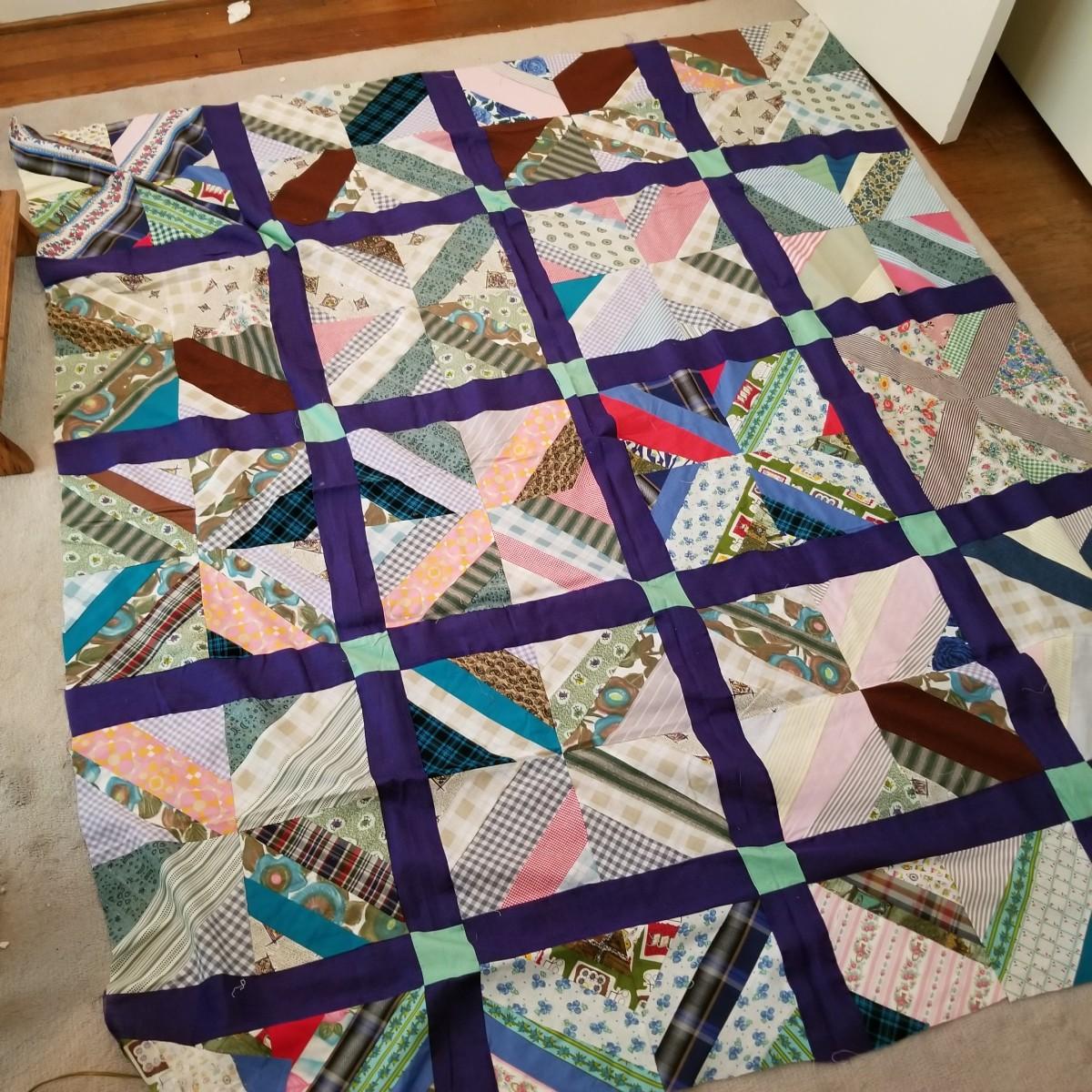 One finished and three unfinished quilts and tops. The finished piece, 'Crazy Quilt' style, has a maroon satin back and measures 74" x 62". The other three pieces are completed tops that need finishing. Purple crosslines, 84" x 74". Diagonal pattern is 83" x 73". And the square pattern is 70" x 82". One traditional basket style quilt top, 72" x72".  One triangular pieced shawl or wall hanger, 48"x25". See photos for detail.  Shipping available.