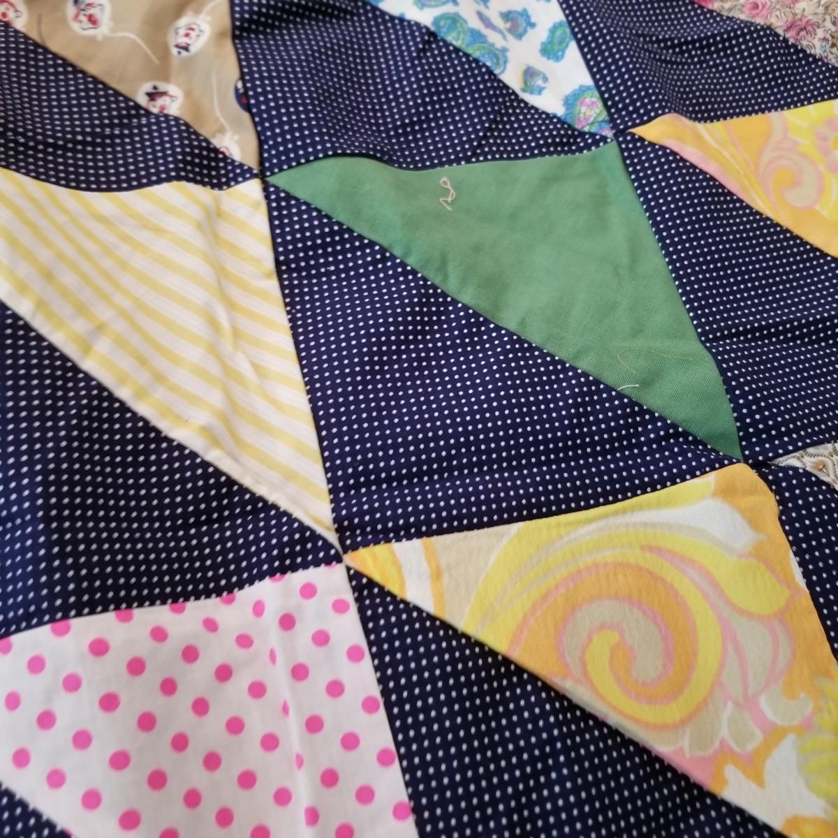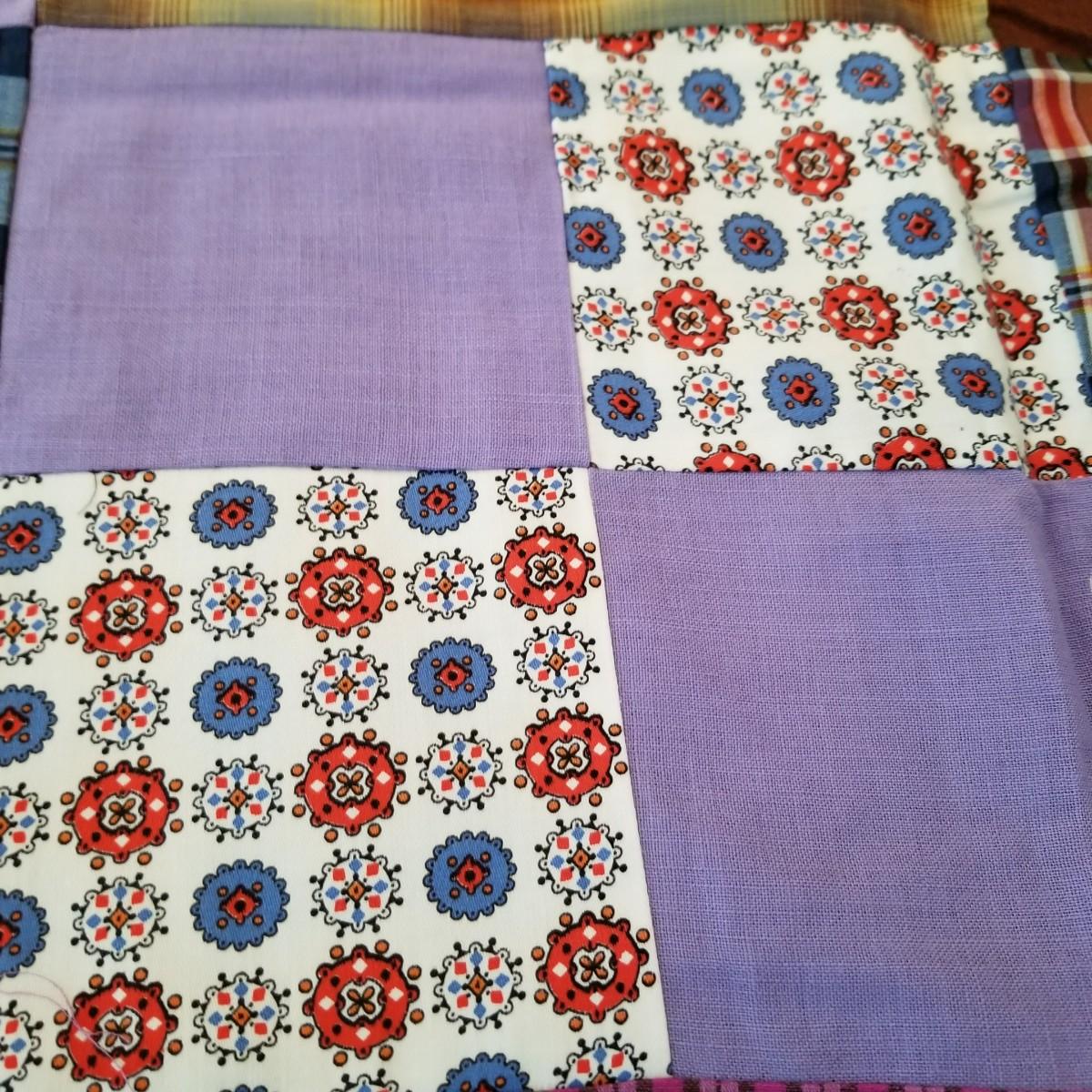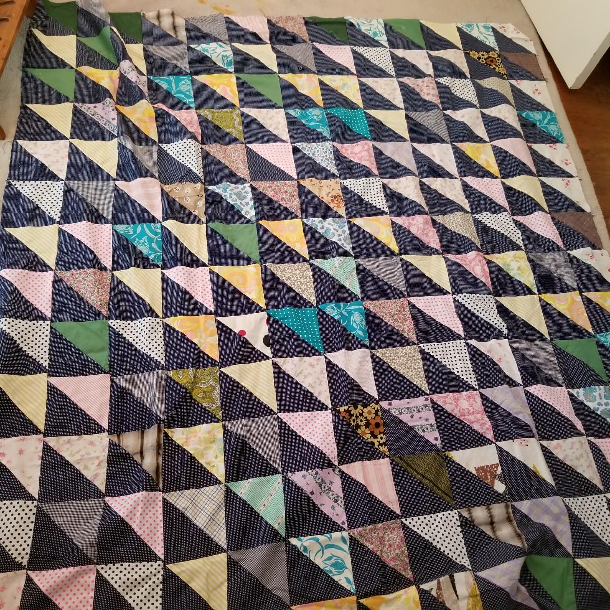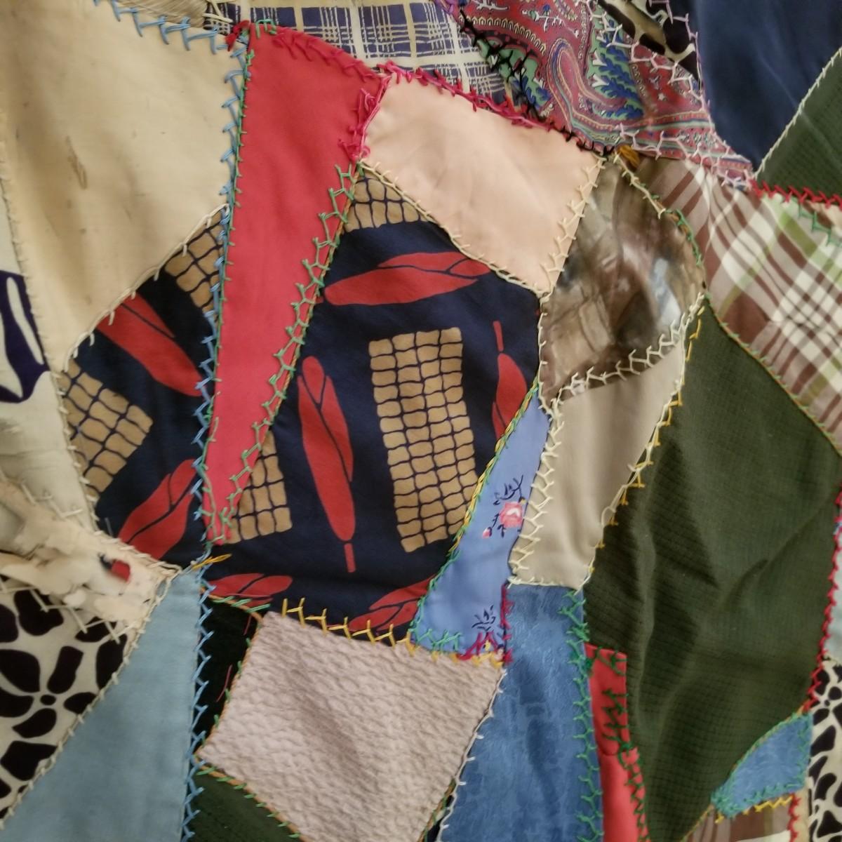 One finished and three unfinished quilts and tops. The finished piece, 'Crazy Quilt' style, has a maroon satin back and measures 74" x 62". The other three pieces are completed tops that need finishing. Purple crosslines, 84" x 74". Diagonal pattern is 83" x 73". And the square pattern is 70" x 82". One traditional basket style quilt top, 72" x72".  One triangular pieced shawl or wall hanger, 48"x25". See photos for detail.  Shipping available.