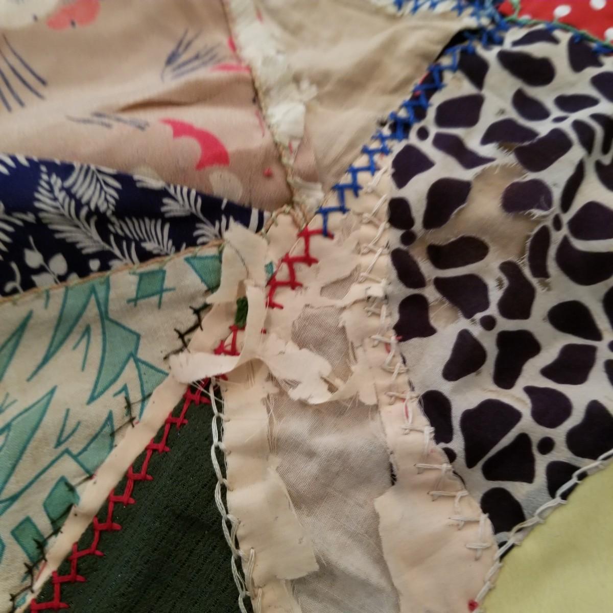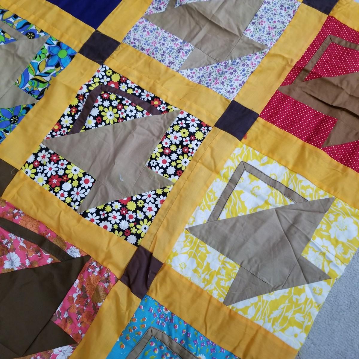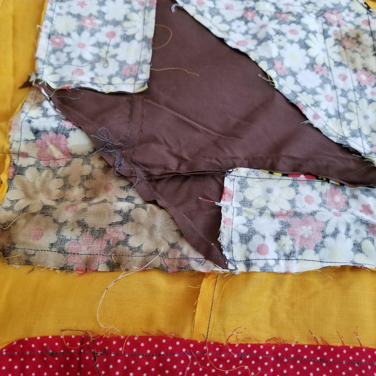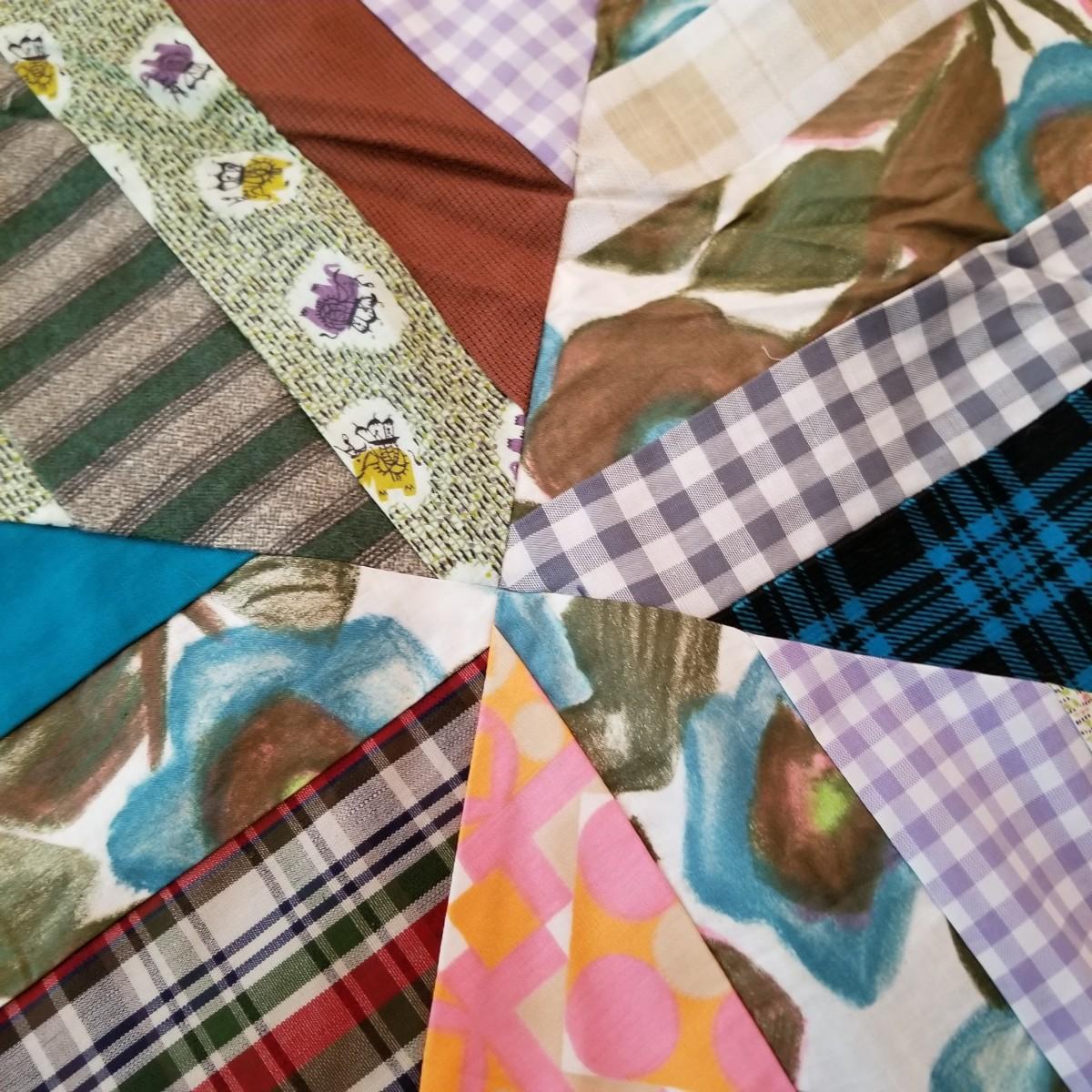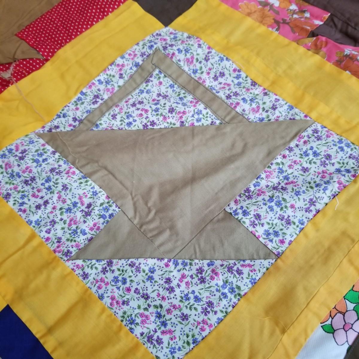 One finished and three unfinished quilts and tops. The finished piece, 'Crazy Quilt' style, has a maroon satin back and measures 74" x 62". The other three pieces are completed tops that need finishing. Purple crosslines, 84" x 74". Diagonal pattern is 83" x 73". And the square pattern is 70" x 82". One traditional basket style quilt top, 72" x72".  One triangular pieced shawl or wall hanger, 48"x25". See photos for detail.  Shipping available.