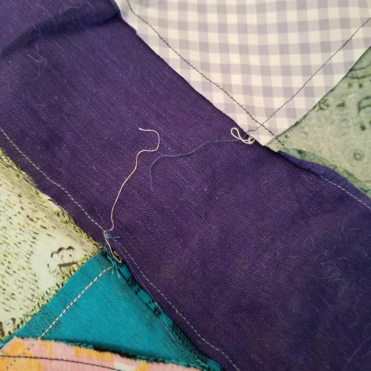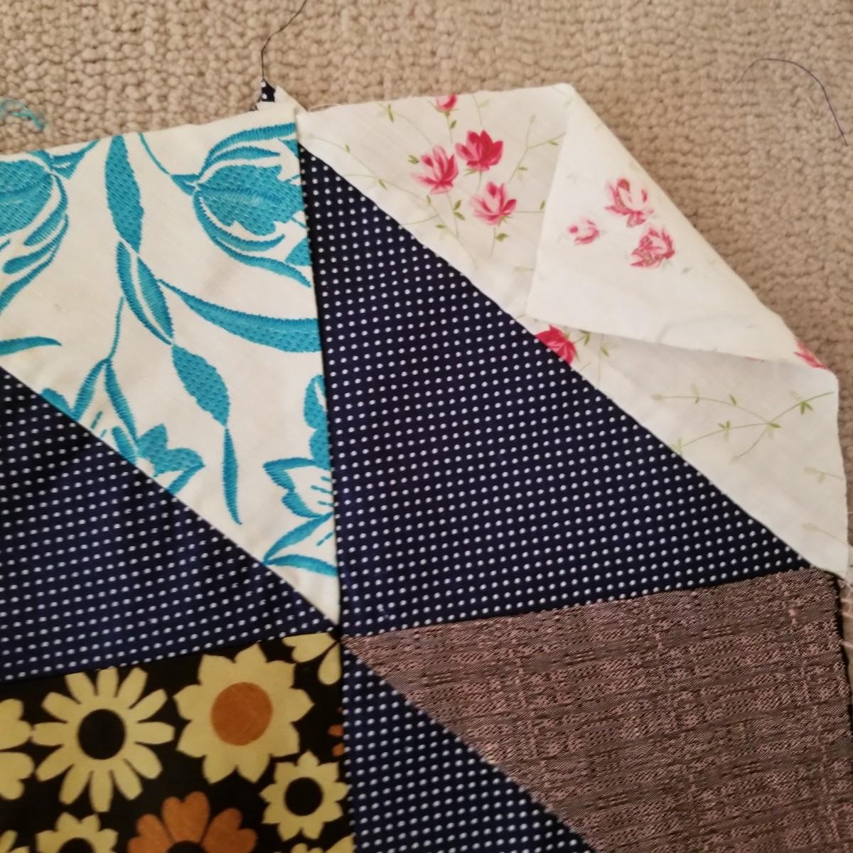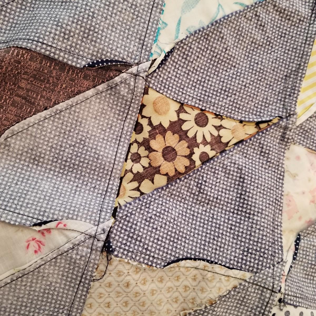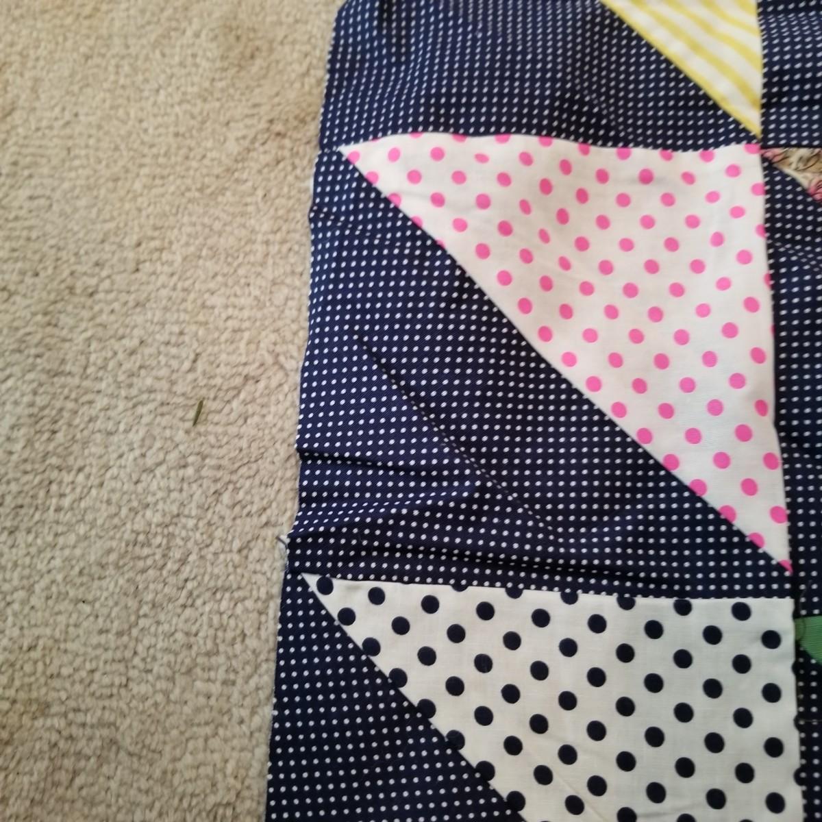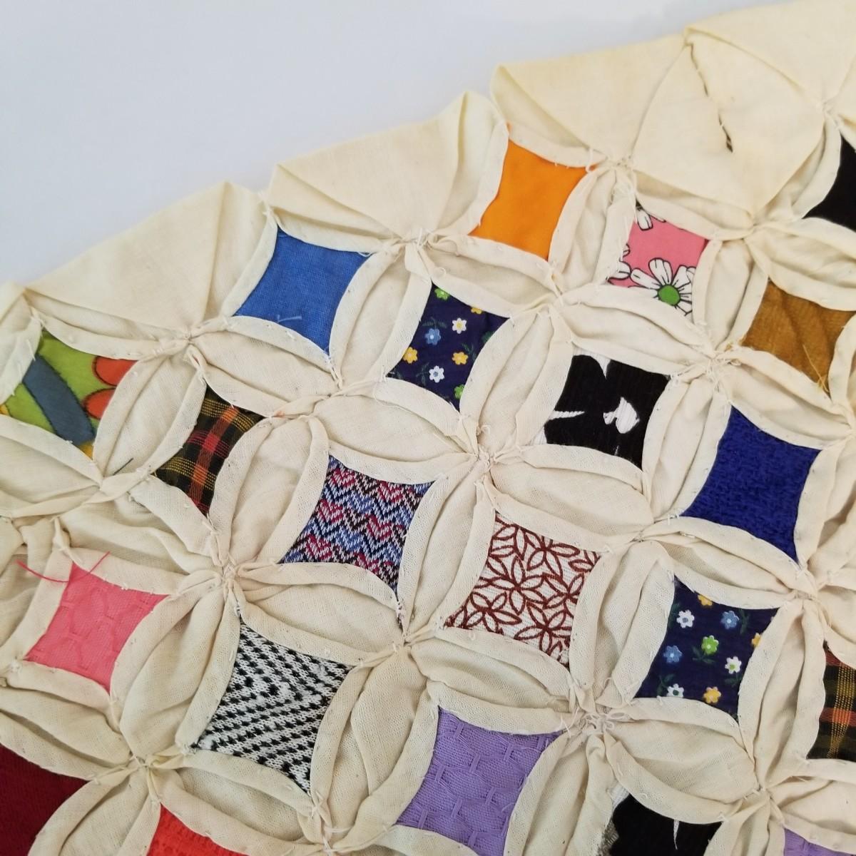 One finished and three unfinished quilts and tops. The finished piece, 'Crazy Quilt' style, has a maroon satin back and measures 74" x 62". The other three pieces are completed tops that need finishing. Purple crosslines, 84" x 74". Diagonal pattern is 83" x 73". And the square pattern is 70" x 82". One traditional basket style quilt top, 72" x72".  One triangular pieced shawl or wall hanger, 48"x25". See photos for detail.  Shipping available.