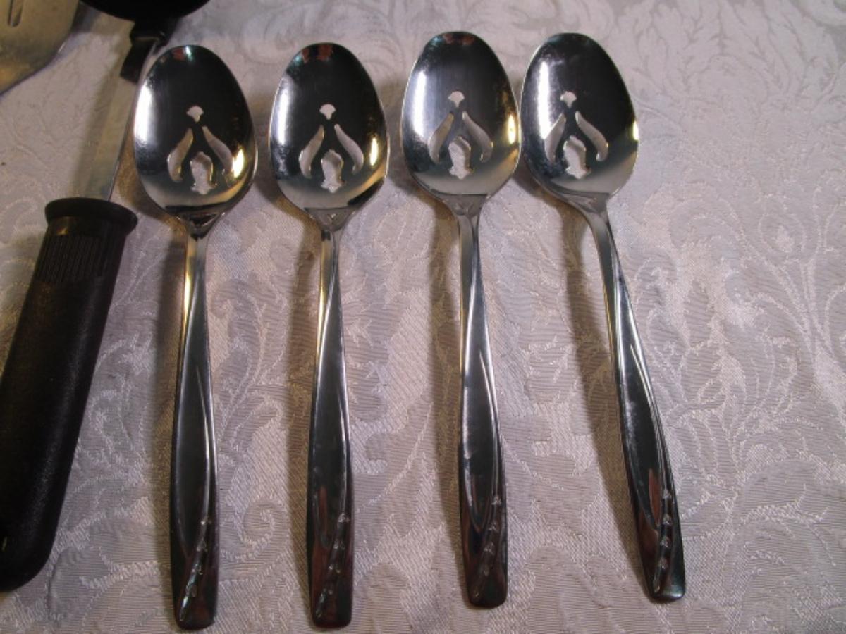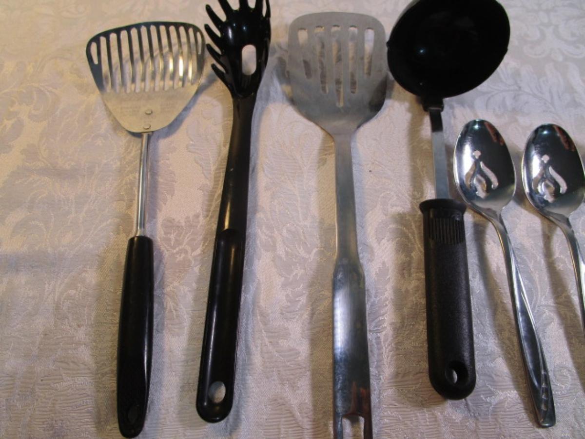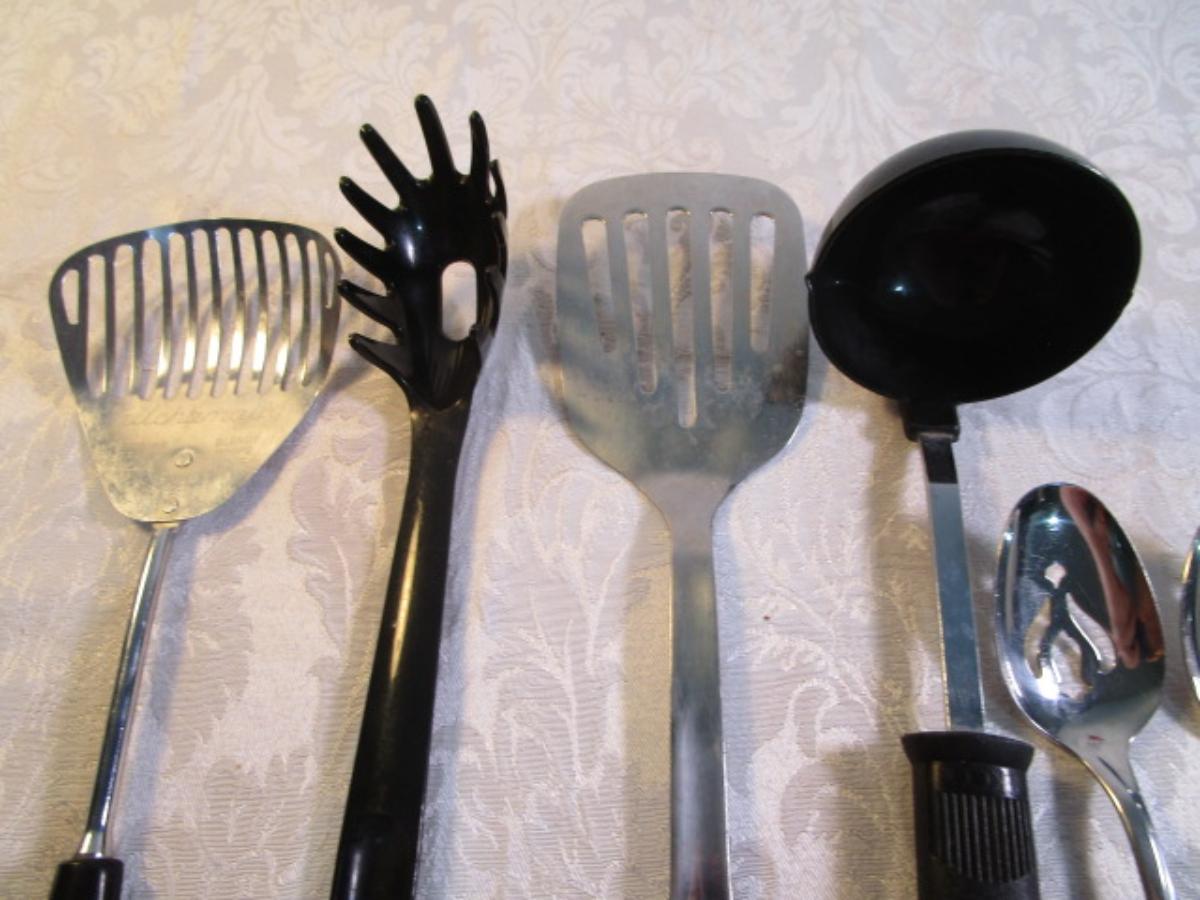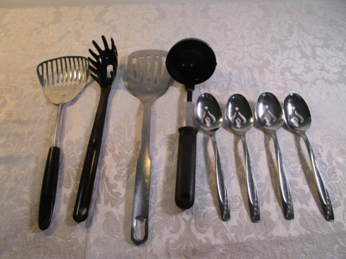 4 Vintage serving spoons, ladle, metal spatula, strainer, spaghetti spoon