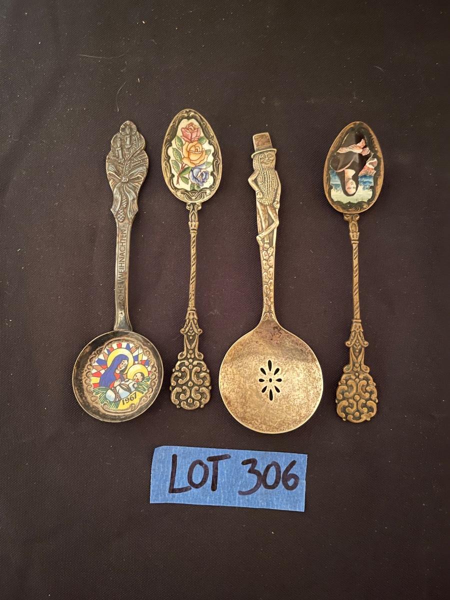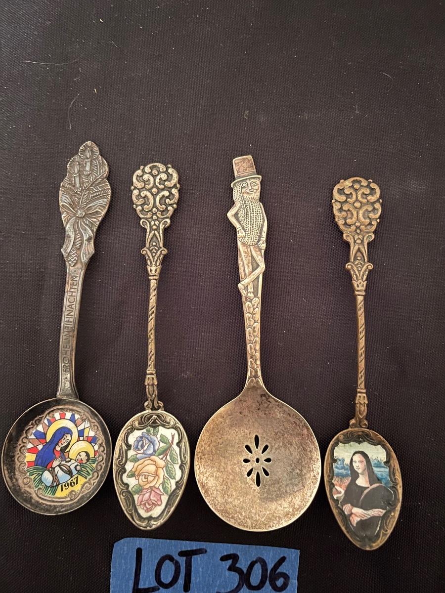 1967 "Frohe Weinachten Germany", floral etched spoon, mr.peanut darlton silver plate, slorakia mona lisa etched spoon.