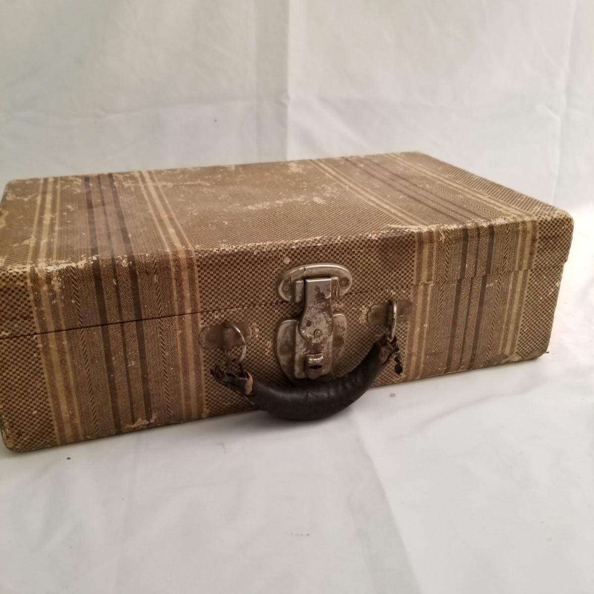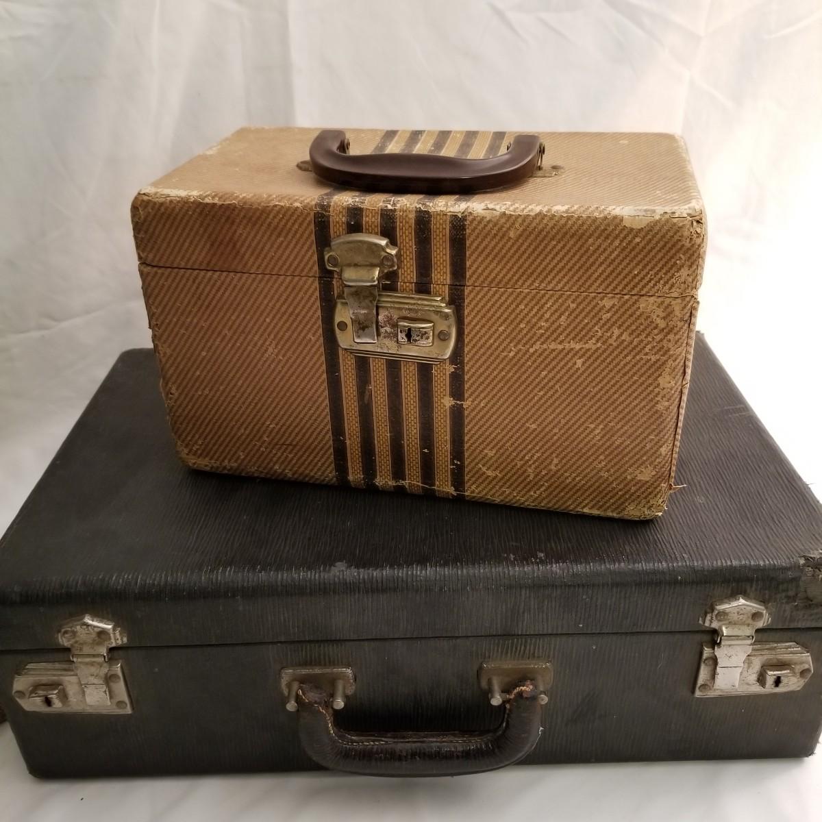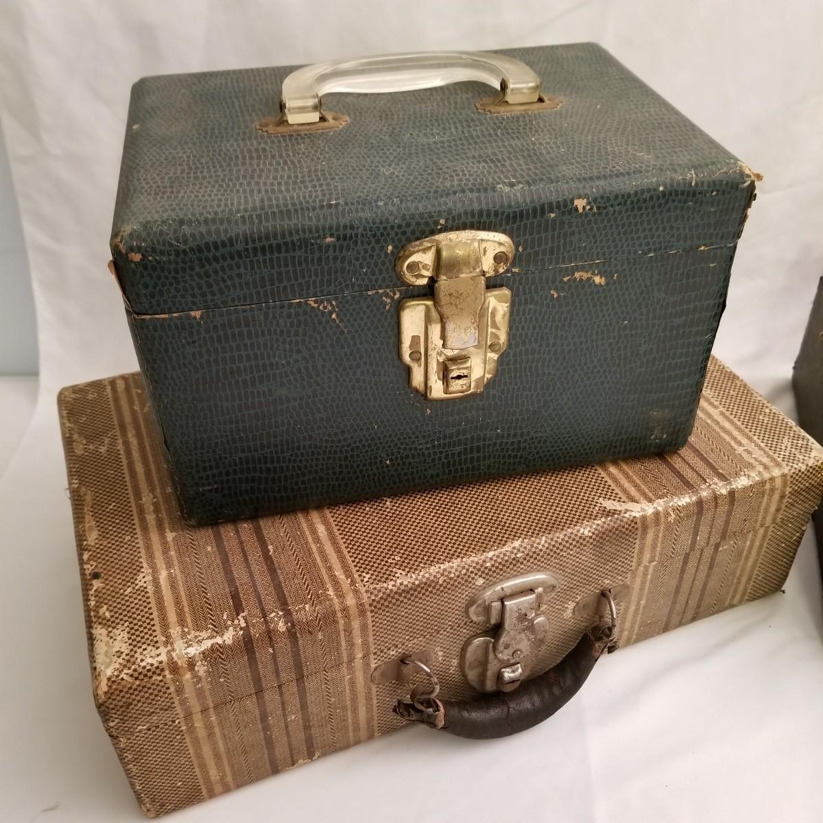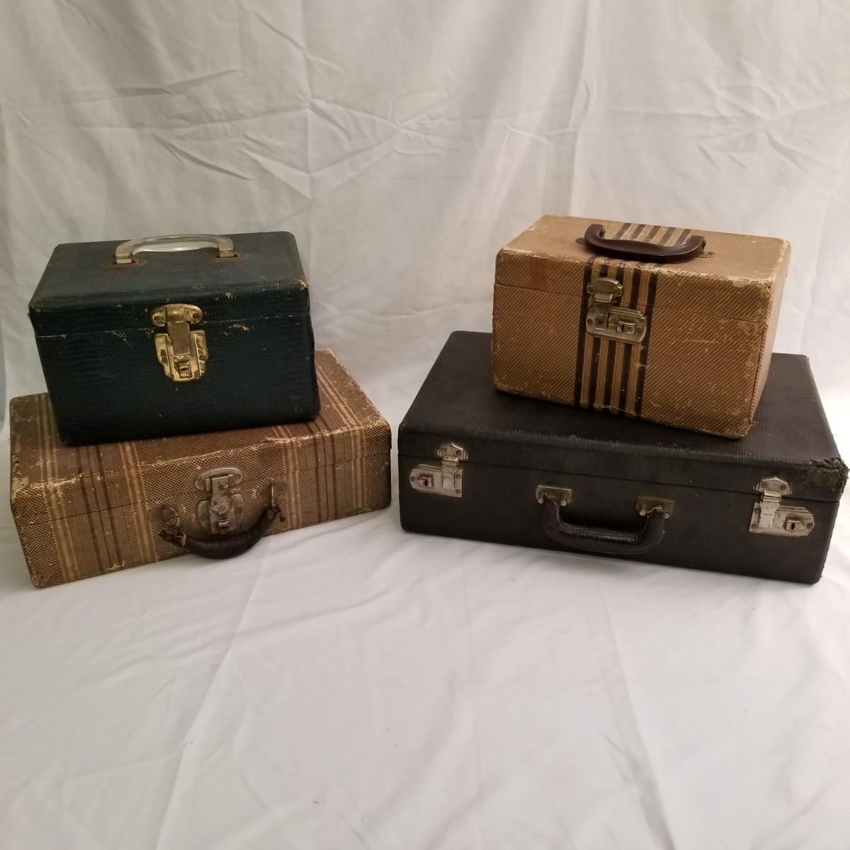 A quartet of smaller suitcase/travel cases. Well worn and used these would make great display pieces for vintage items. Largest black case is 18" x12" x5.5". All handles intact and all latches work, but no keys. See photos for details. Shipping available.