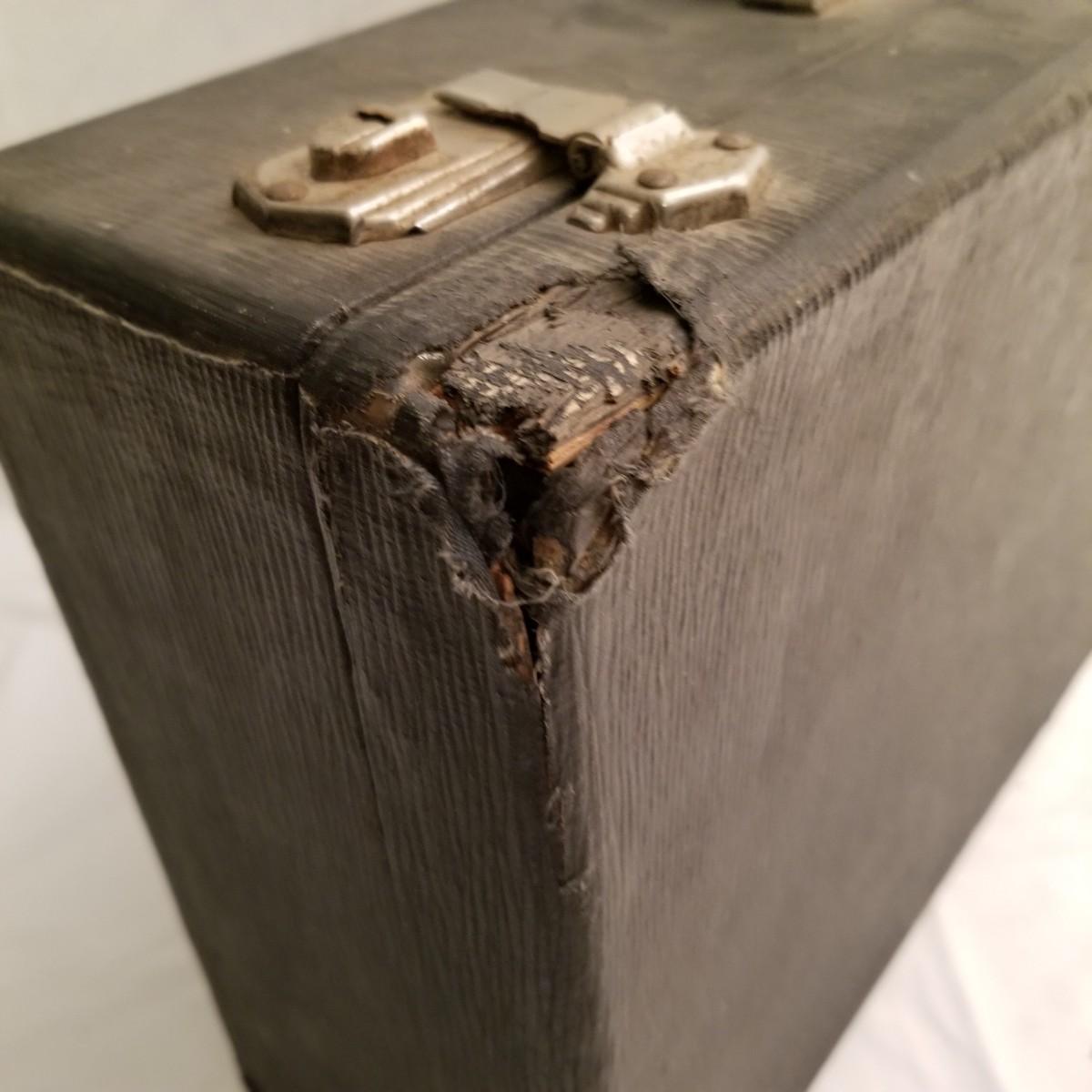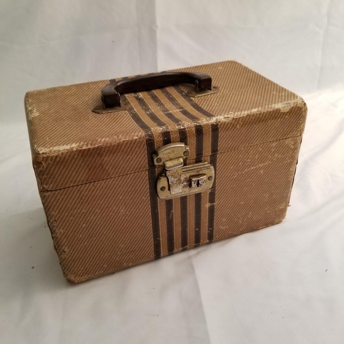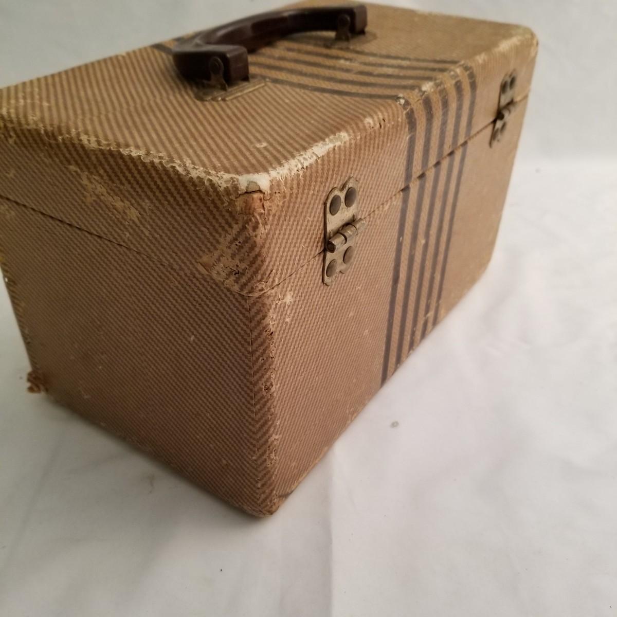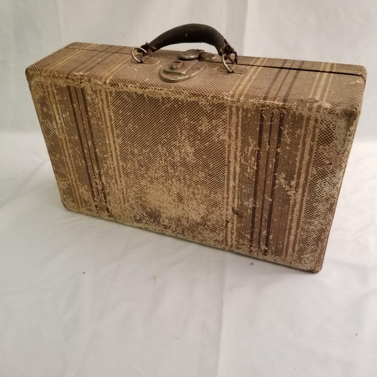 A quartet of smaller suitcase/travel cases. Well worn and used these would make great display pieces for vintage items. Largest black case is 18" x12" x5.5". All handles intact and all latches work, but no keys. See photos for details. Shipping available.