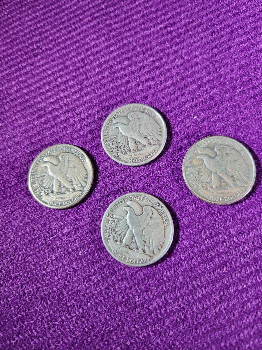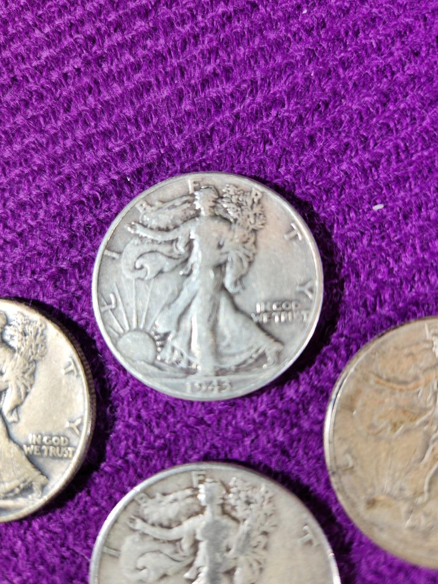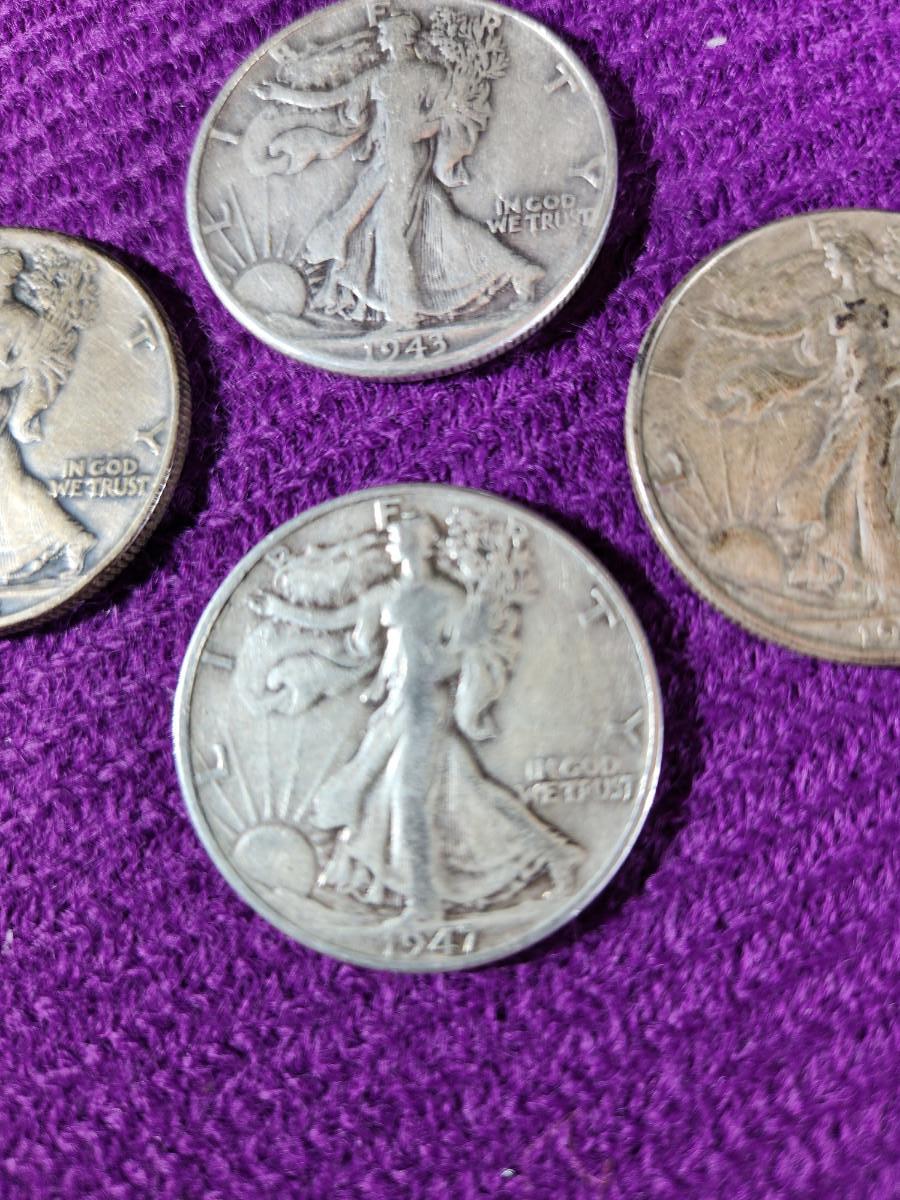 This auction lot is for 4 Walking Liberty Half Dollars. One is a 1942, another is a 1943, and the remaining two coins are dated 1947. The coins are 90% Silver. See photos for condition.